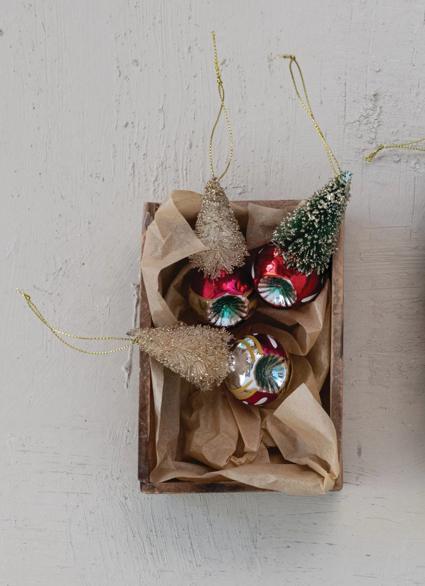 4"H Mercury Glass Ball Witch's Eye Ornament w/ Sisal Bottle Brush Tree & Glitter, Multi Color, 3 Styles