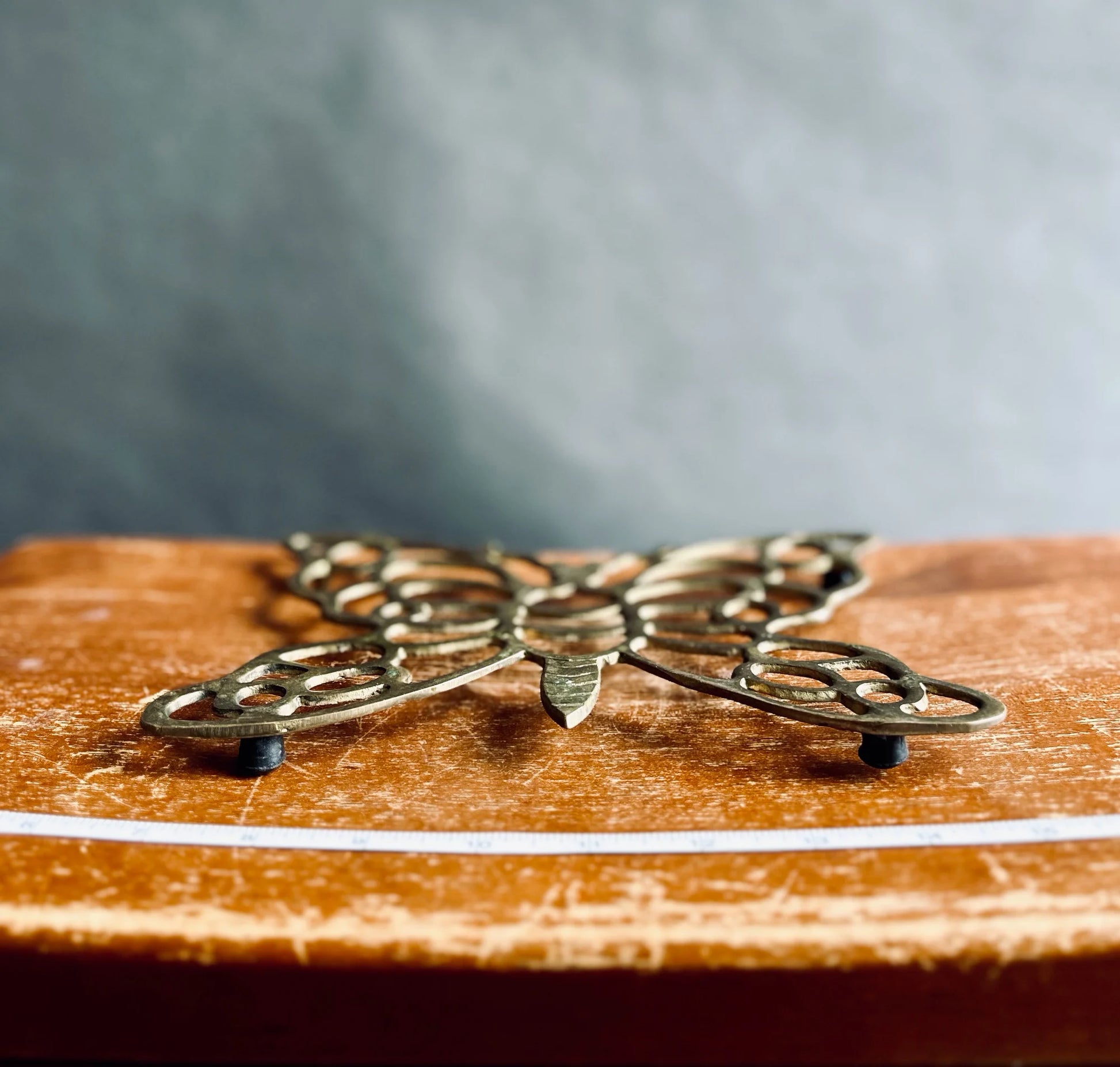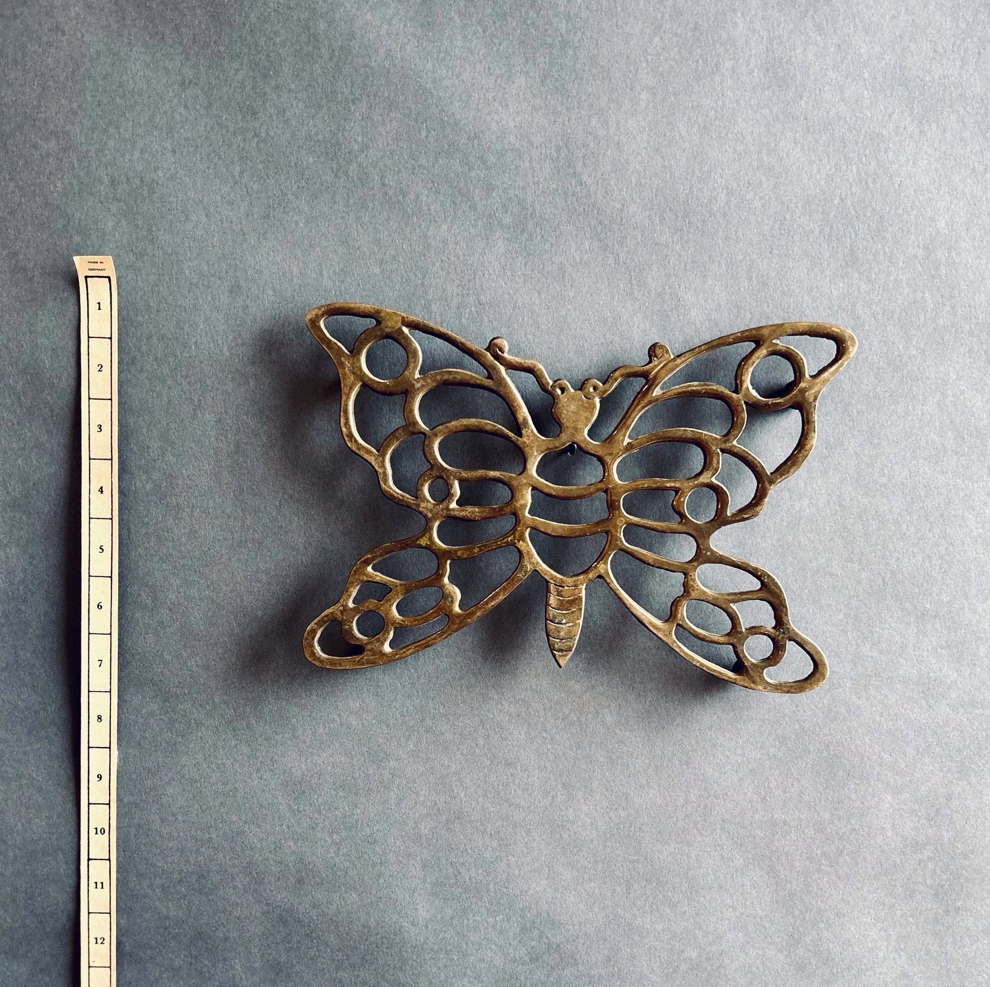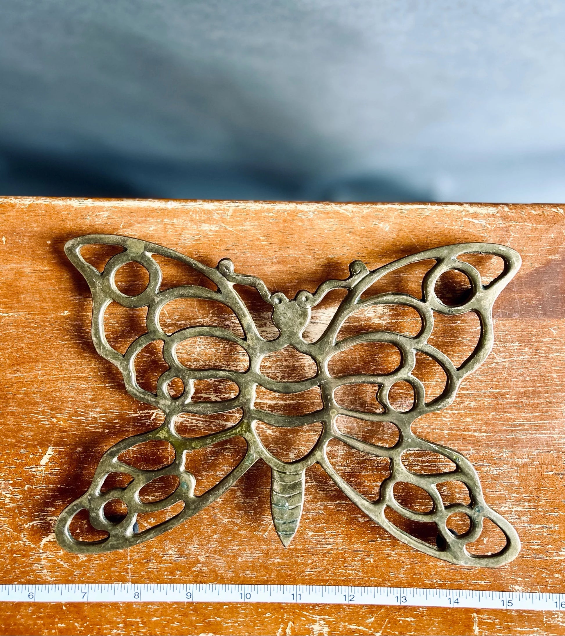 Beautifully vintage brass butterfly that is also fully functional for setting your freshly cooked chicken nuggets pan on. It will look great in your kitchen!