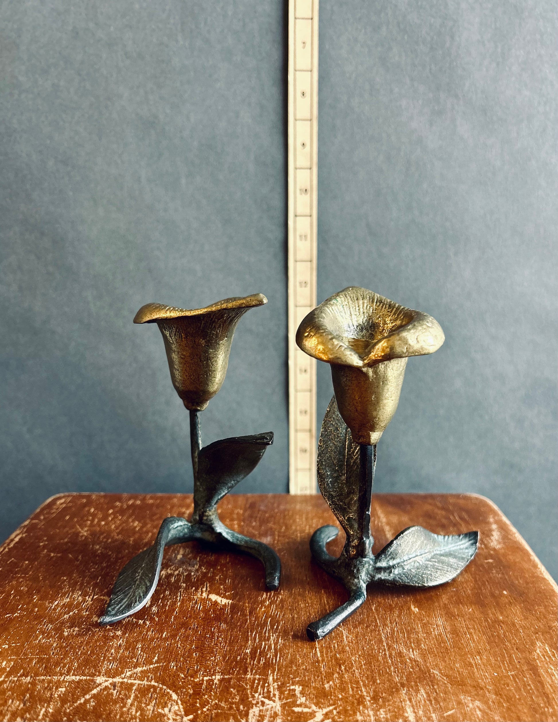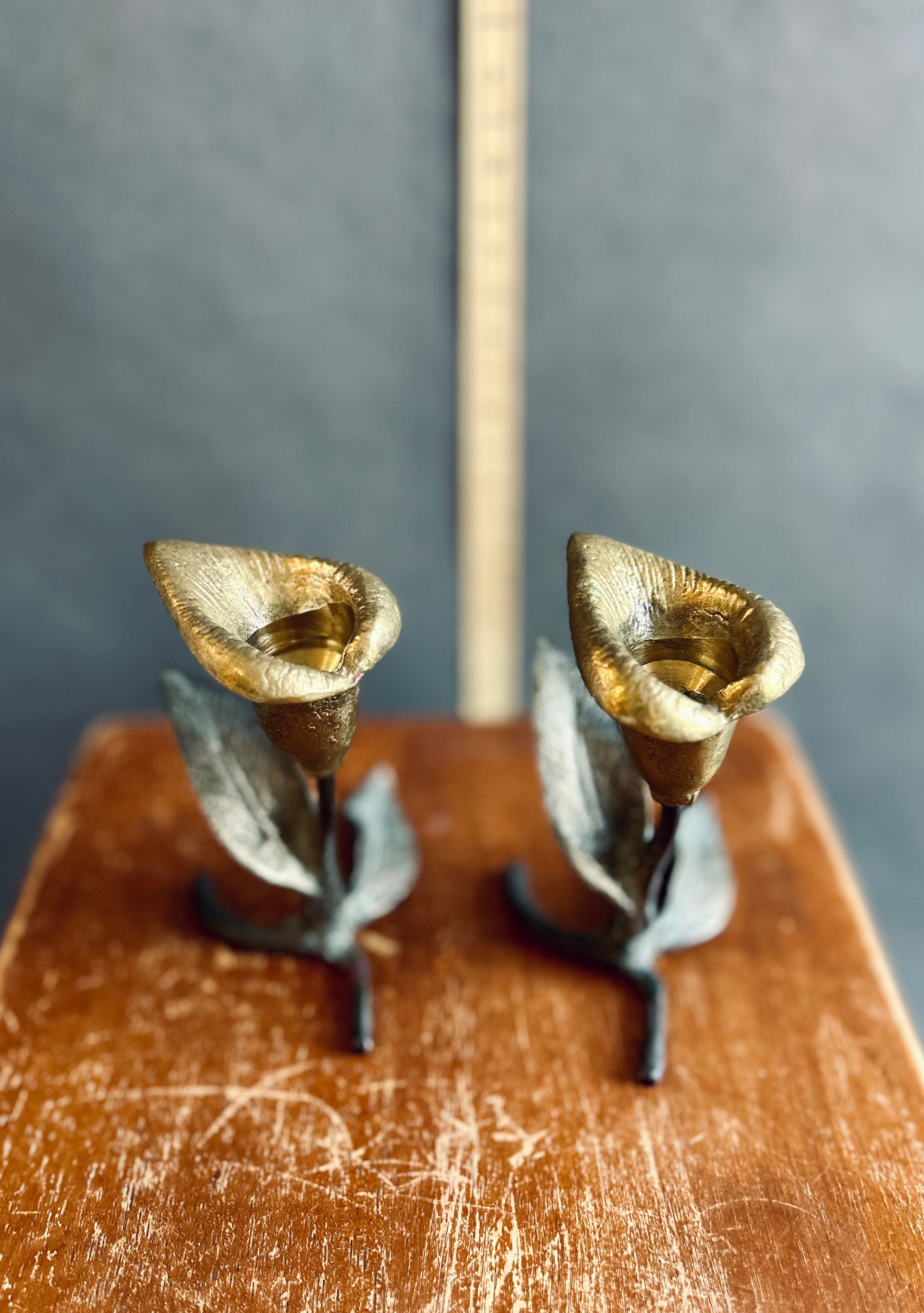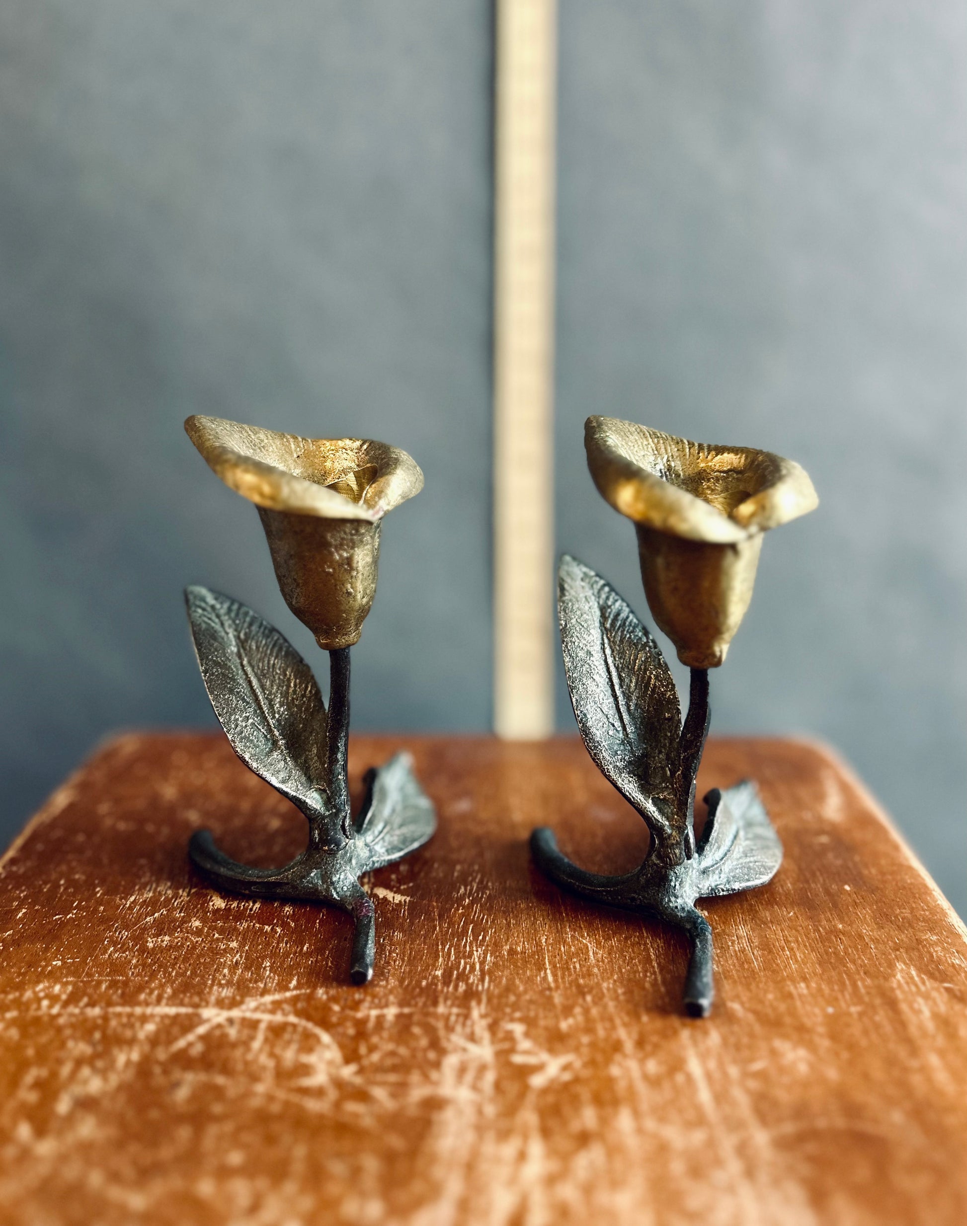 antique pair of iron work taper candle holders, calla Lilly blooms have a gold finish