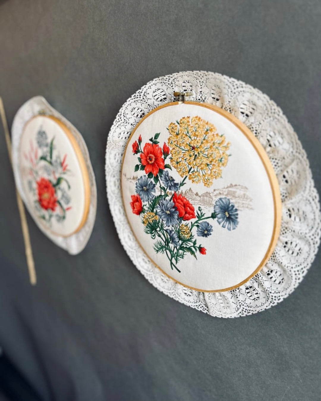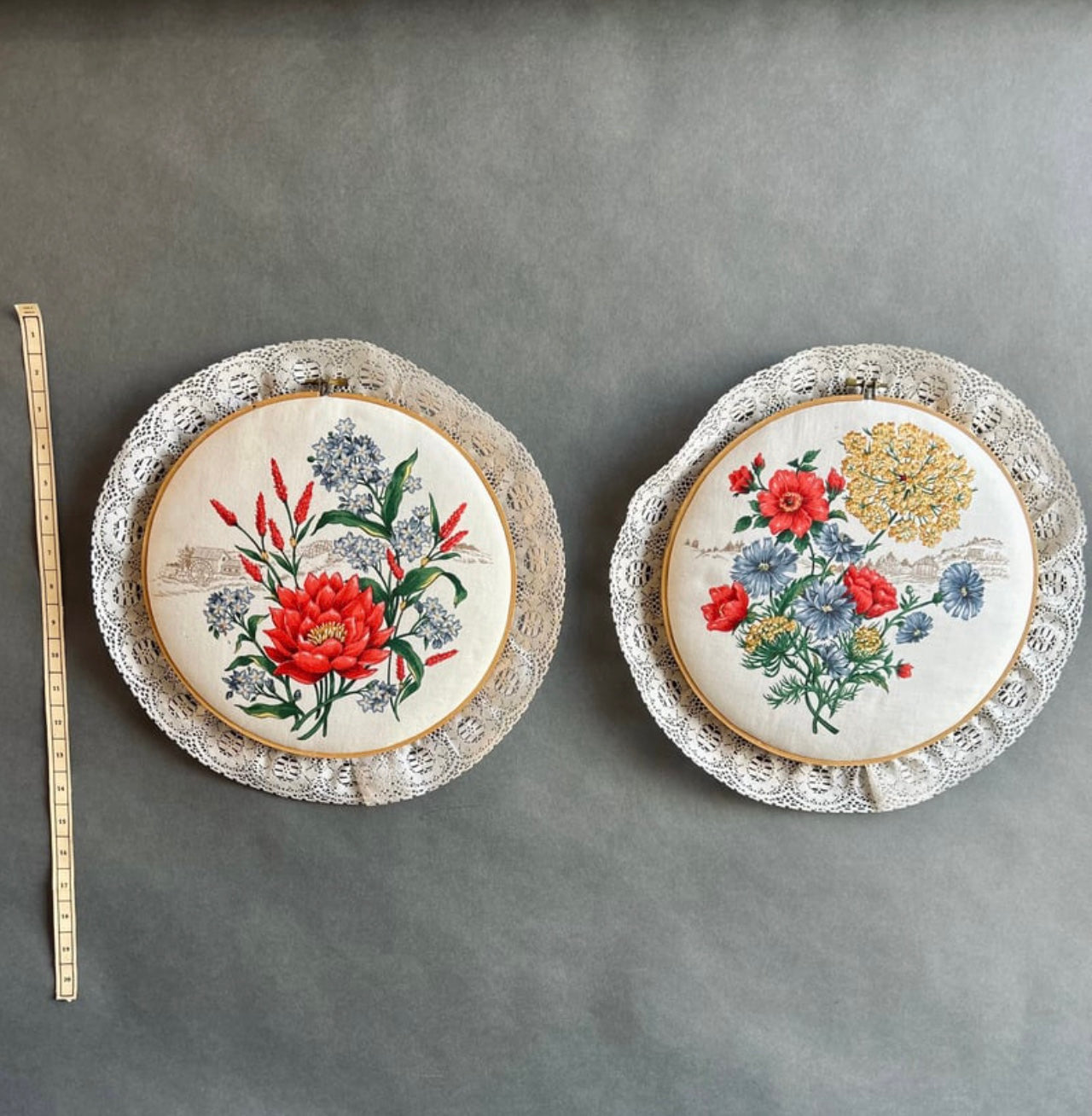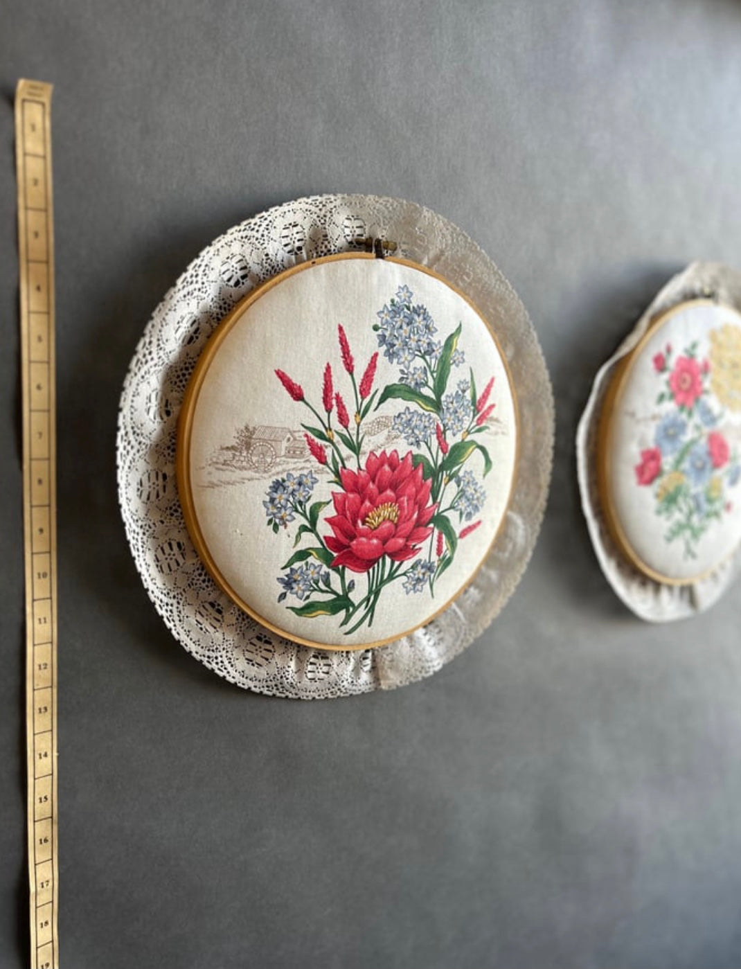 Adorable pair of vintage embroidery hoops embellished with lace and floral cotton print
