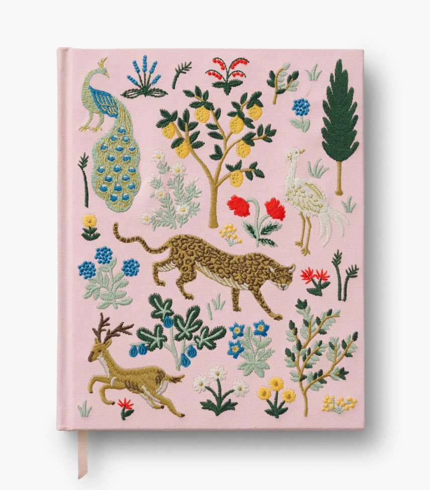 This embroidered sketchbook is a large, hardcover journal with 108 unlined pages of thick paper perfect for sketching, drawing, and journaling.