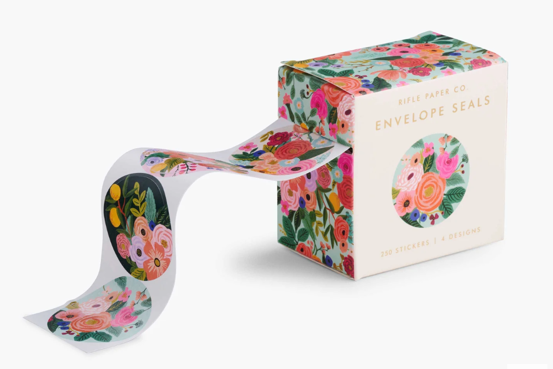 Add a pretty accent to your correspondence with our illustrated adhesive envelope seals, featuring our Garden Party design. Each roll of 250 seals is packaged in an easy to use box with a dispensing slot.