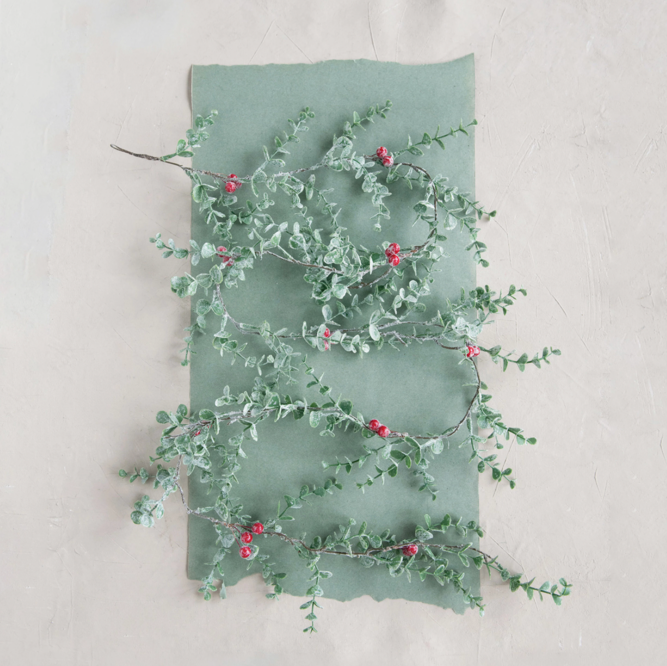 This garland is a beautiful addition to any festive home. Made out of plastic, this faux boxwood garland has red berries spread throughout. This garland can be used on staircases, mantles, or trees for a festive display and adds a natural piece to any room.