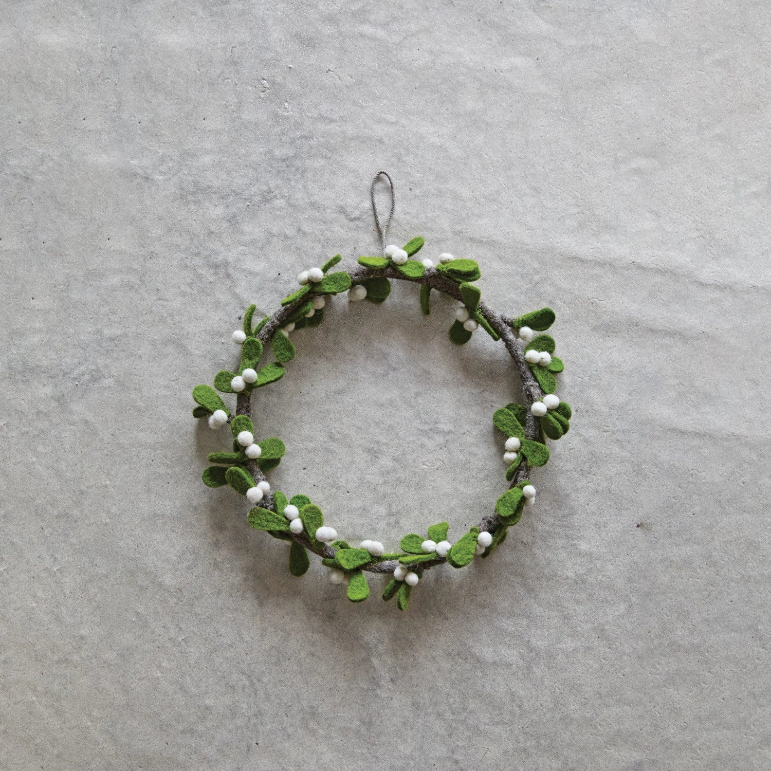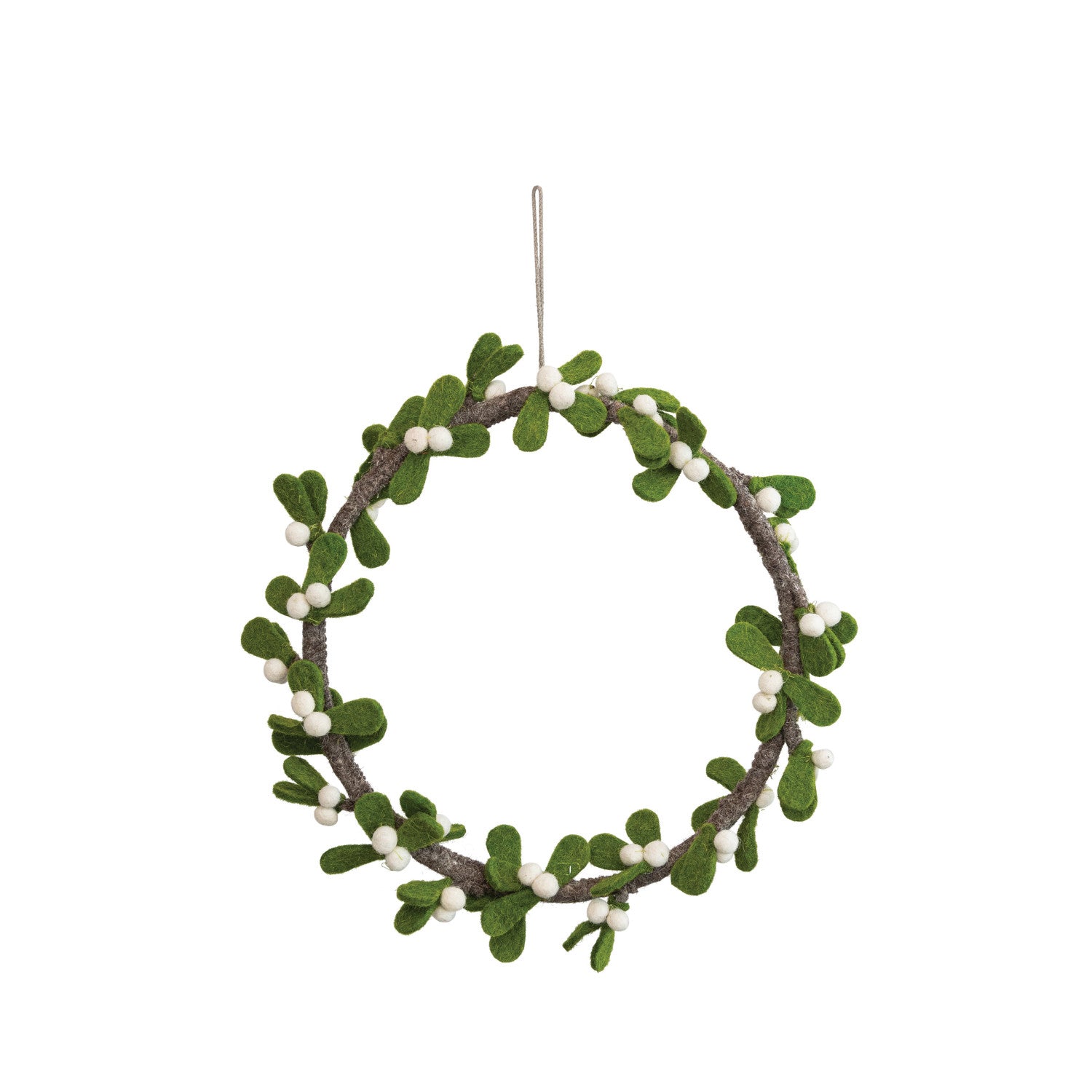 10" Round Handmade Wool Felt Leaf & Berry Wreath, Green & Cream Color