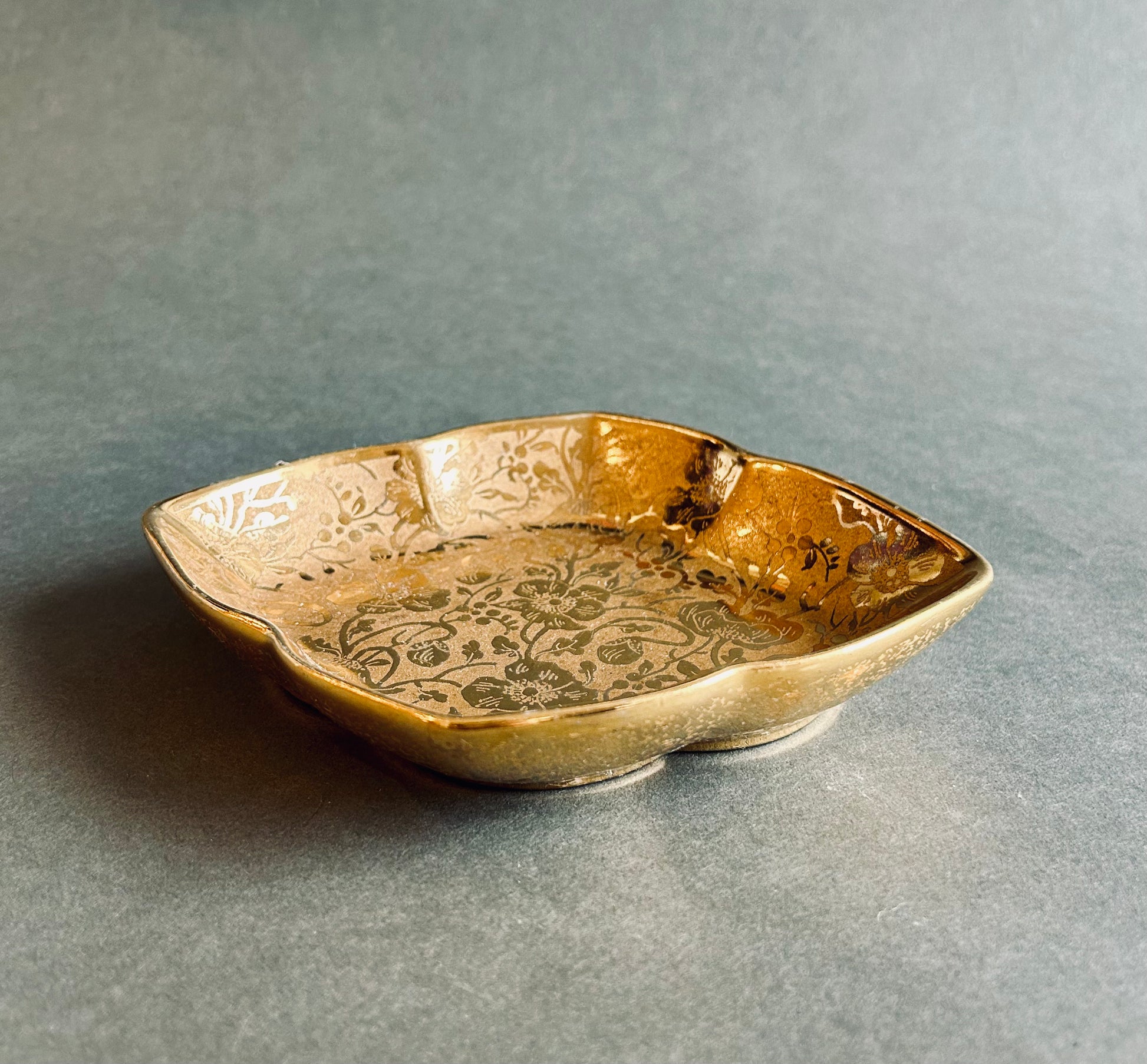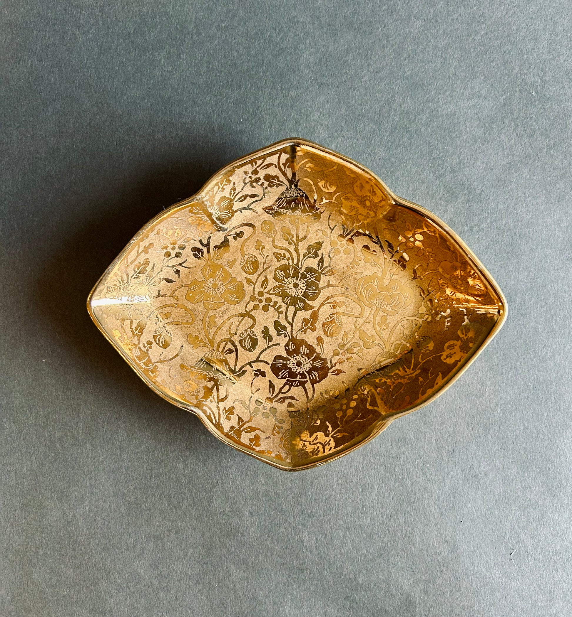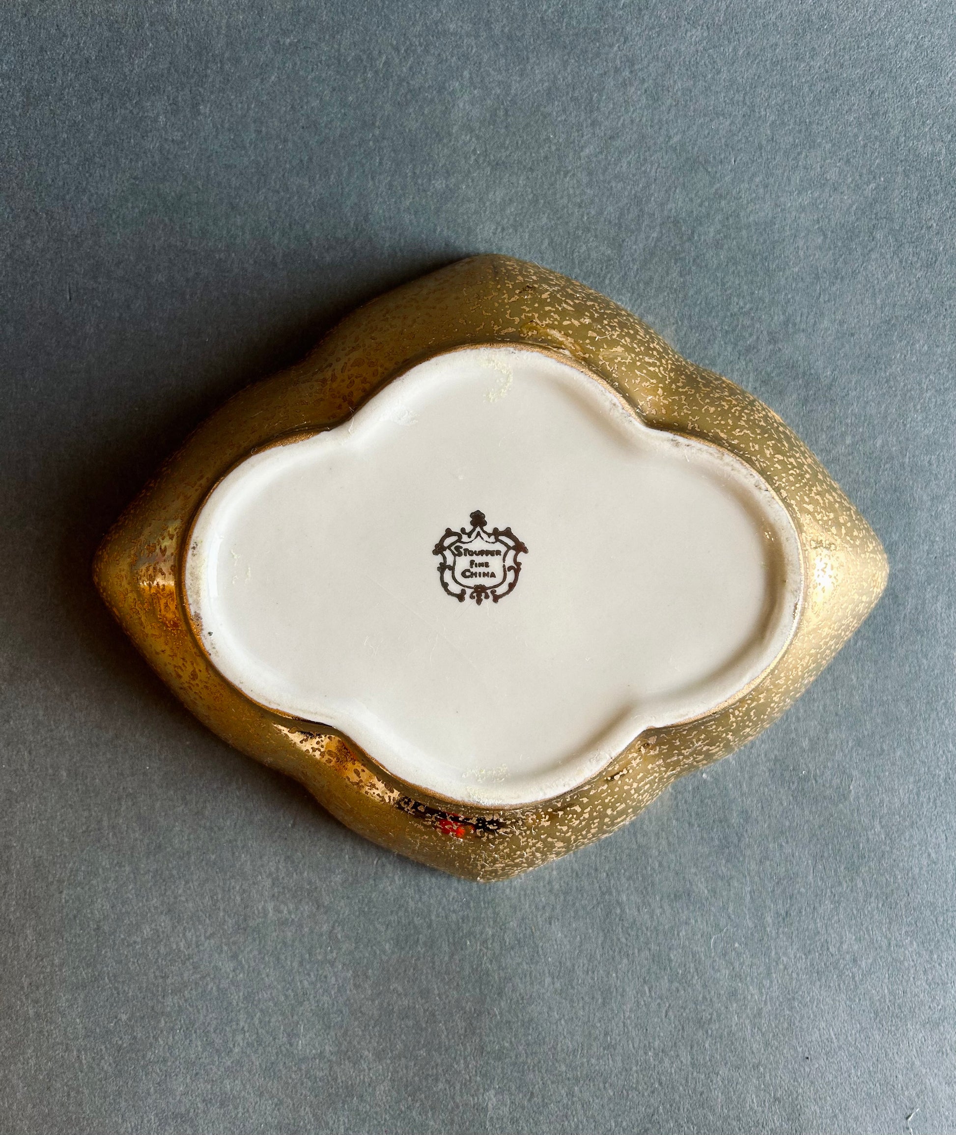 Measuring 7”x5.5” this gold plated floral embossed Stouffer fine china dish is estimated to be from the 50’s/60’s. A very elegant way to catch all