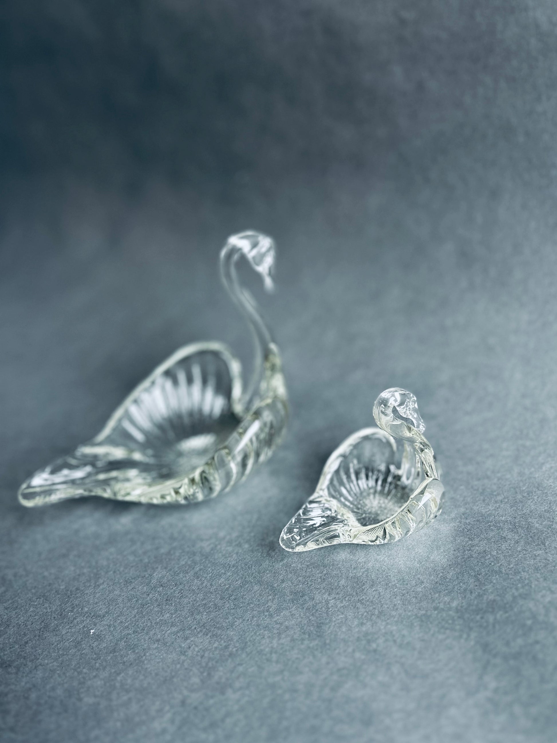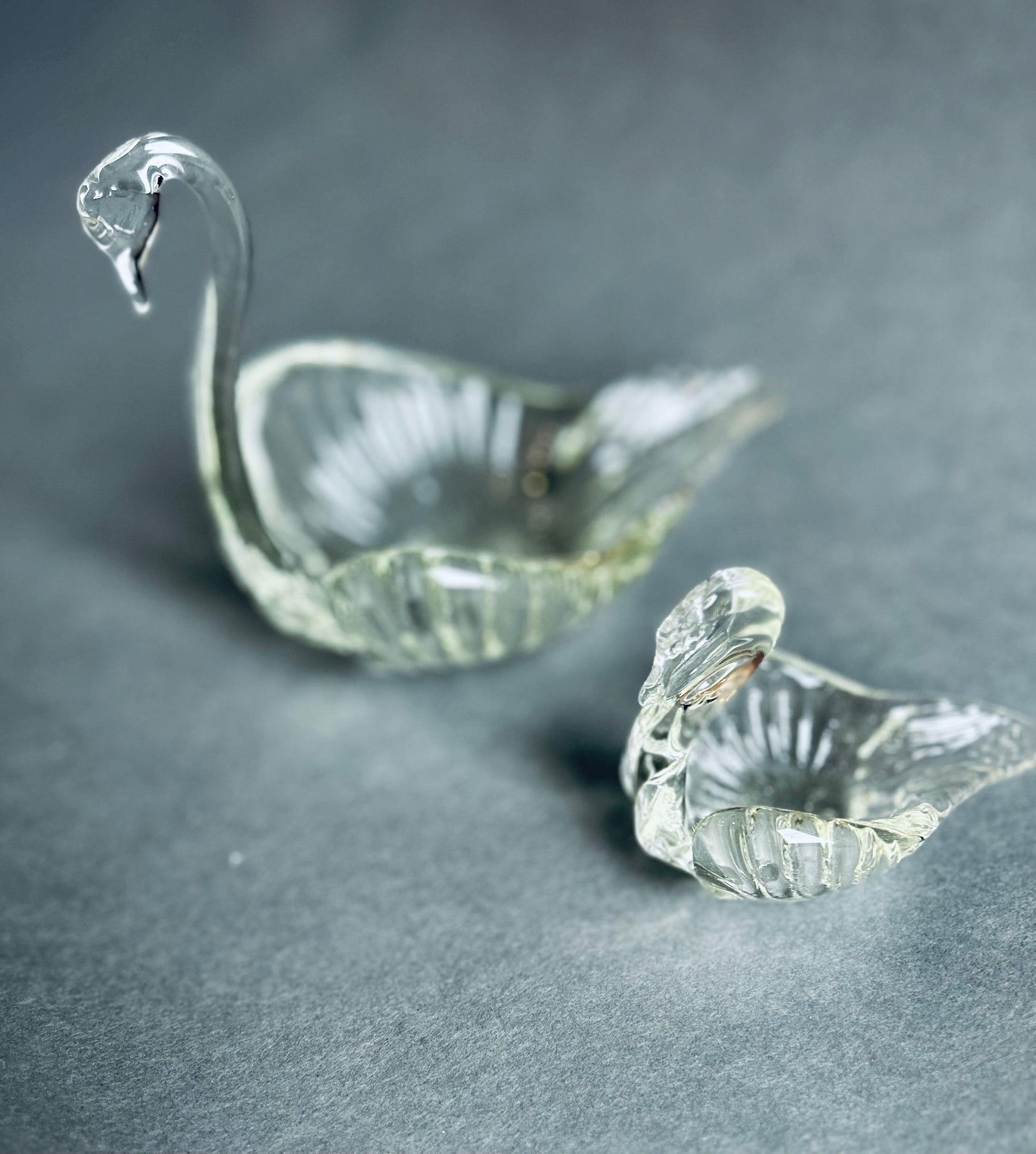 Matching 6”x6” and 3”x3” clear glass swan dishes that can nest into each other or used separately.