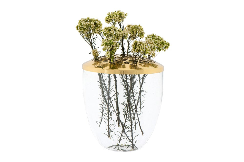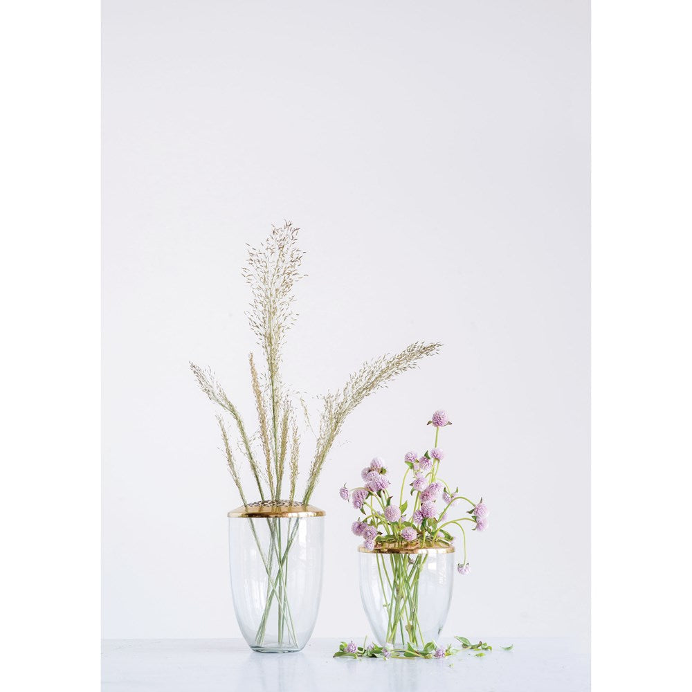 Pretty florist's glass vase, with metal frog lid in a brass finish, two sizes.