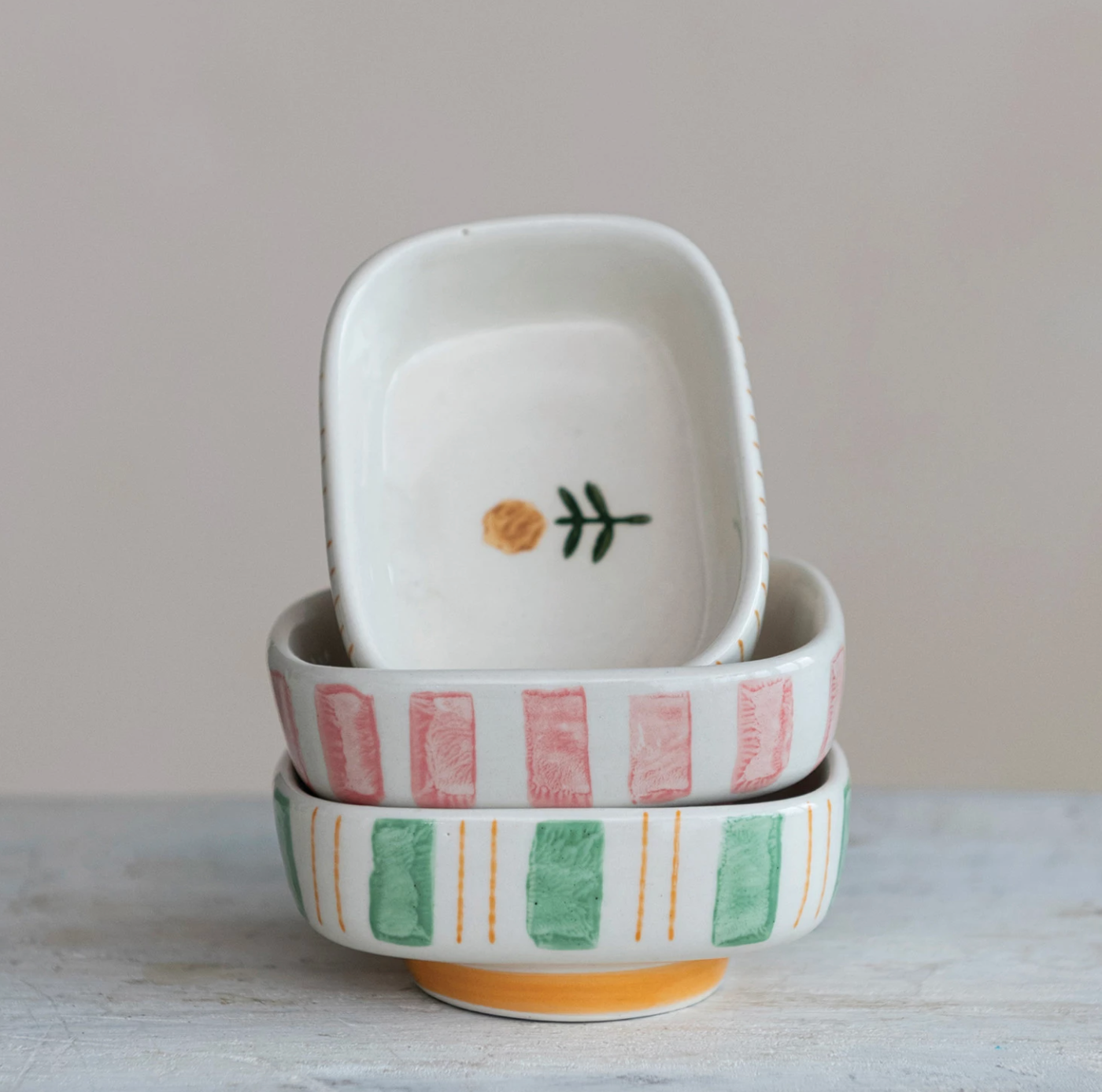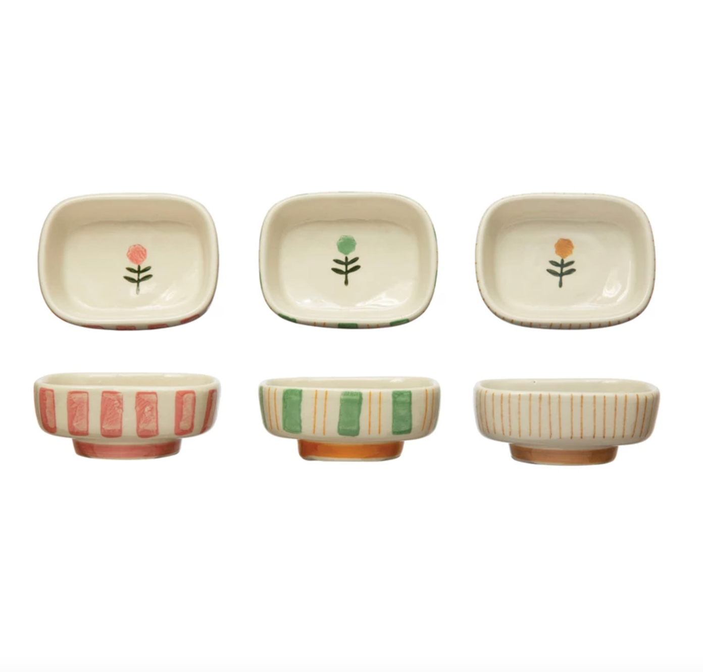 3-1/4"L x 2-1/2"W x 1-1/4"H Hand-Painted Stoneware Footed Dish w/ Stripes & Flower, Multi Color, 3 Styles