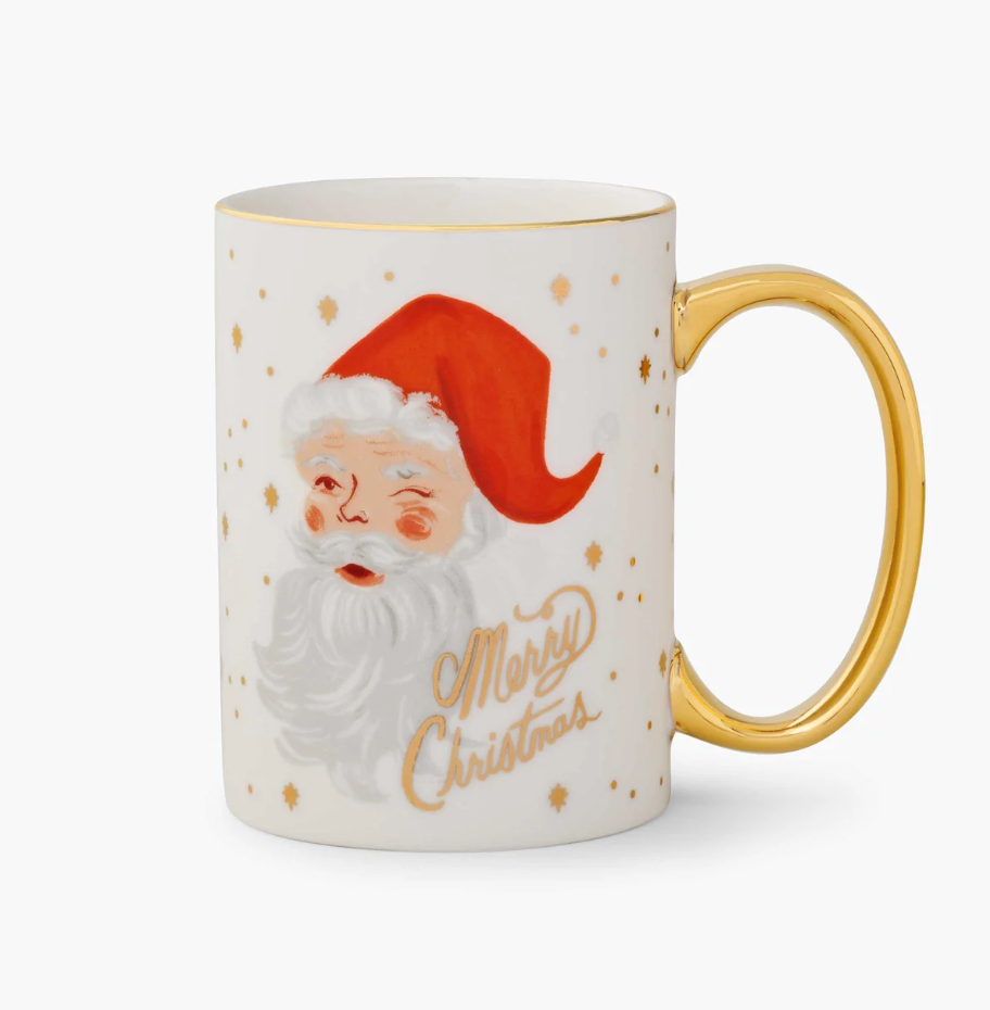 Add a visit from St. Nick to your morning coffee, with a twinkle in his eye and a cheeky wink. Our porcelain mugs feature illustrated designs and a gilded rim and handle to add a little something special to your favorite beverage.