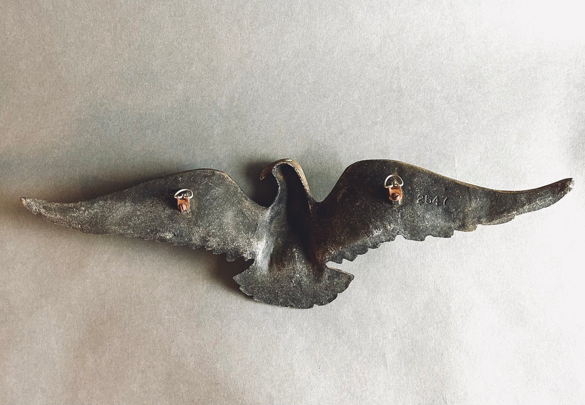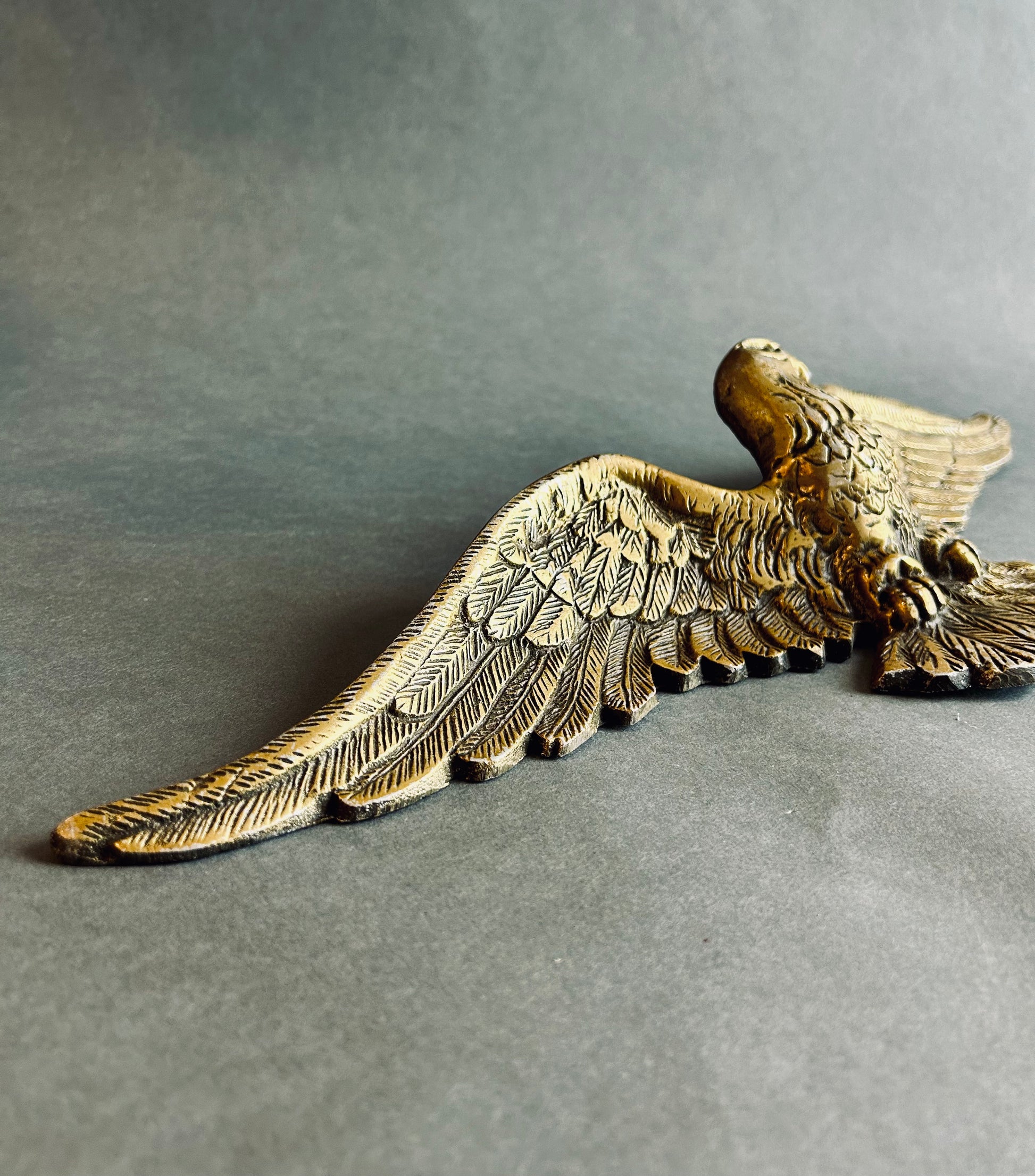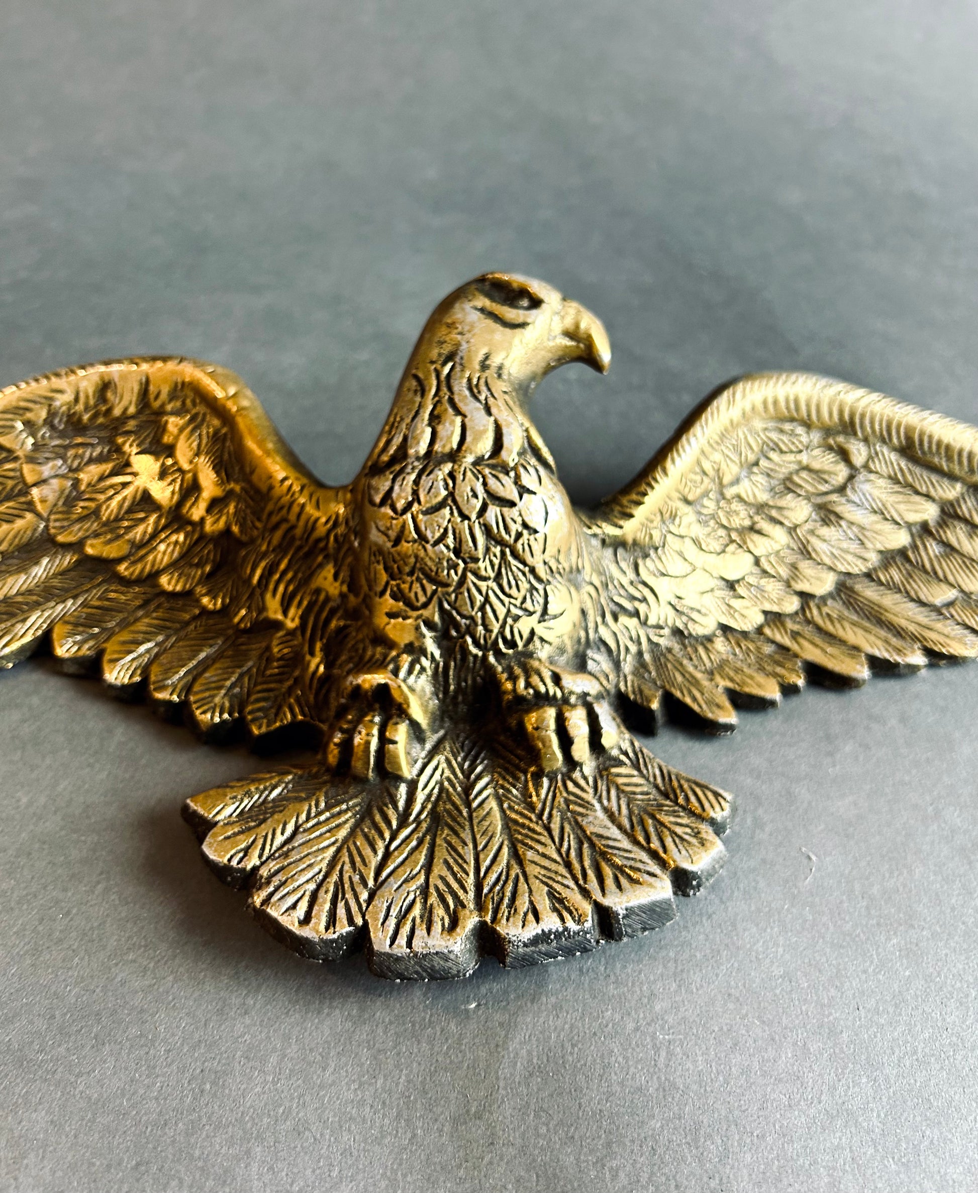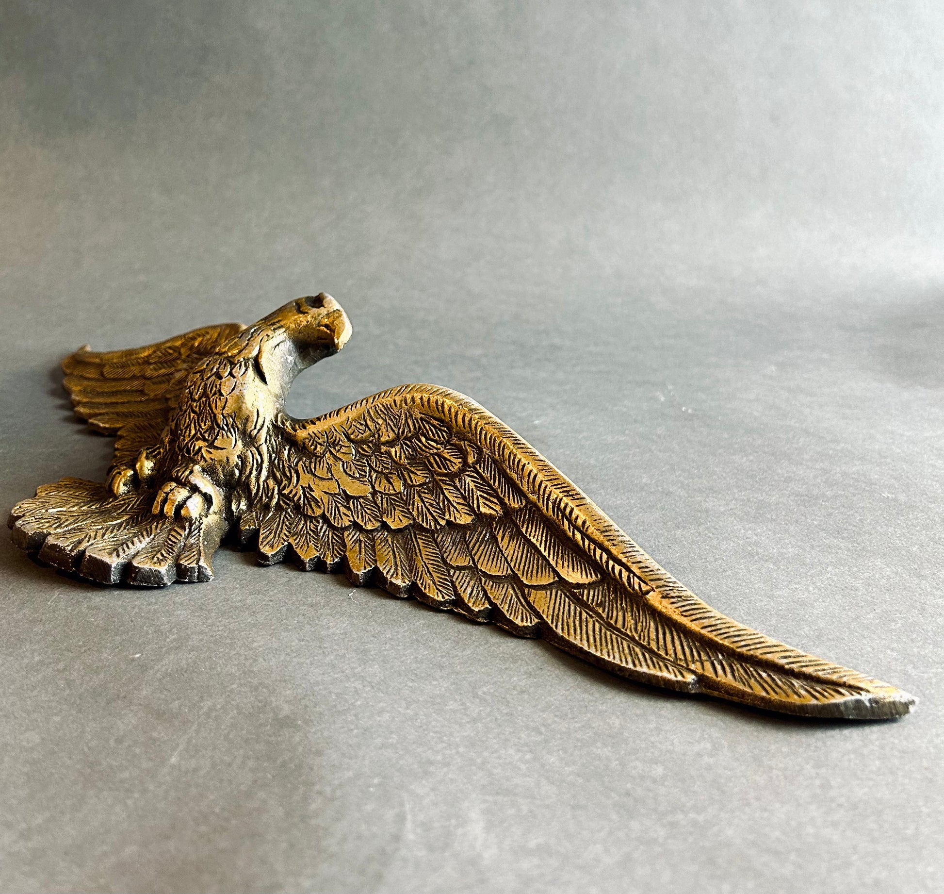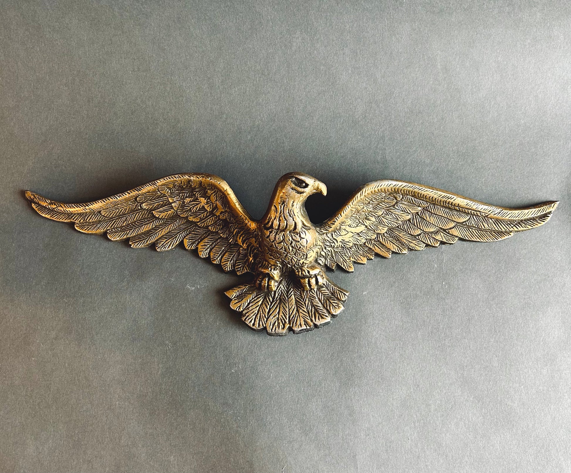 This golden/brass colored metal eagle has a wingspan of 18” and body length of 5” has two hooks on the black for mounting.