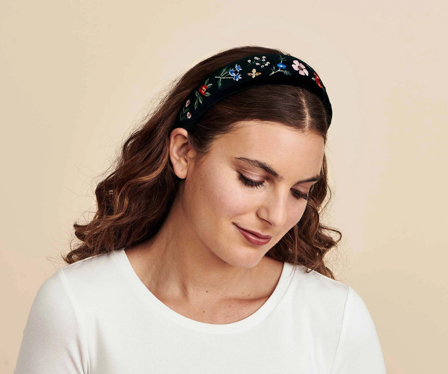 Top off your favorite outfit with our padded headband featuring black velvet and an embroidered Hawthorne design.