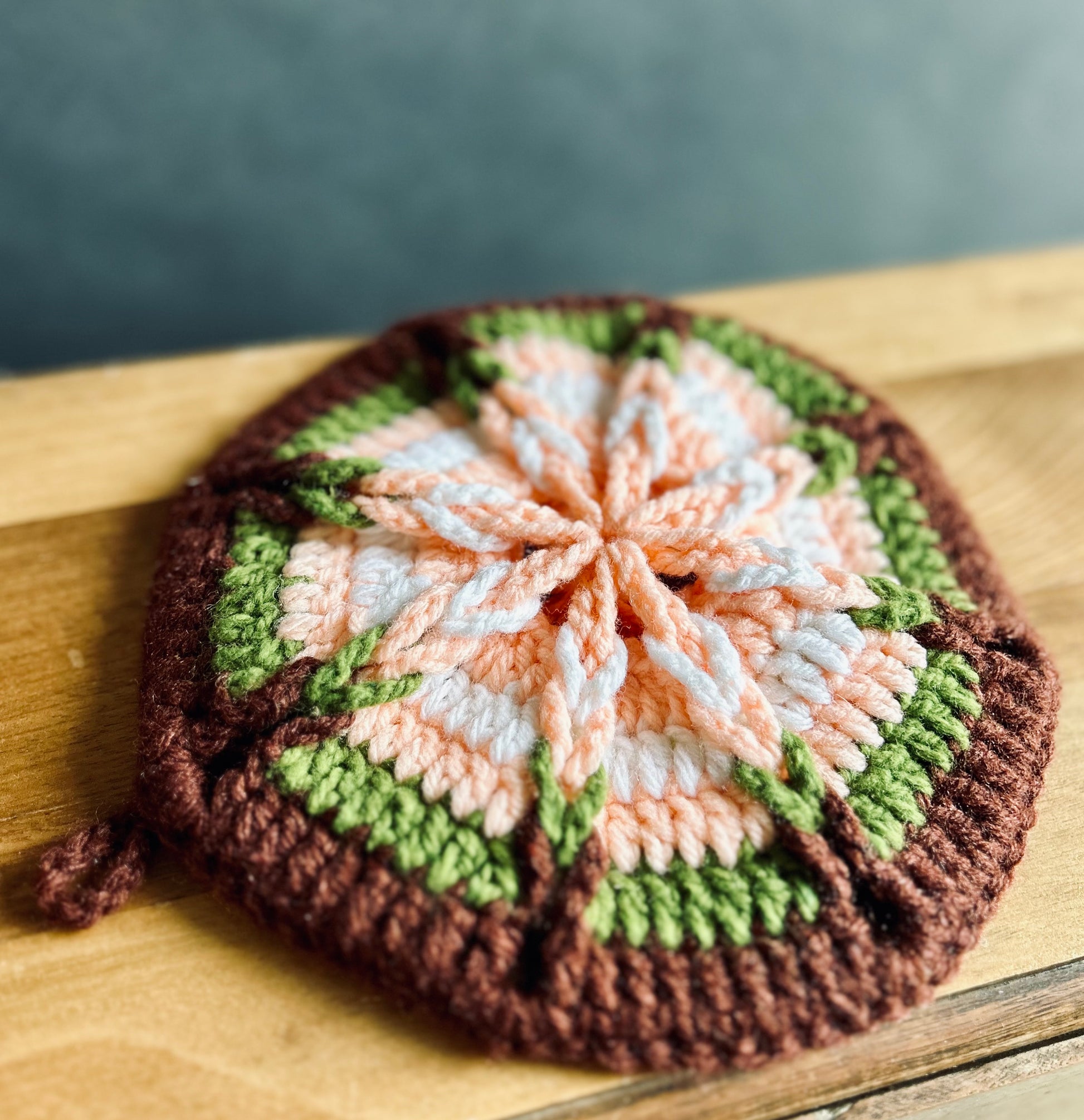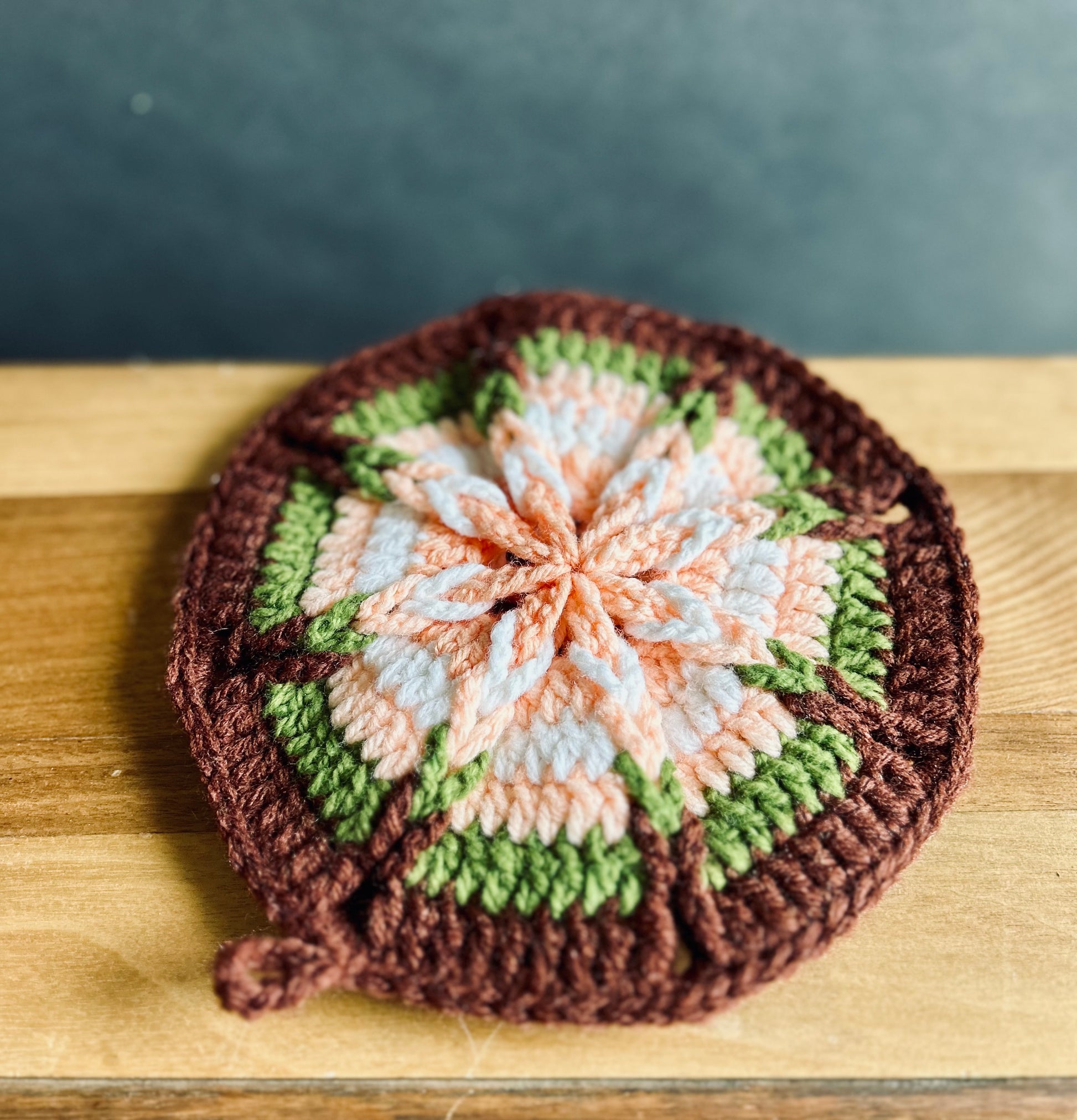 Spice up your kitchen life with this cutie double knitted hot pad! Keeping it vintage vibes with its unique Pink, Green and Brown pattern