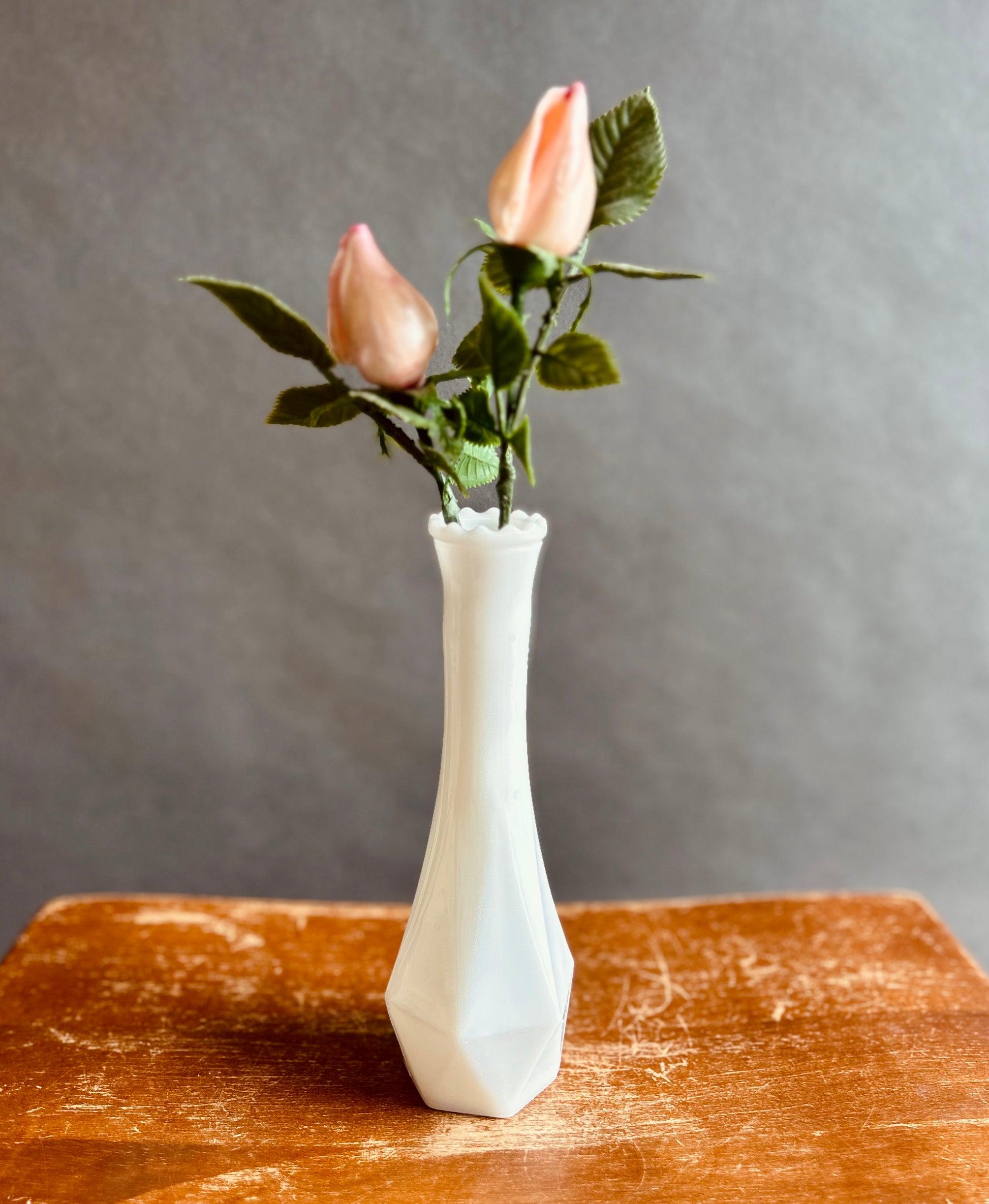 accentuated by an adorable white geometric vase. Measuring at 9”.