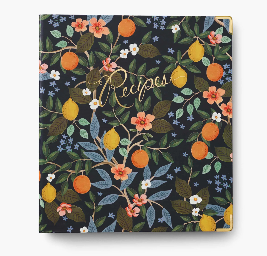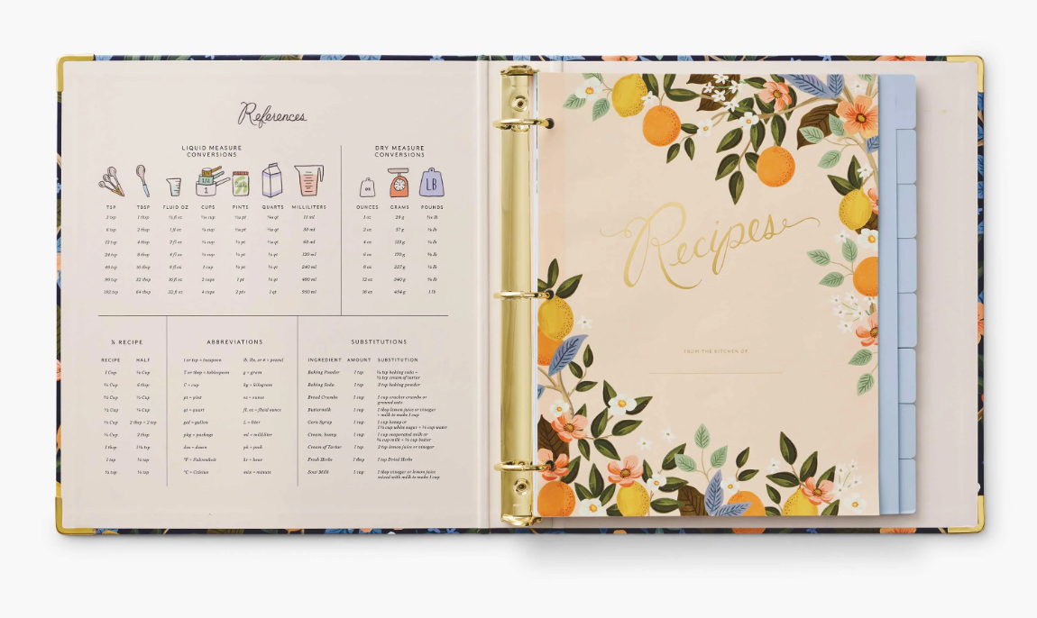 A recipe binder that is both a resource and a keepsake. It’s a place to organize family favorites and new meals to try, and is complete with helpful details to stay organized in the kitchen. The illustrated three-ring recipe binder has gold foil accents, reinforced metal corners, a double-sided pocket folder, 16 tabbed dividers, 10 clear recipe card sleeves, adhesive labels, and reference pages.