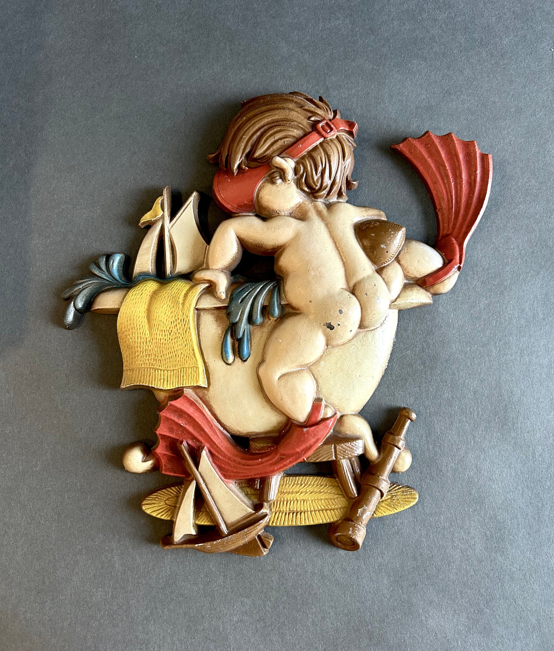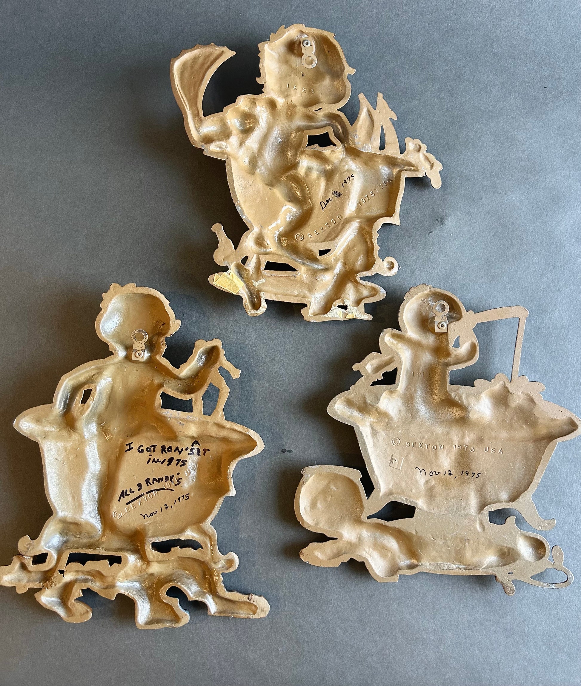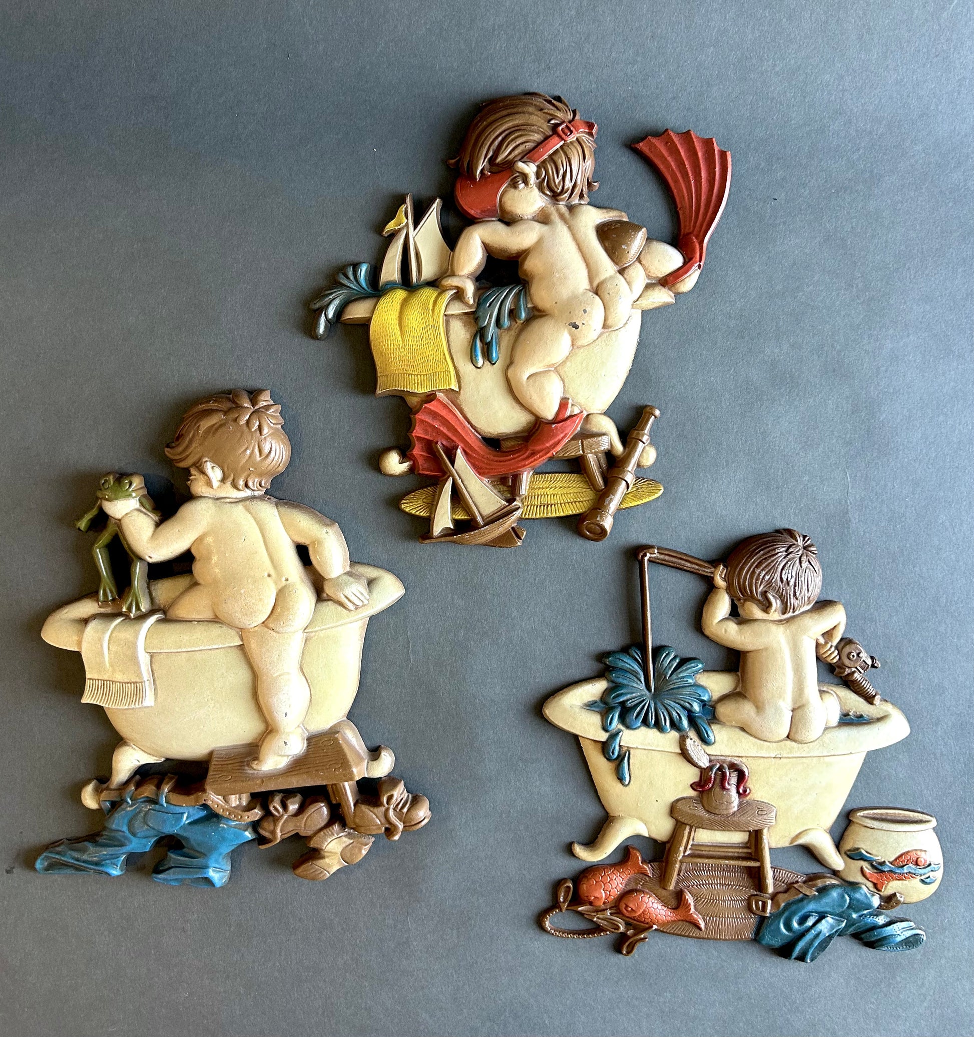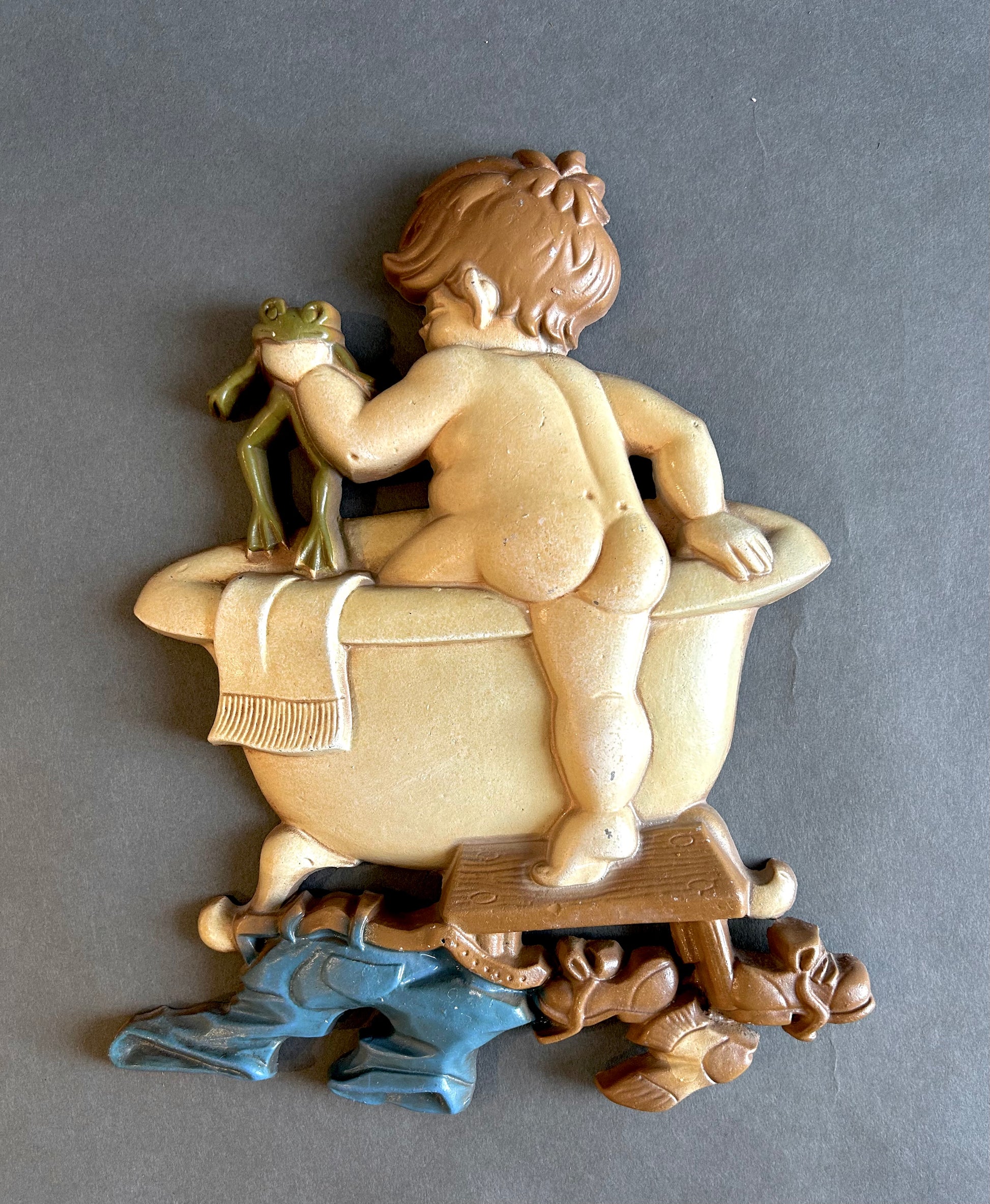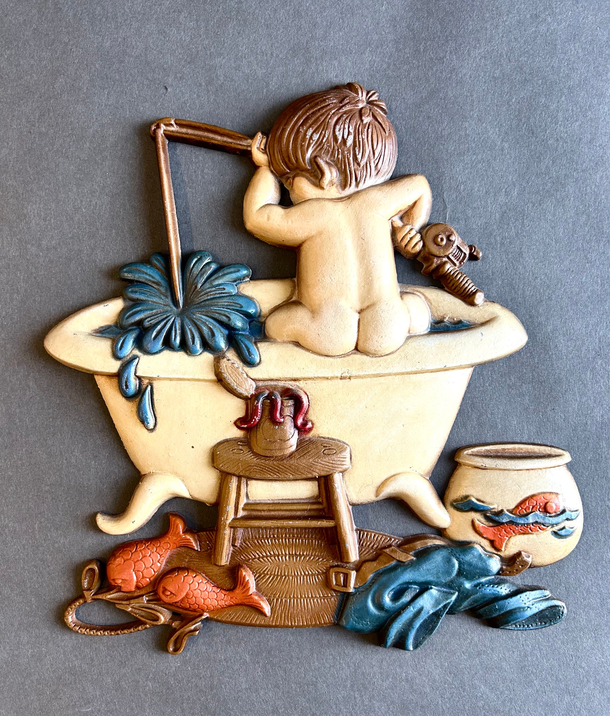 Add a touch of vintage charm to your home decor with an adorable wall decor piece. These three Sexton cast iron bathtub boys are true Americana collectibles from the 1970s. Measuring approx 9”x7”, painted metal casting. Each sold separately.