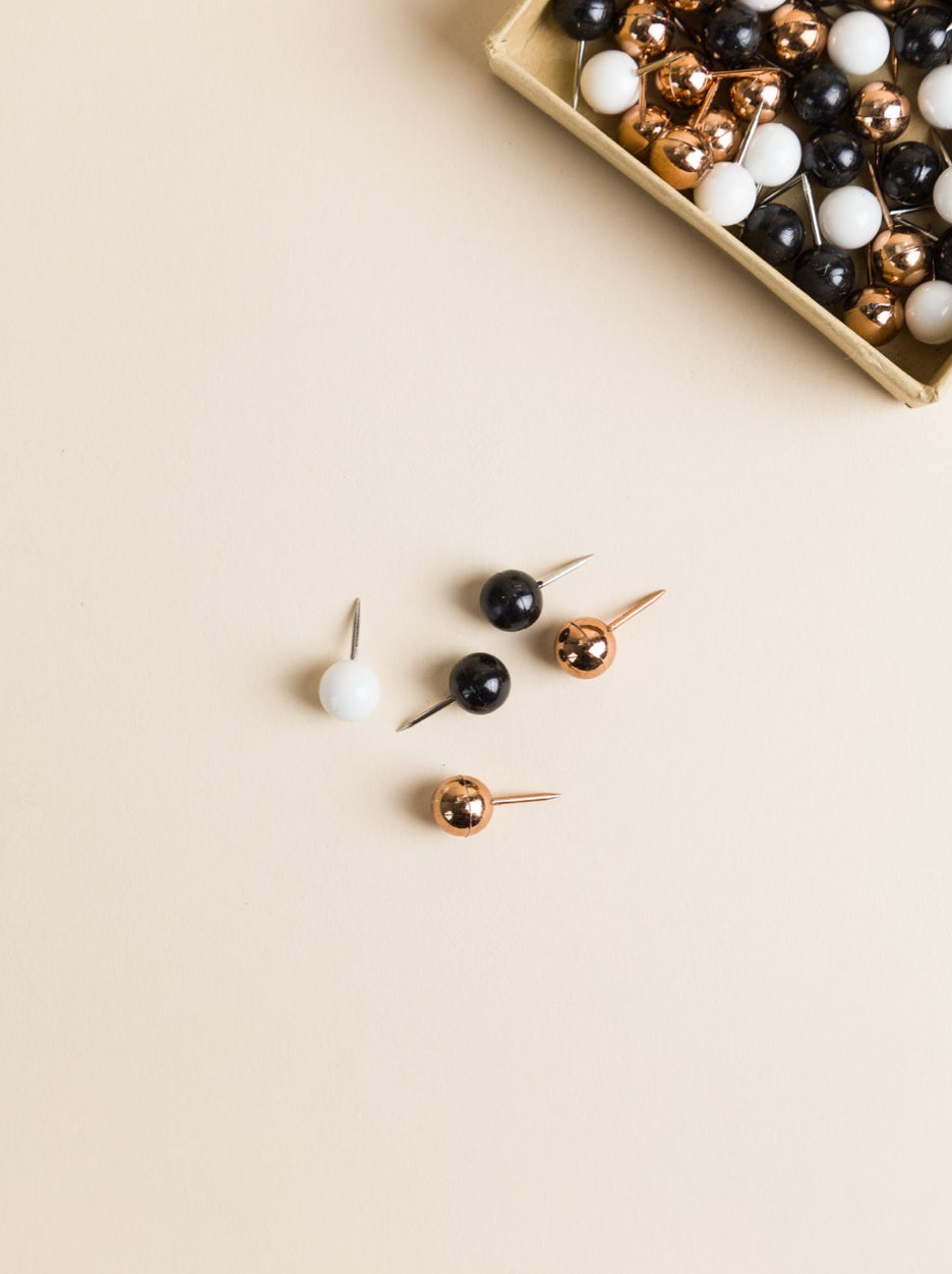 Pin you reminders in style with this set of gold, black, and white spherical pushpins. 60 count, assorted