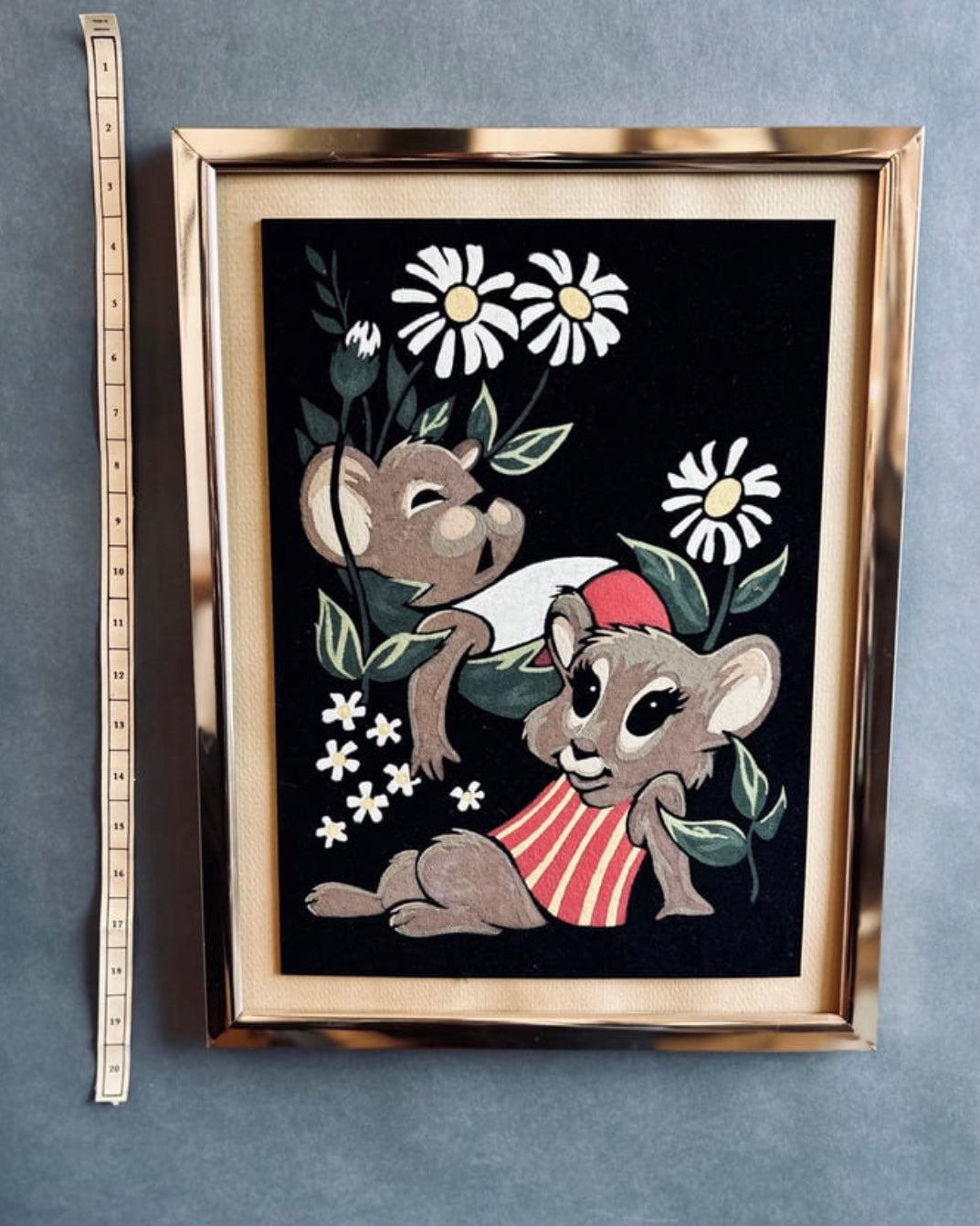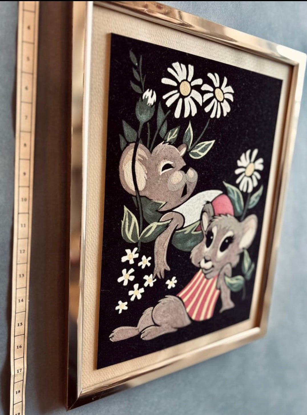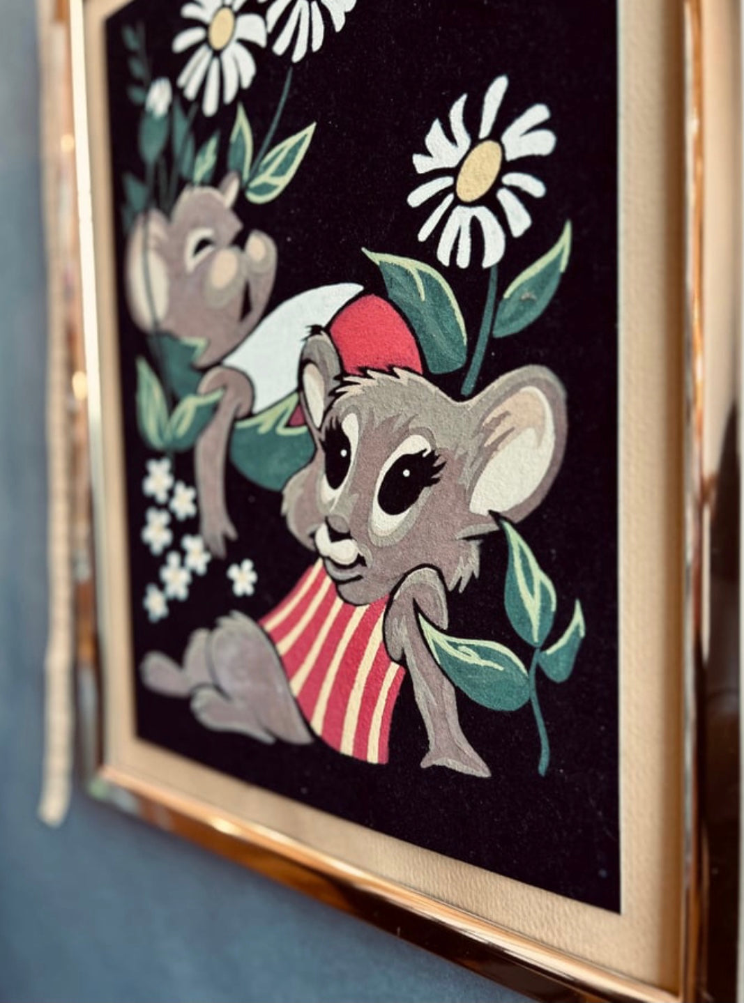 Mouse house wall art for your human house, or whatever house. Velvet painting approx. 8x10 in gold colored frame.