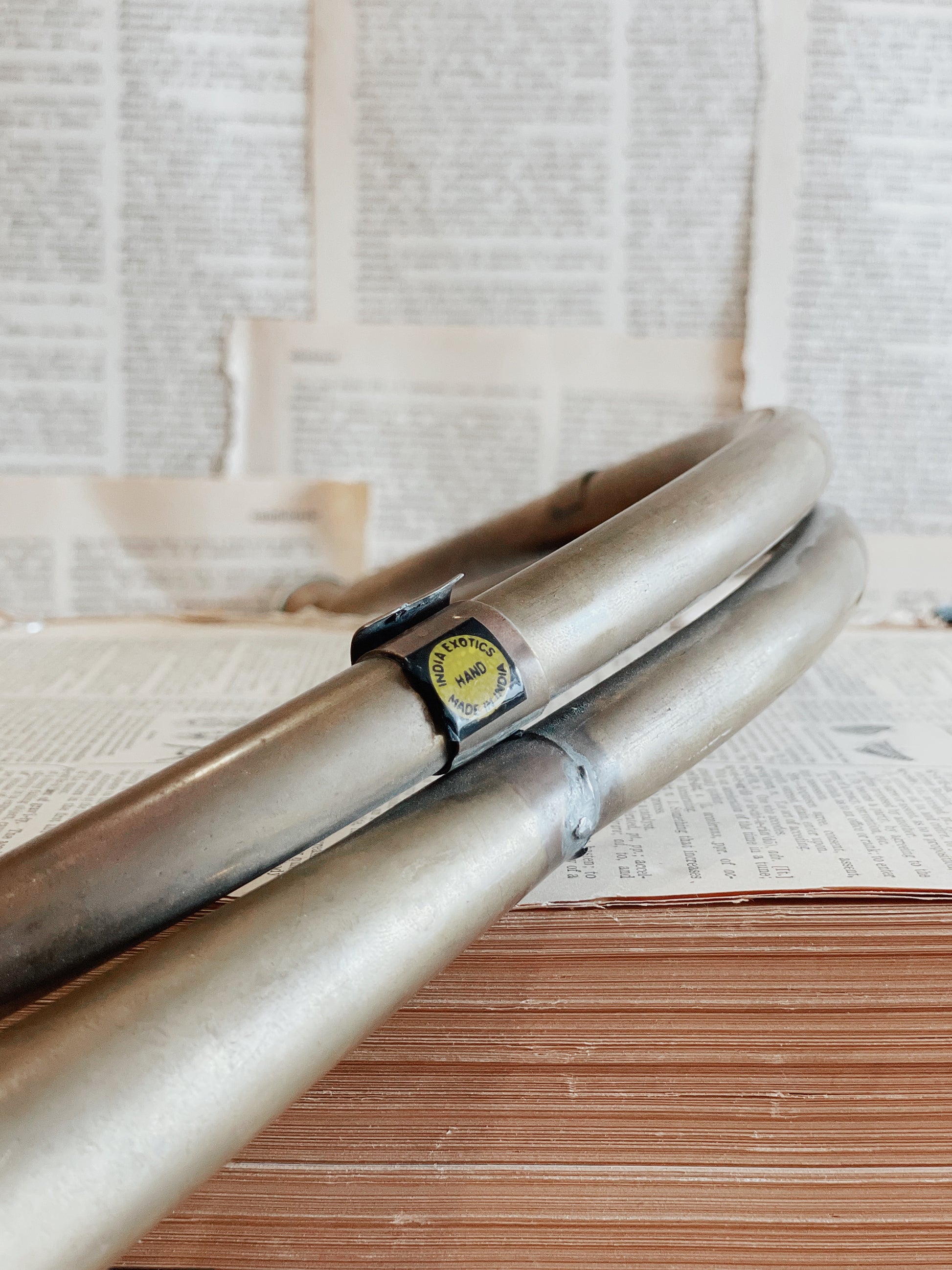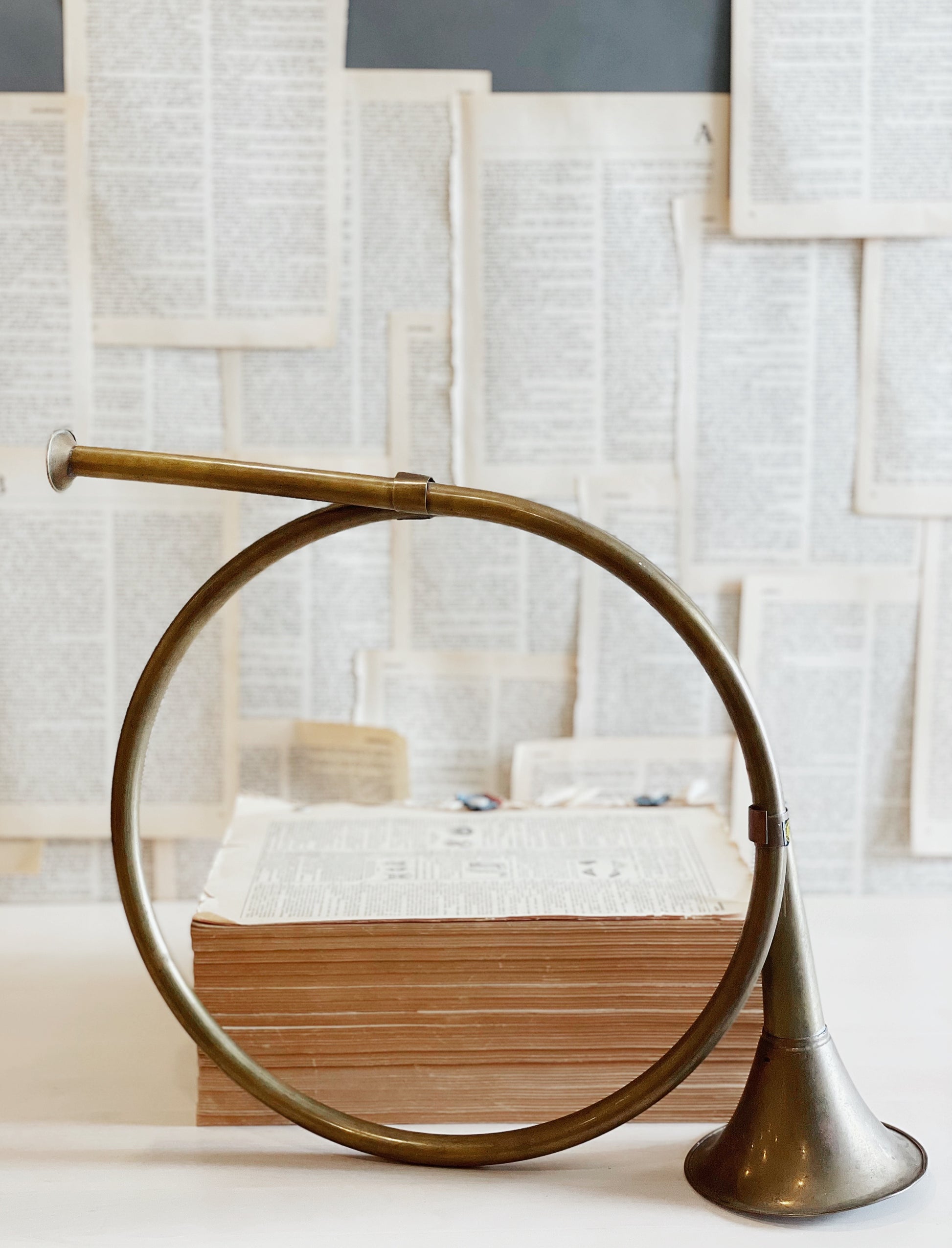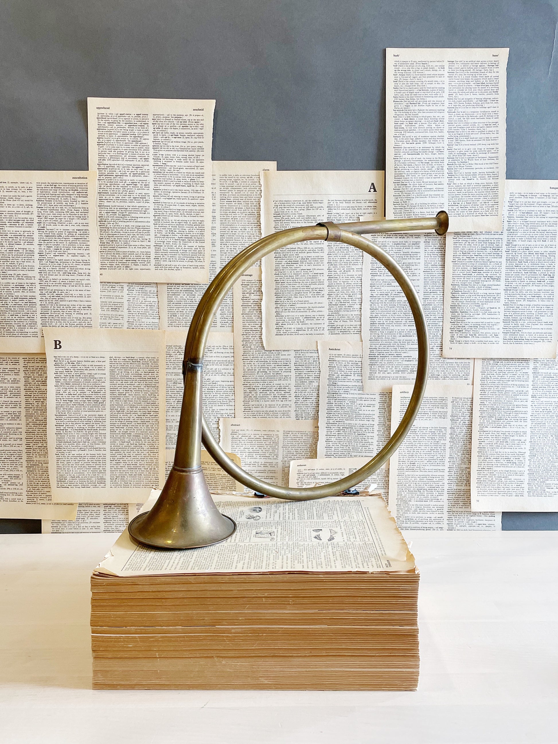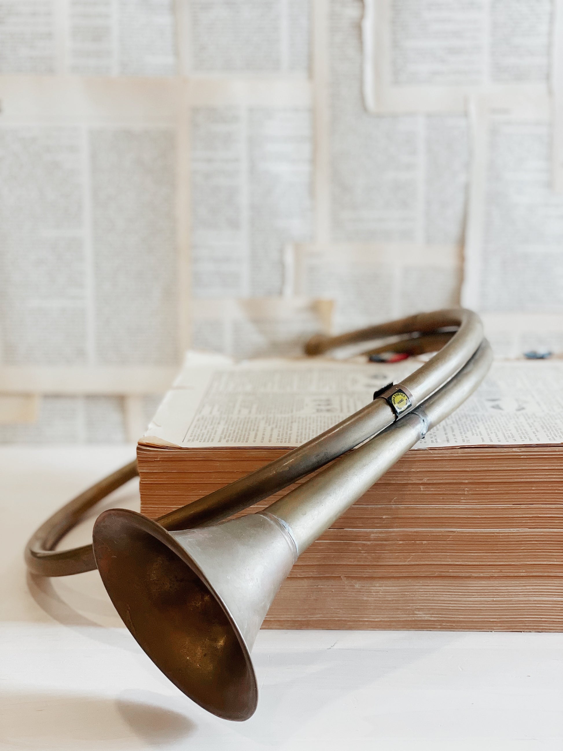 This vintage brass horn has a wonderful patina and is a simple and striking piece. This horn is made of real brass and would be beautiful in display as home decor. I’m not sure if it plays properly, but don’t see any evidence of why it wouldn’t. This piece has a warm quality and would look wonderful as an eclectic piece of decor.
