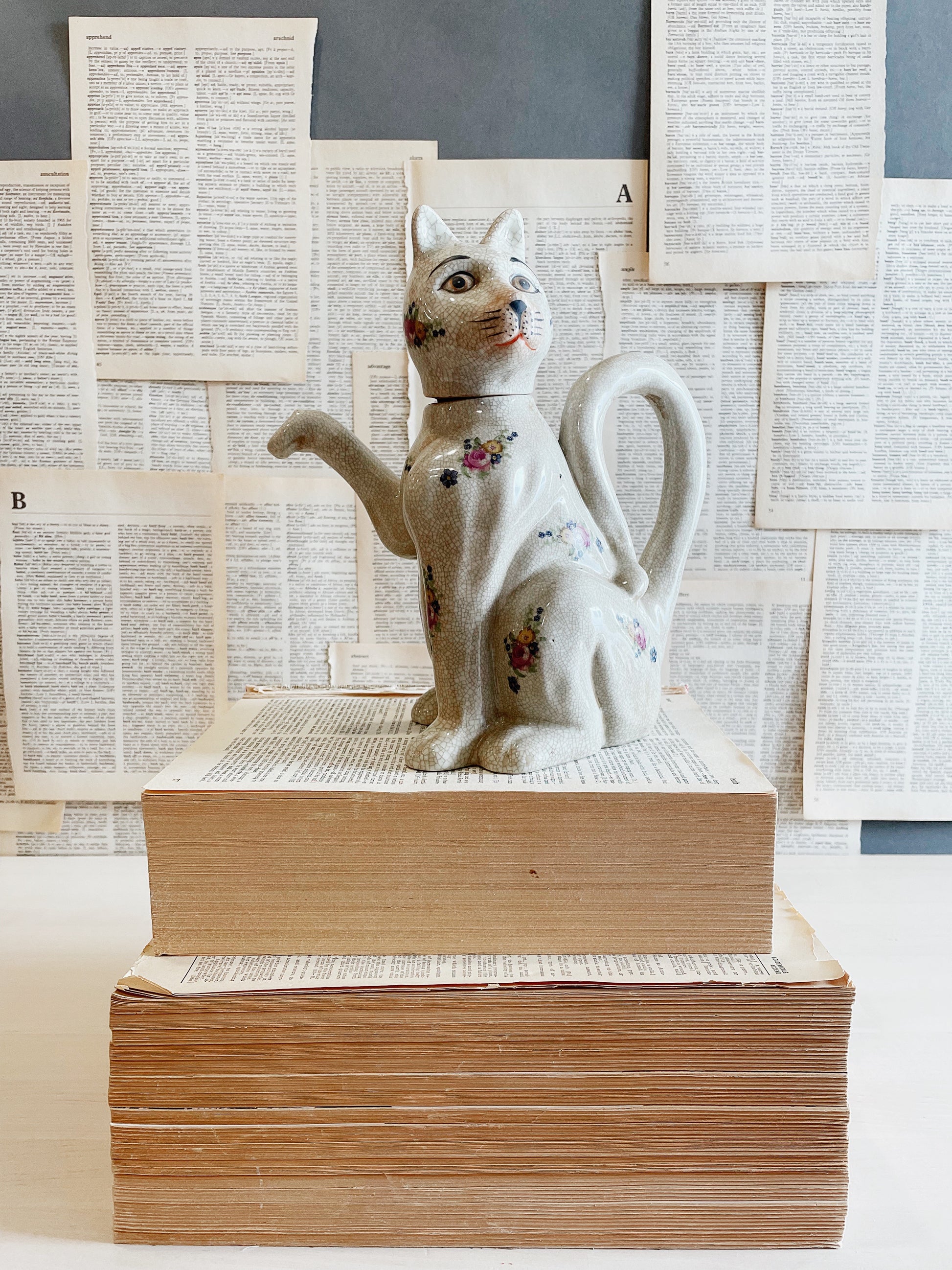 This vintage cat teapot is so unique and striking. The crackle glaze and floral pattern is lovely and adds to the vintage charm. The cats arm acts as the spout, while the tail works as a handle, the head removes for filling. This piece would be a wonderful addition to a collection, or a stand alone price of a decor!