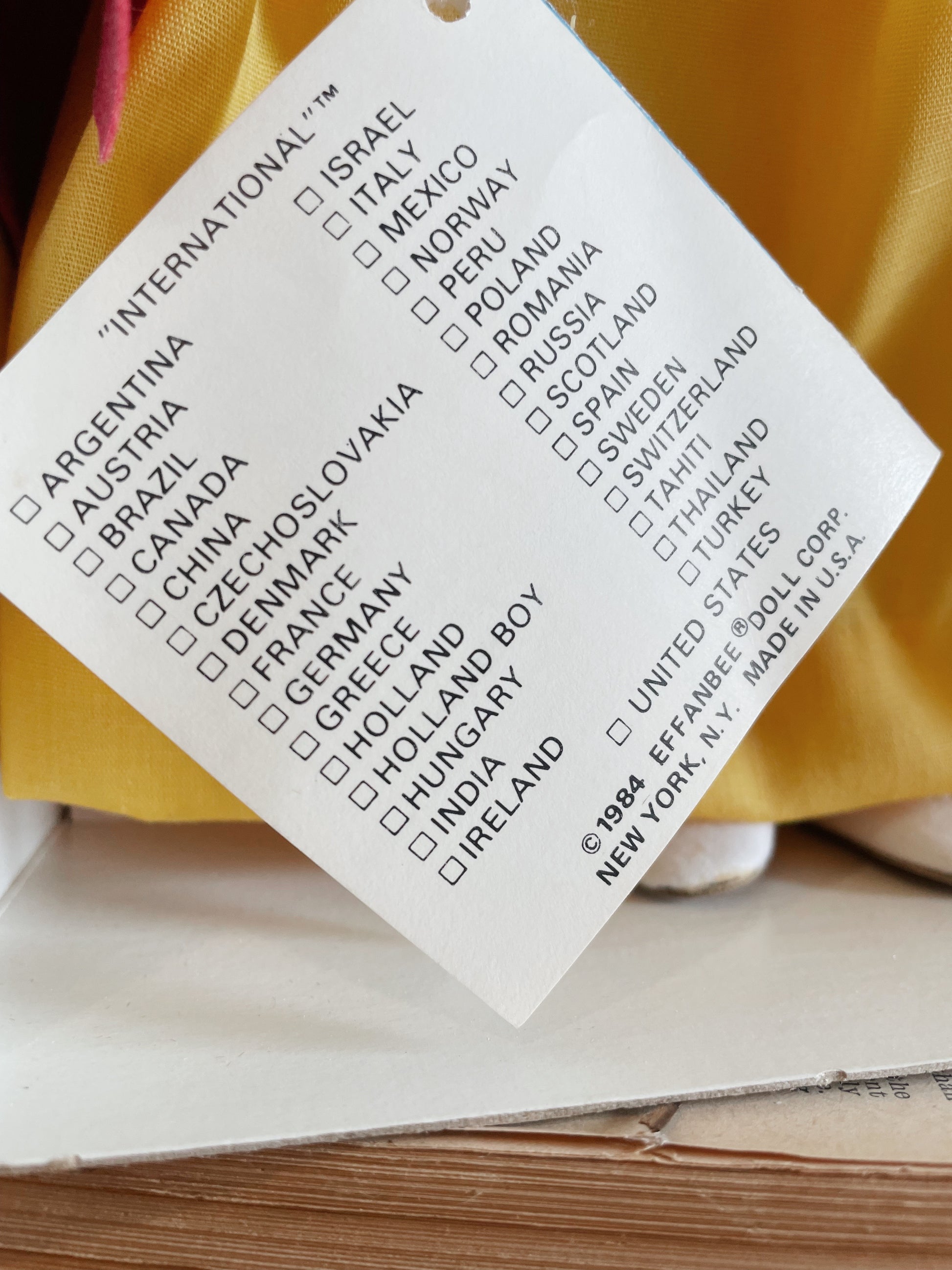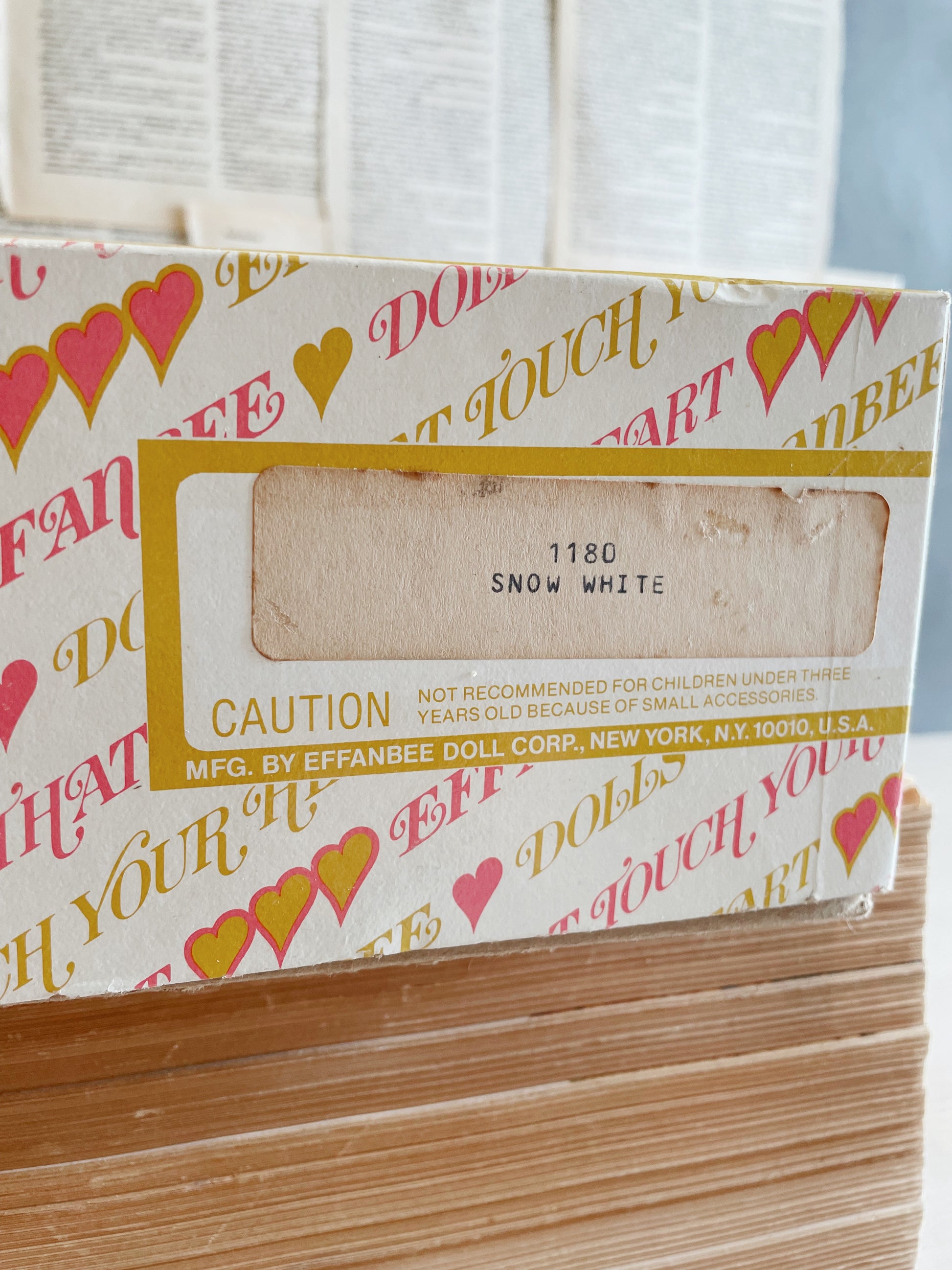 This vintage Snow White doll has been preserved in its original packaging, never removed from the twist ties that secure her in the box. This is a fantastic original Effanbee doll in mint collectors condition. Snow White dons her original costume as portrayed in the Walt Disney movie. Around her wrist is the original tag that lists all the different characters of Effanbee dolls of the time. The original box is in tact and has the original Snow White tag on the side.