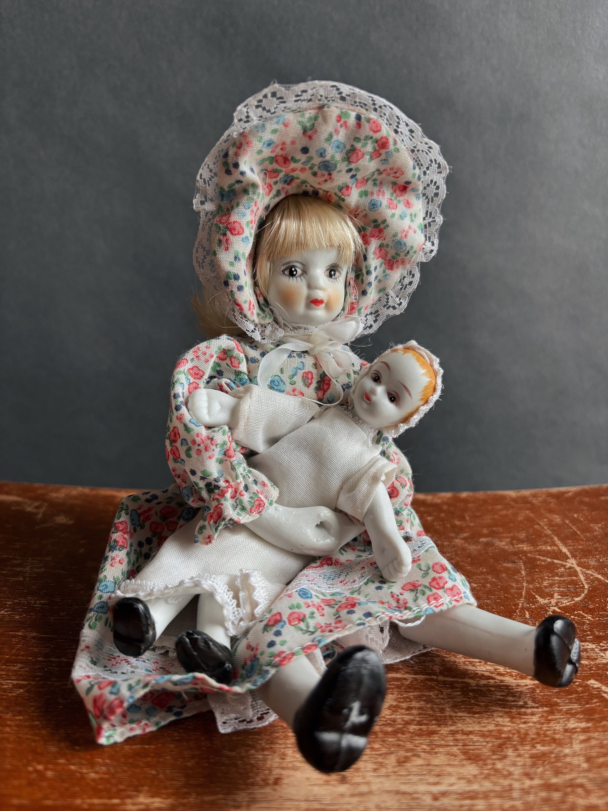 This unique handmade doll is holding a baby of its own. Both dolls have bendable wire limbs and glass features.