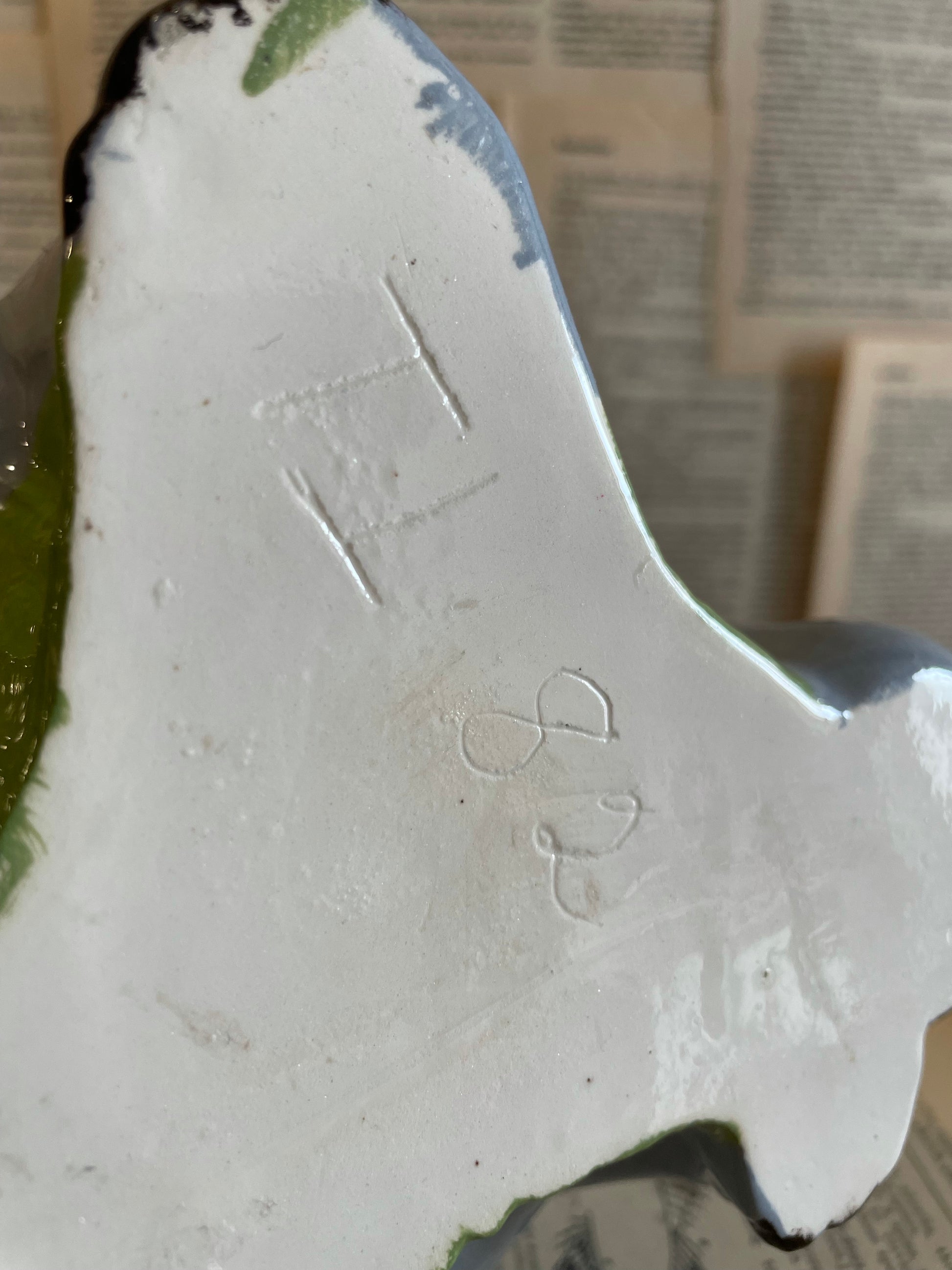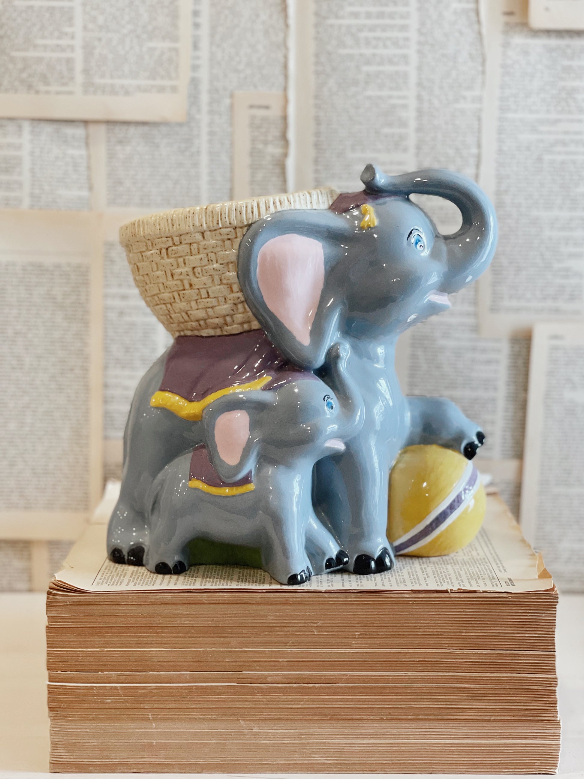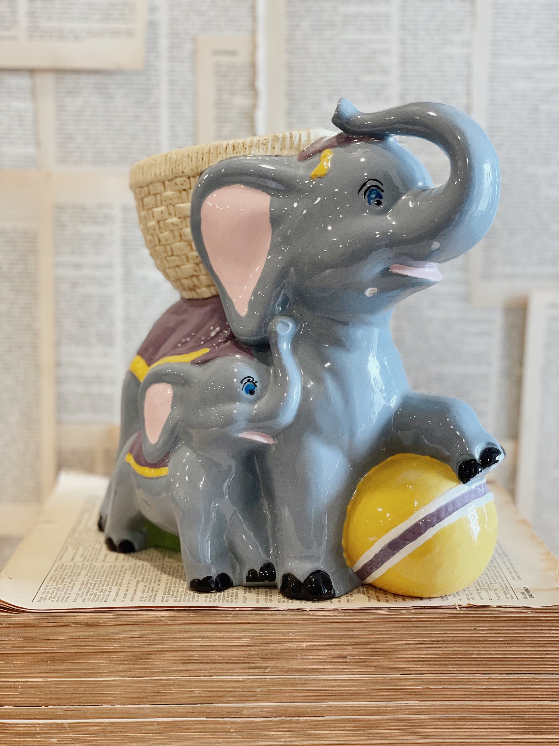 This vintage hand painted Dumbo with mother planter is wonderful. It has great bright colors and a shiny glaze. This hand painted planter is signed and dated ‘82. There are a few small chips in the paint, the largest one on the bottom of the mother’s chin, which can be seen in the photos.