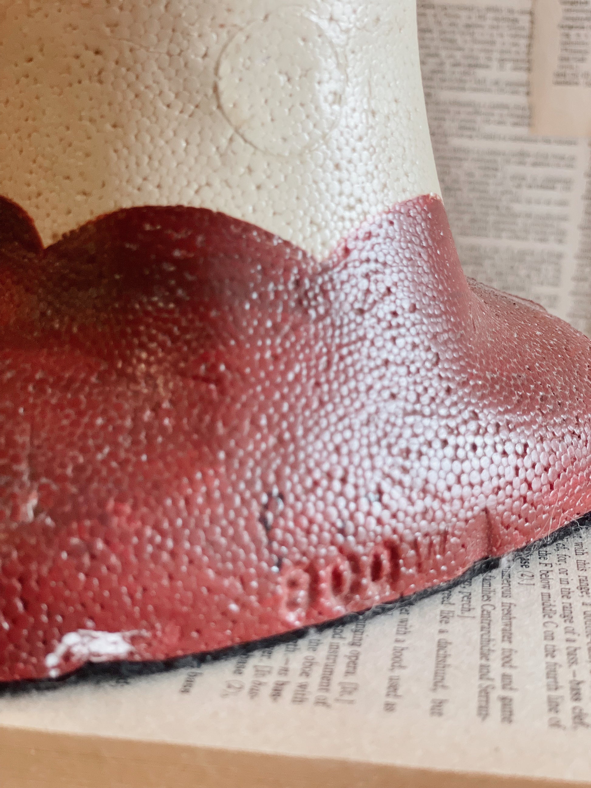 This vintage mannequin bust is made of light weight styrofoam material. She is very pretty painted in a vintage style of the early 20th century. She sports lovely puckered lips and blue eyes, with a scalloped dark red collar. This piece is vintage, and being made of styrofoam she has some dents and scratches, they don’t take away from the lovely form but add to the vintage patina and charm. The nose has some damage, as can be seen in photos along side other imperfections. This would make a lovely hat stand at hime or in a shop, or a striking piece of decor.
