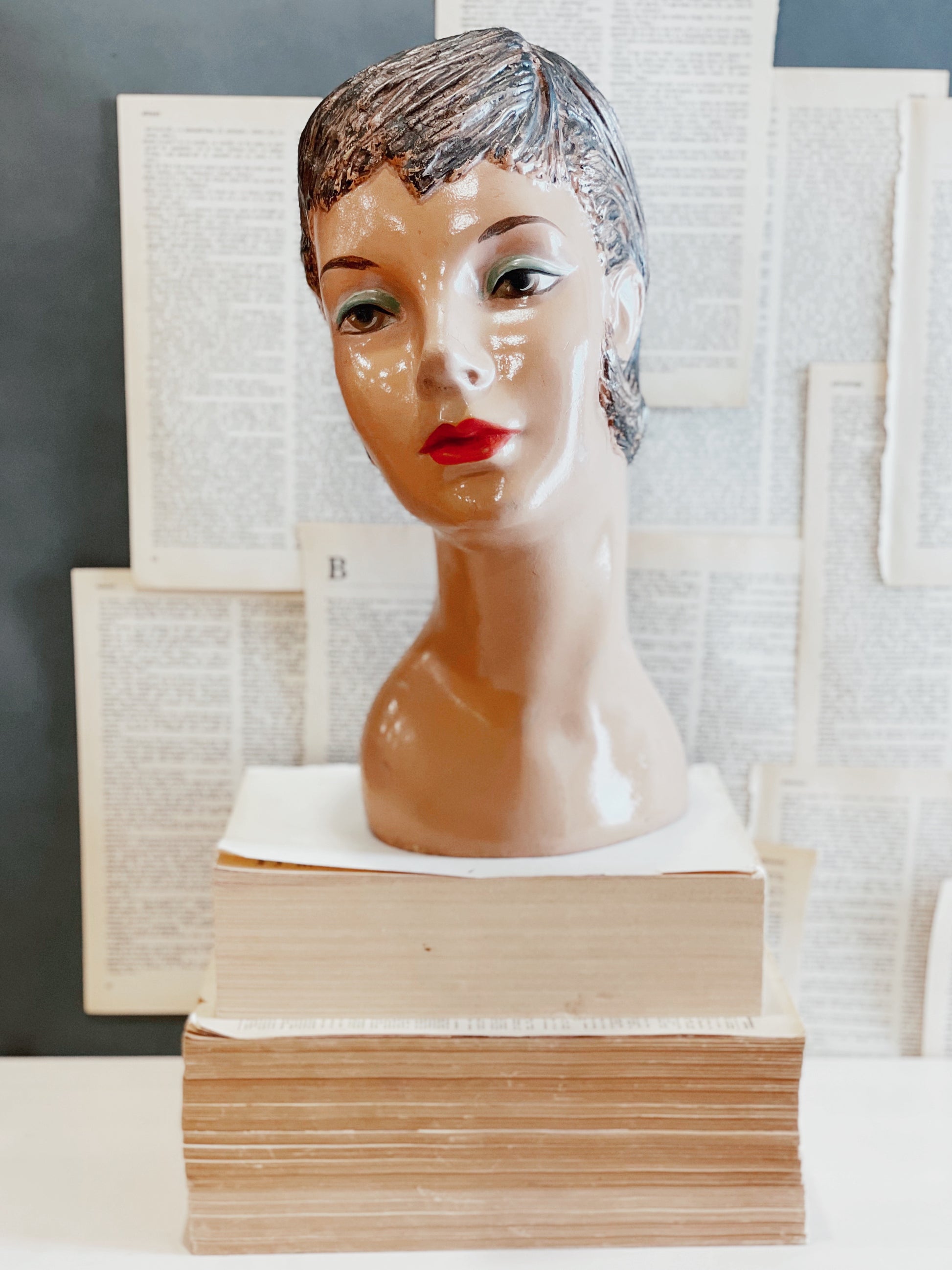 This female mannequin head is gorgeous! A beautiful piece for home decor or to use as a hat rest, or even in a store as a hat display, it’s intended use. The make up and quality of this piece is stunning. There is some signs or age and wear towards the base and on the nose and chin. This piece has a lovely shine and is in beautiful vintage condition.