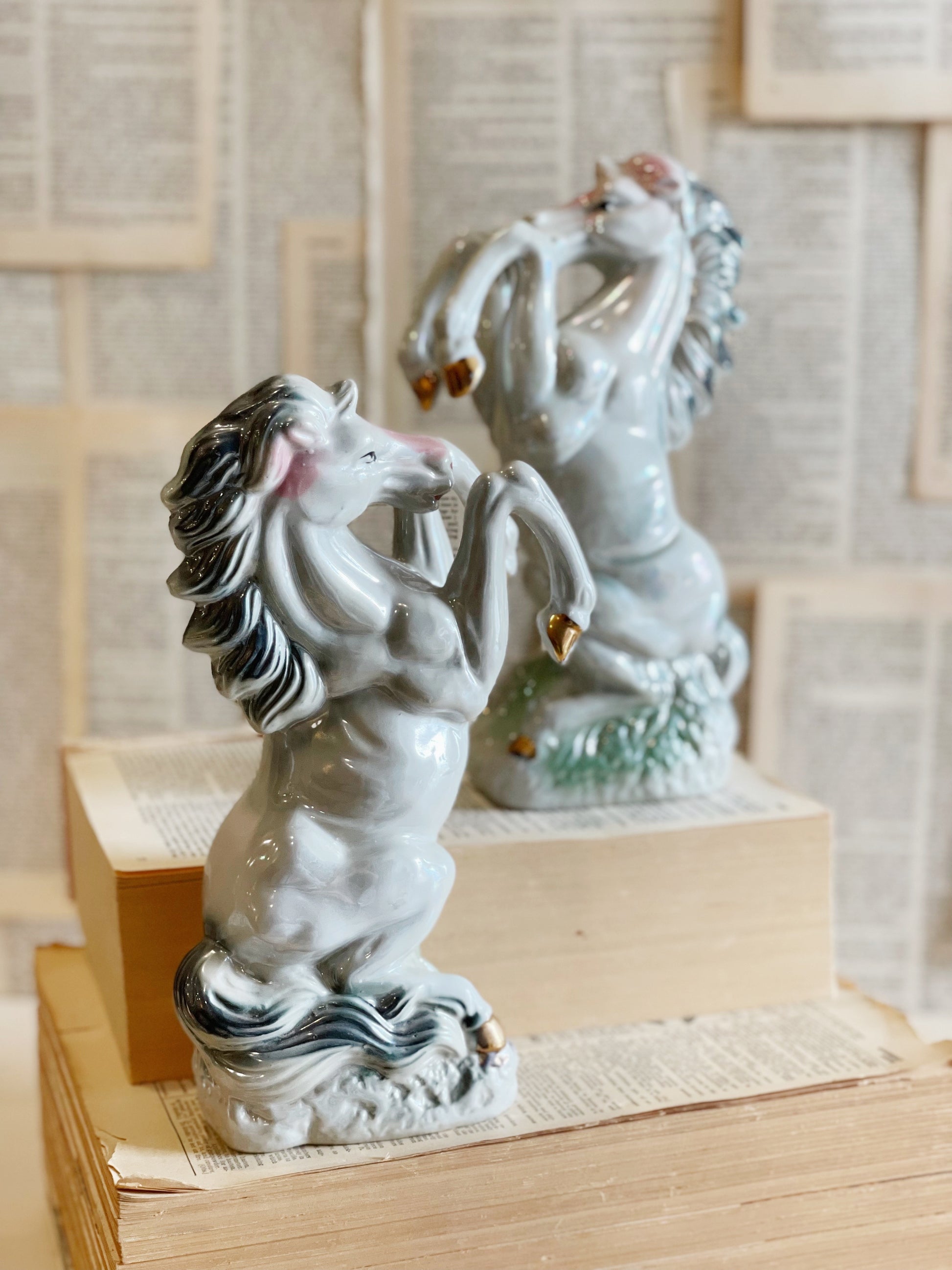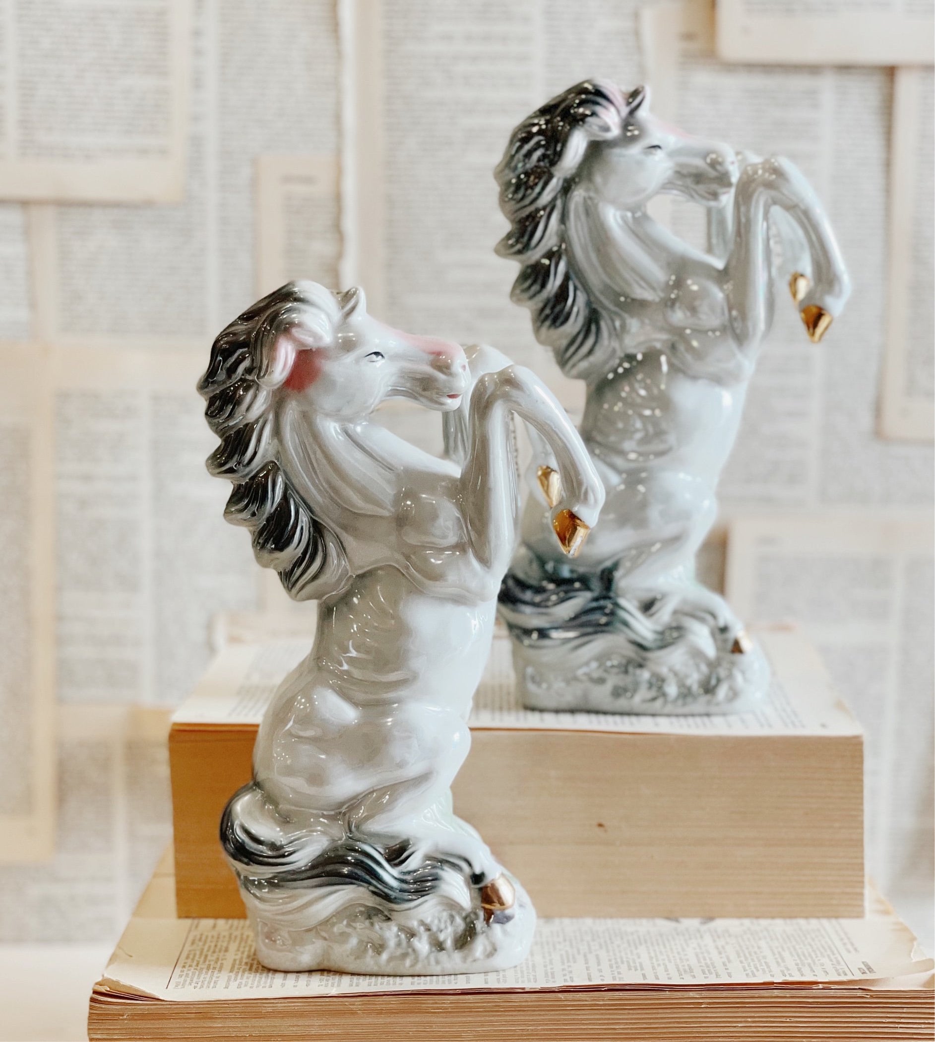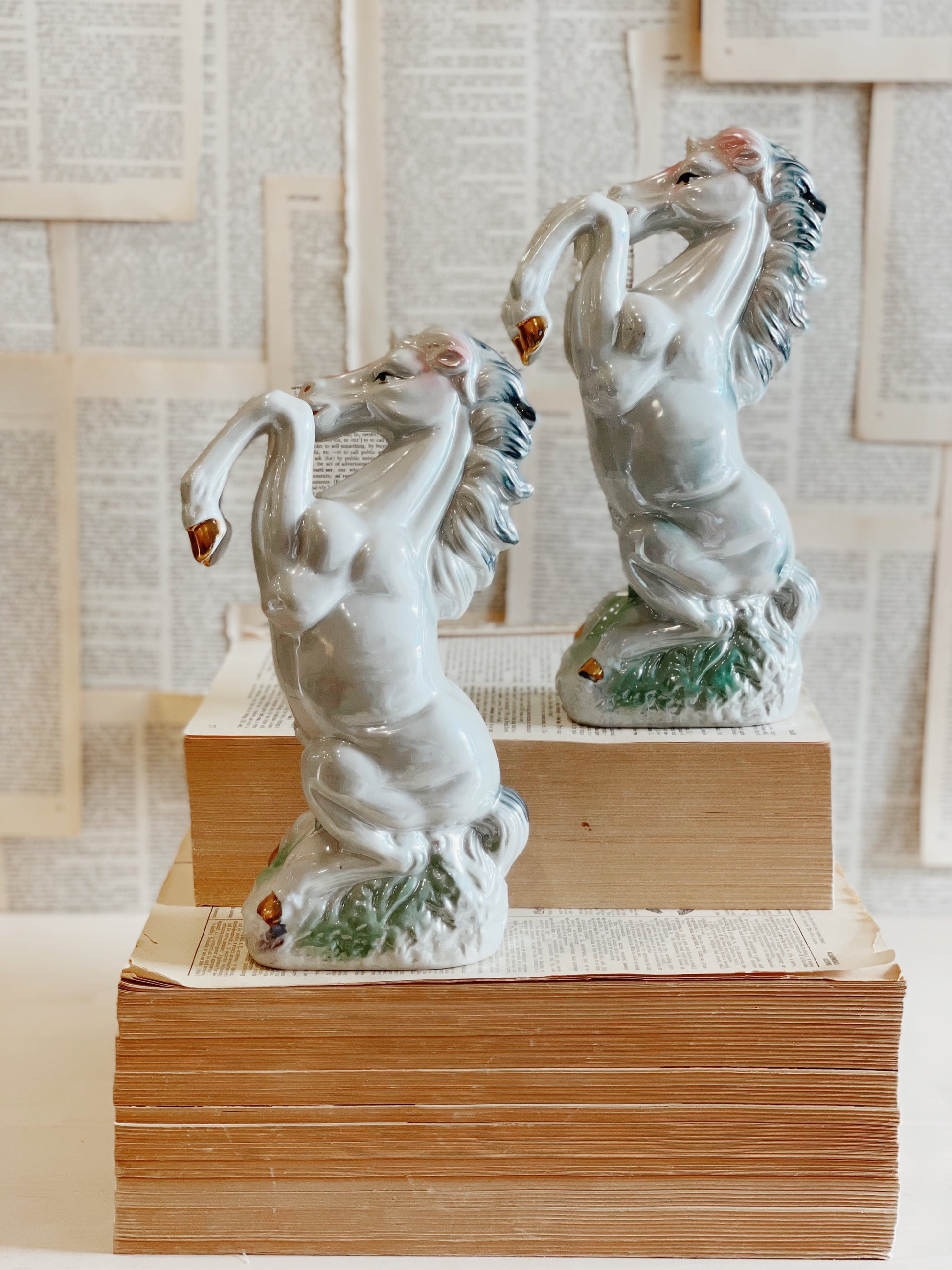 This pair of vintage horses is striking, they would frame a piece of art, clock, or set of books beautifully. These horses are painted white with metallic and soft pastel features. One horse has been repaired on one of its legs (see images).