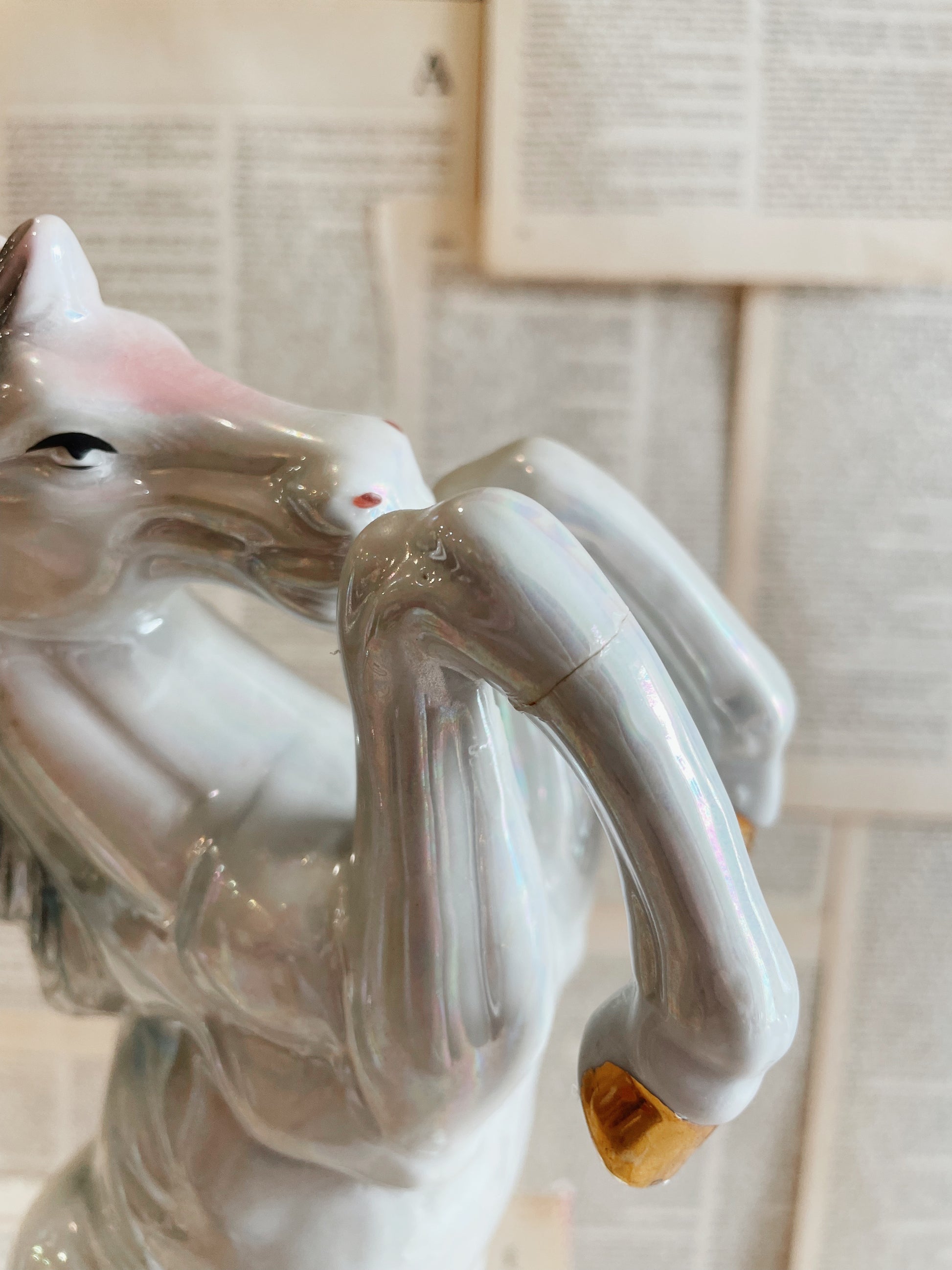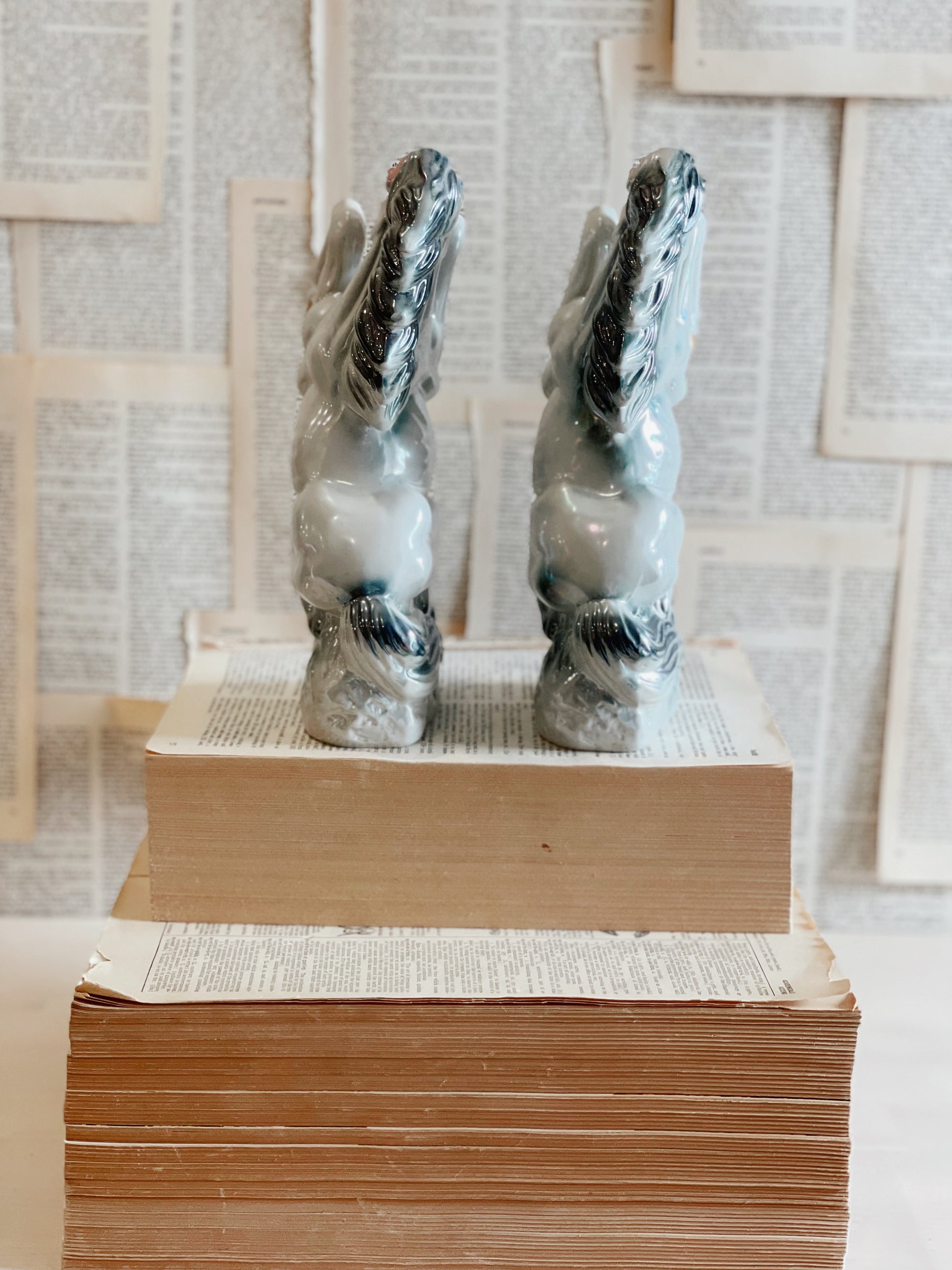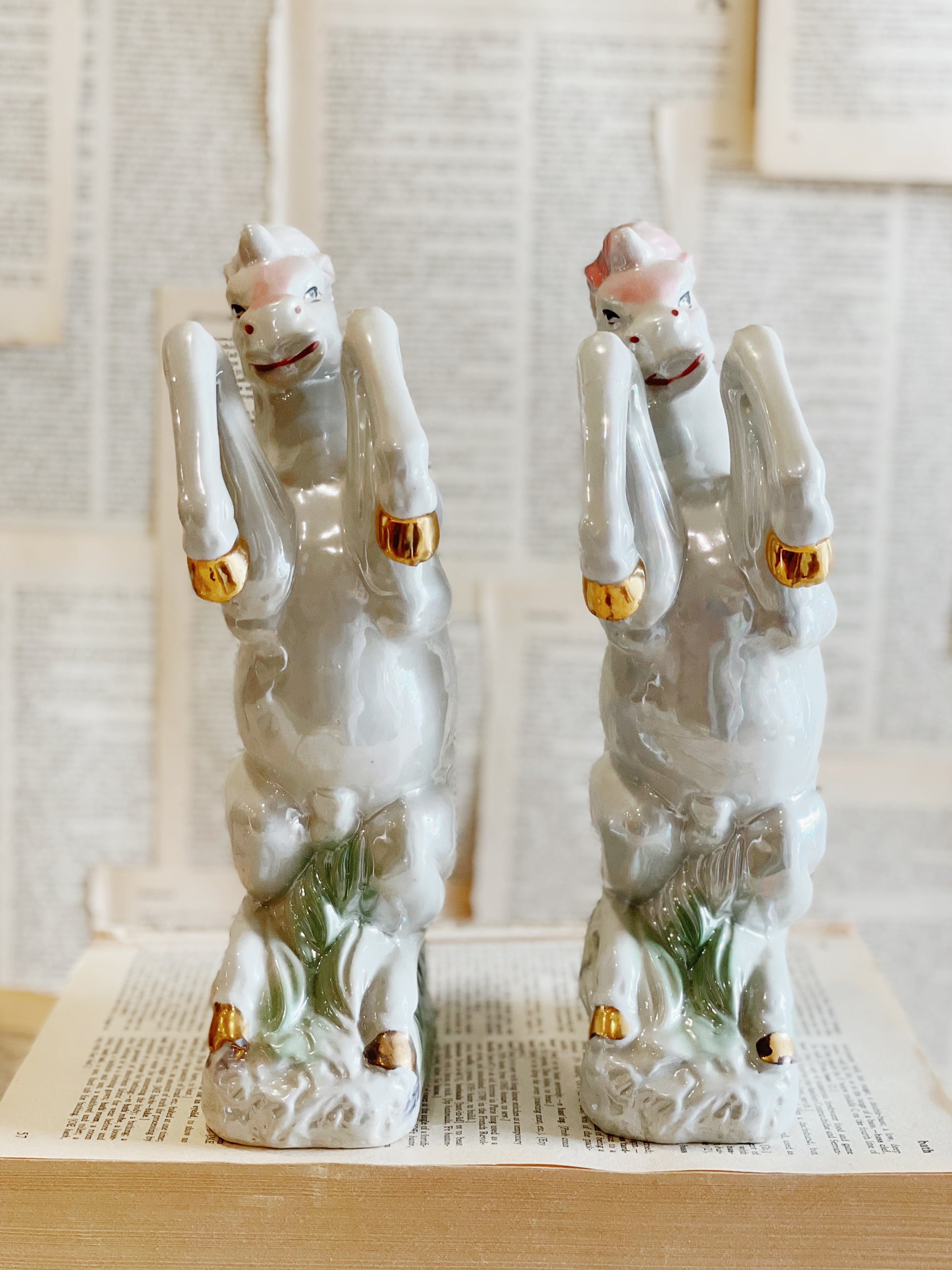 This pair of vintage horses is striking, they would frame a piece of art, clock, or set of books beautifully. These horses are painted white with metallic and soft pastel features. One horse has been repaired on one of its legs (see images).