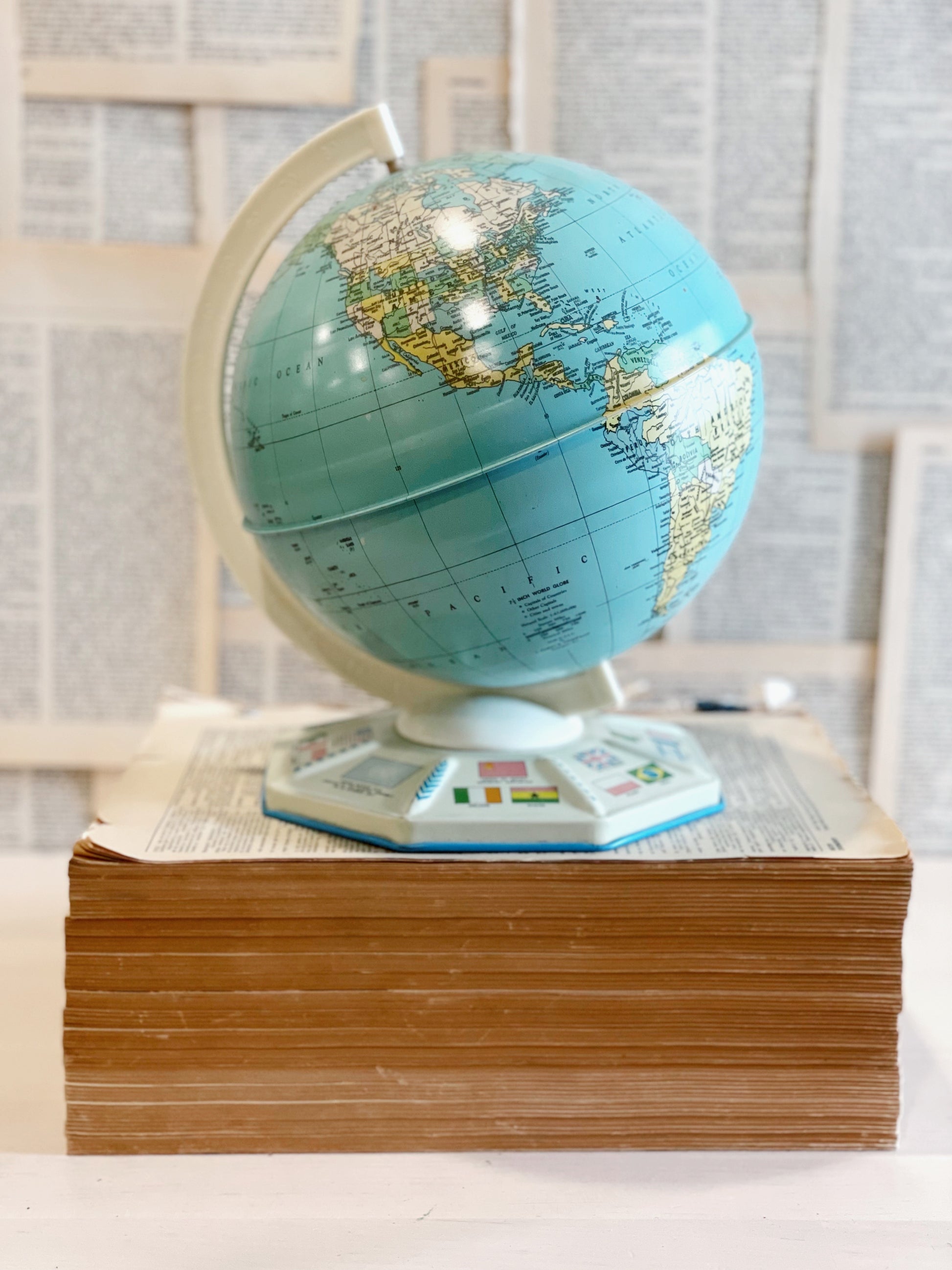 This vintage tin globe is in great condition and very cute. From the mid century this piece has a lot of vintage charm! The base showcases some of the worlds country flags. There is one dent which I’ve included in the photograph. Globe is tin, arm and base are hard plastic.