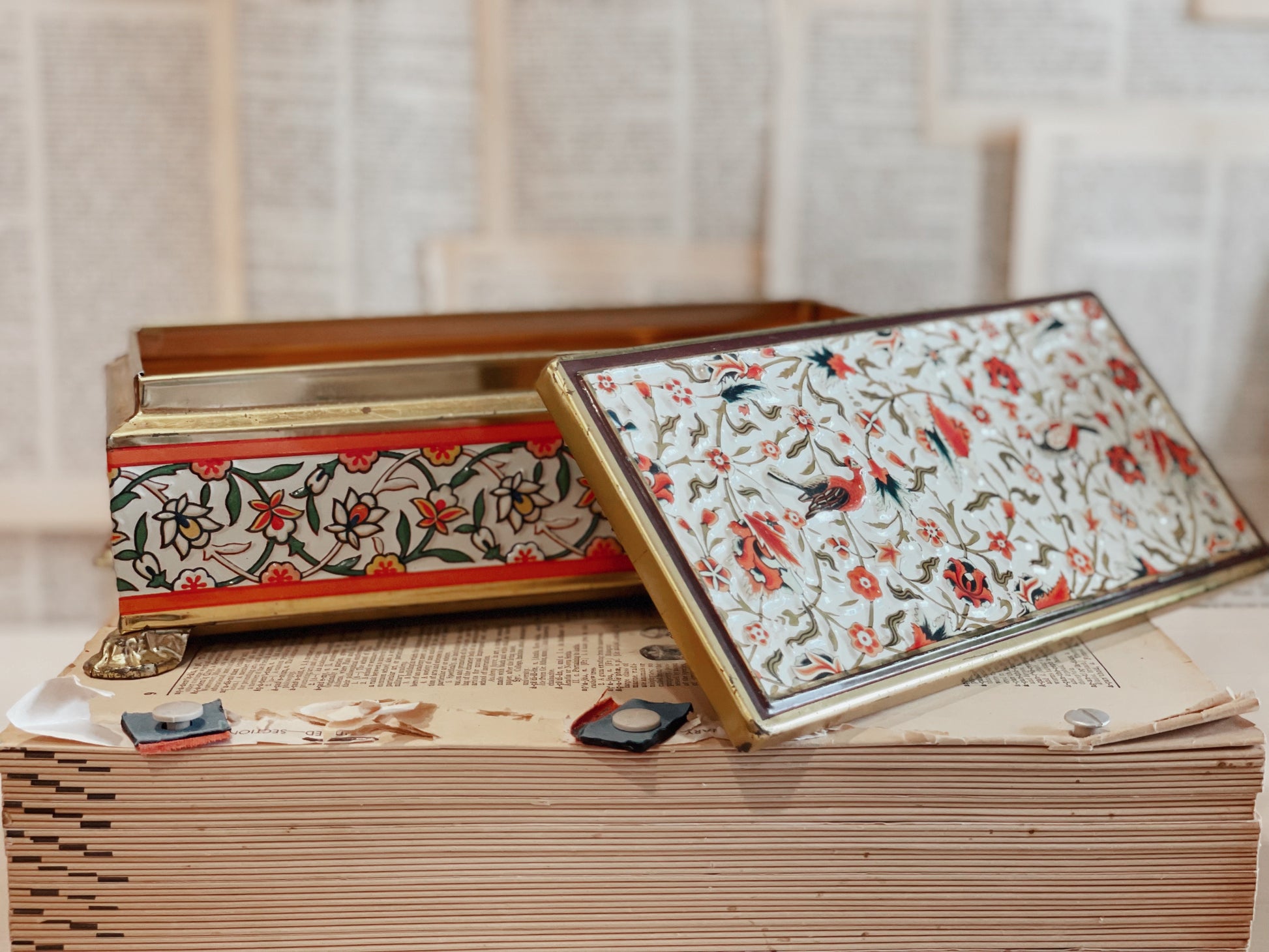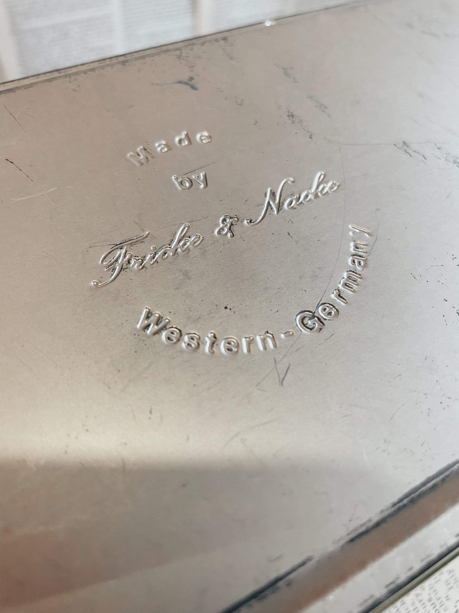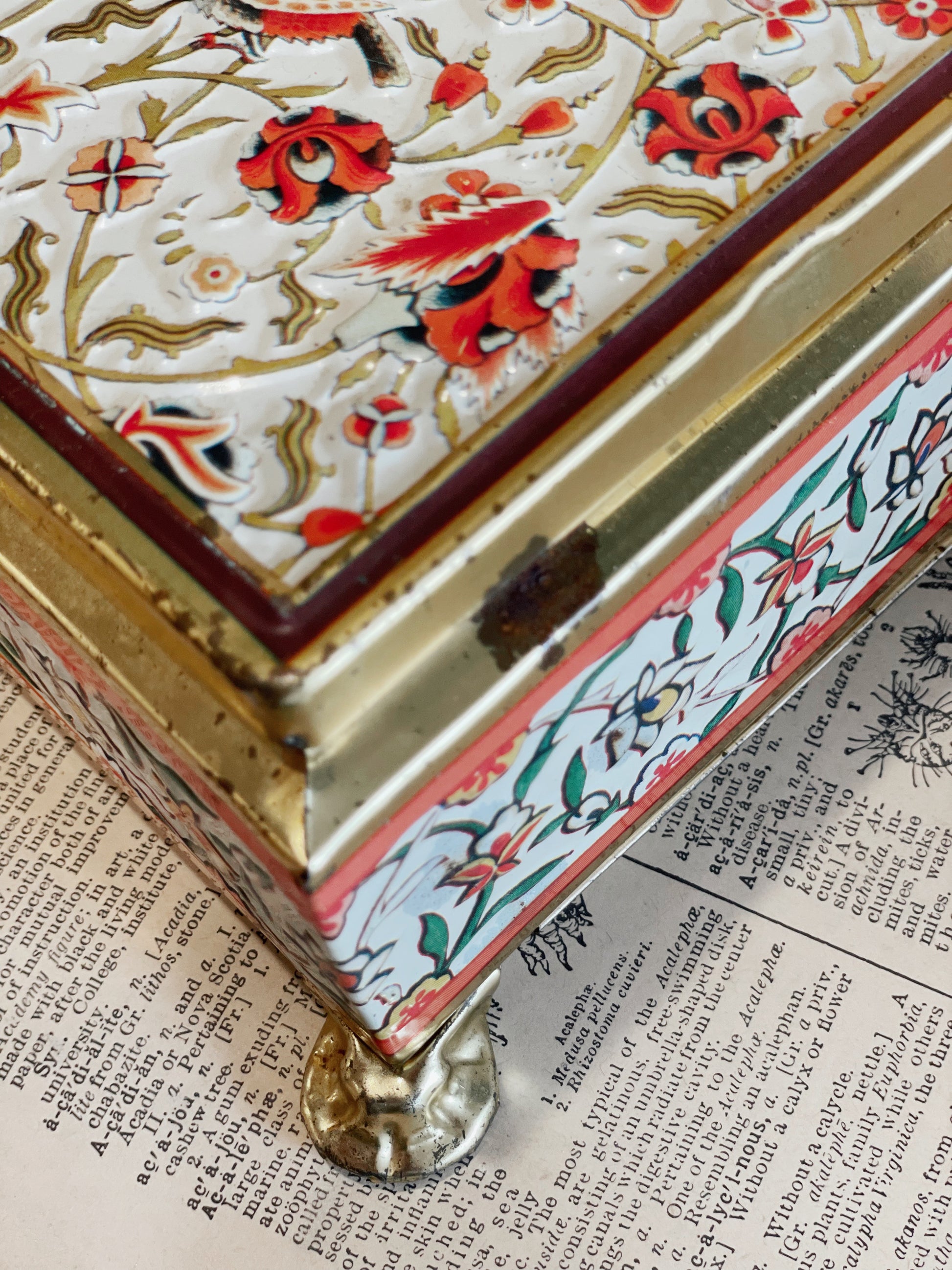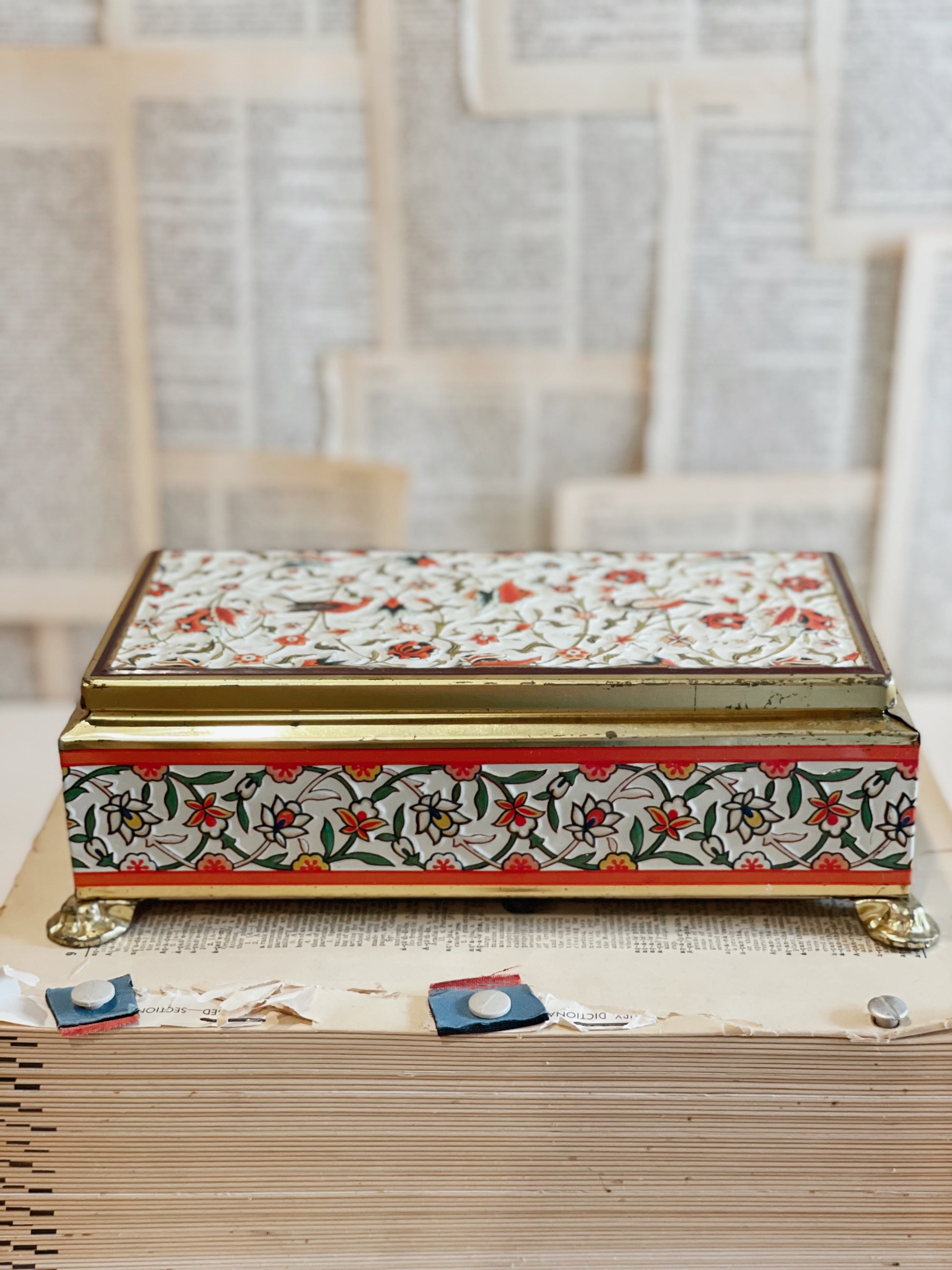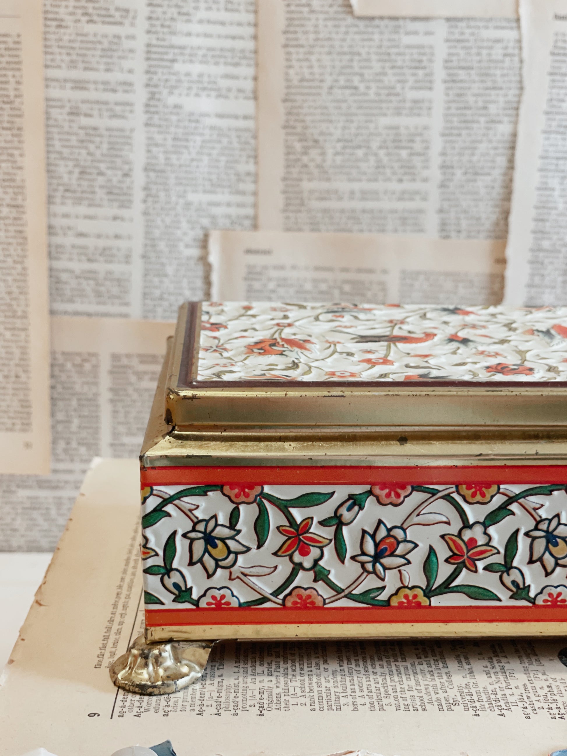 This rectangular tin is beautiful in all its vibrant colors and textured tin. The little feet that it stands on elevate it’s elegance. This piece is old and has a lovely patina, there are some small rust spots (see photos), but it’s full of char. Interior is clean, this piece is made in West Germany.