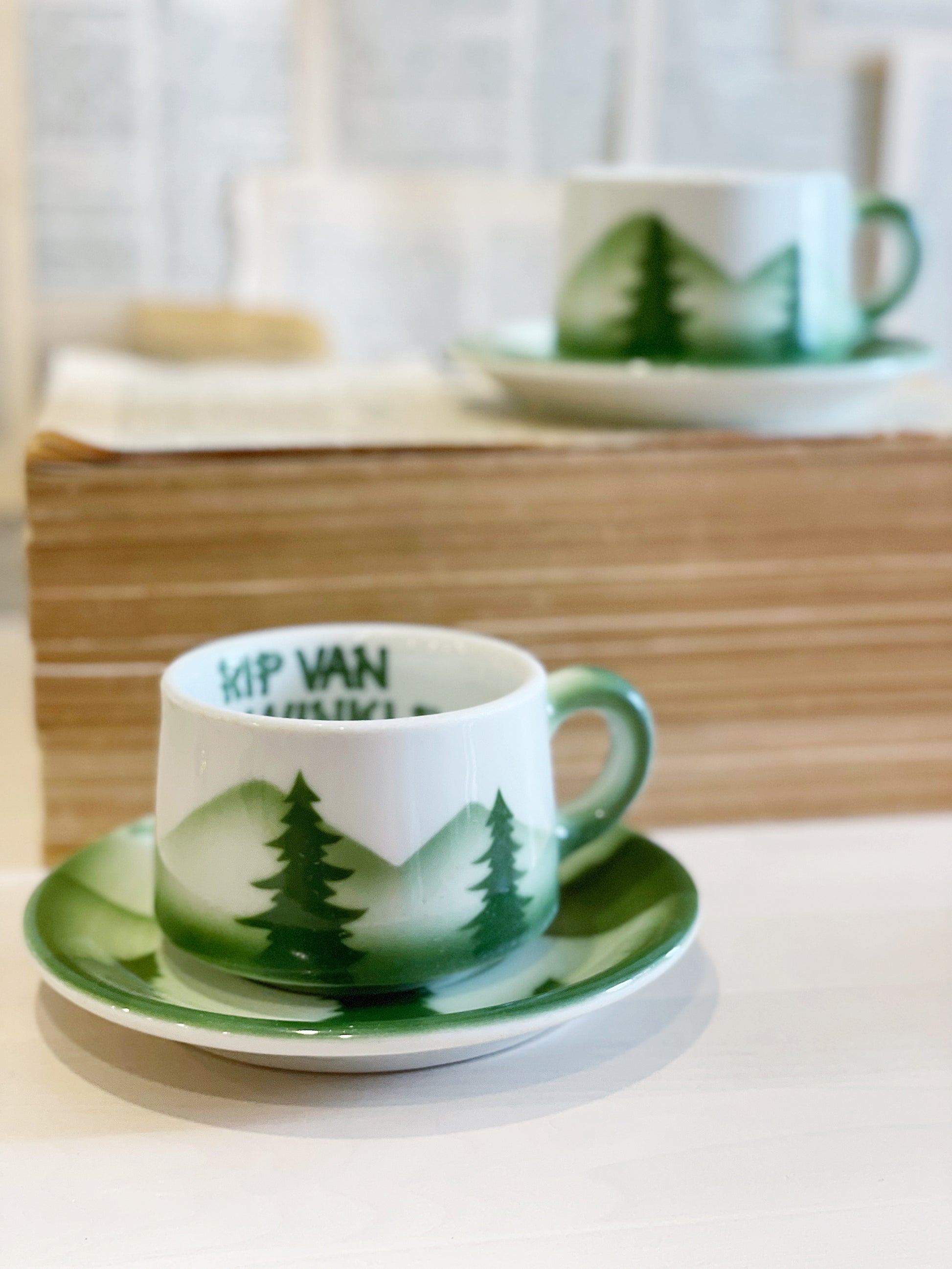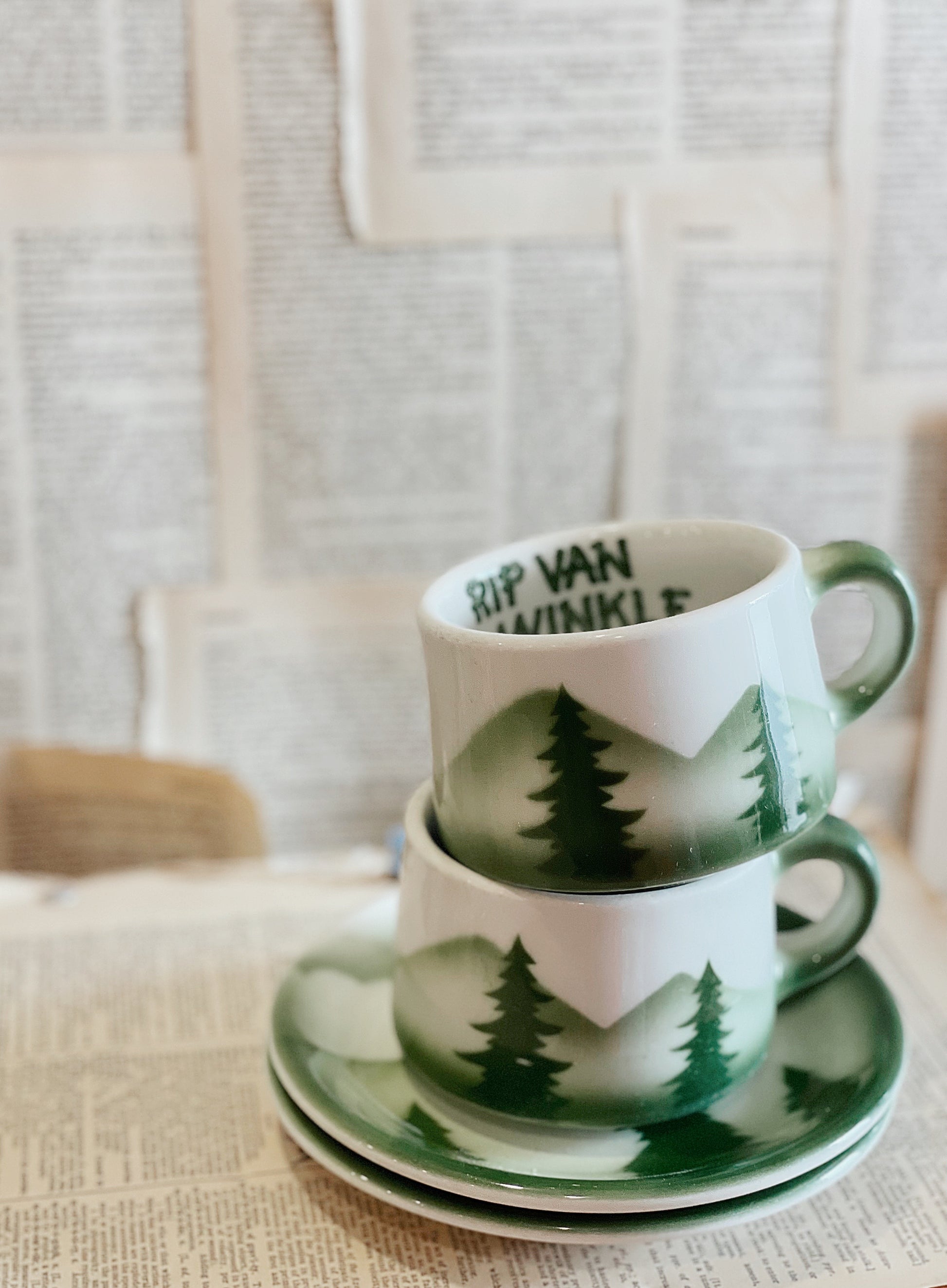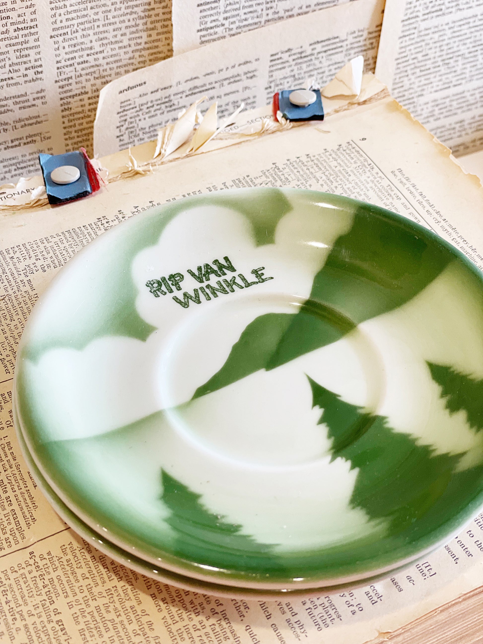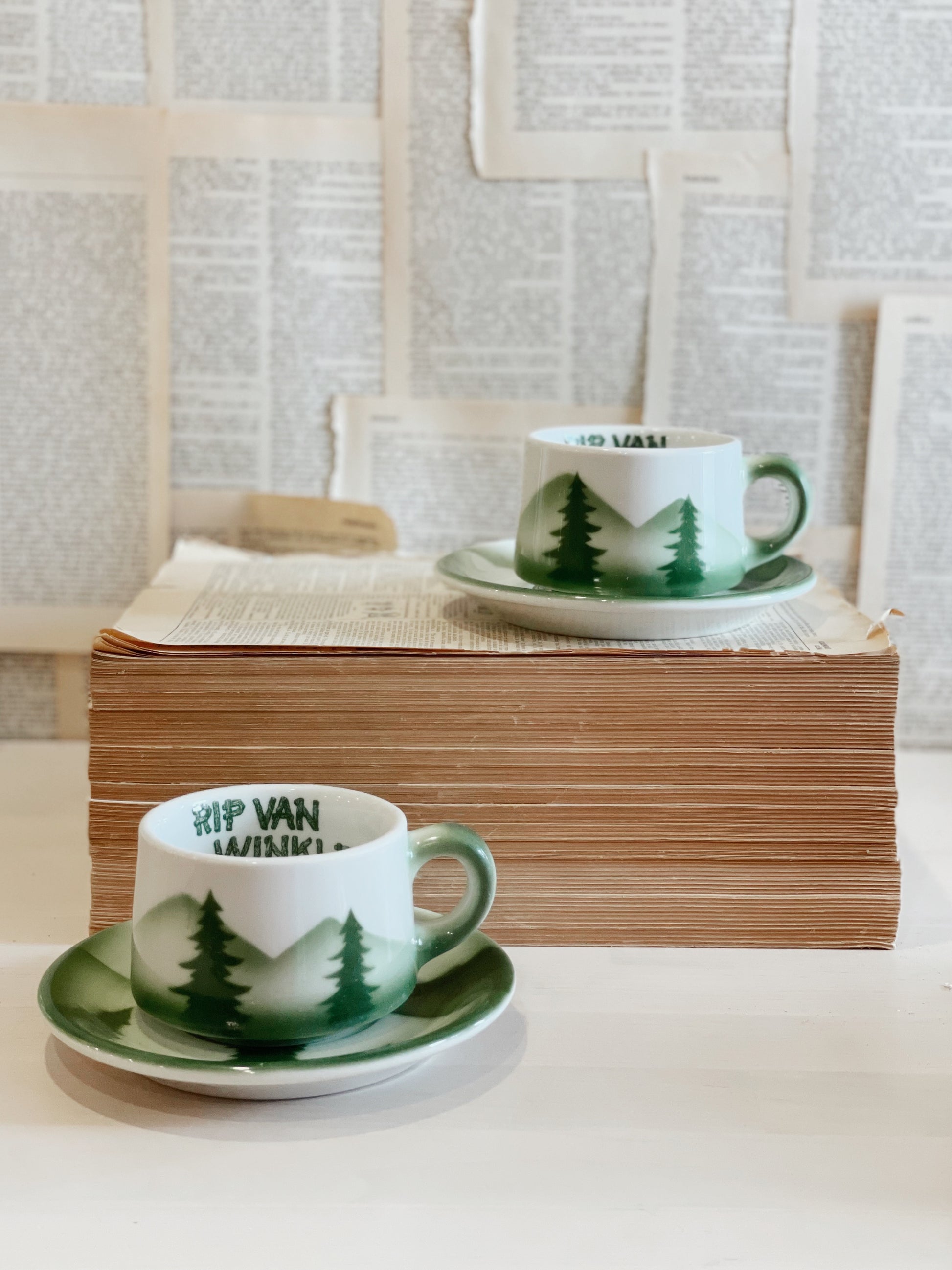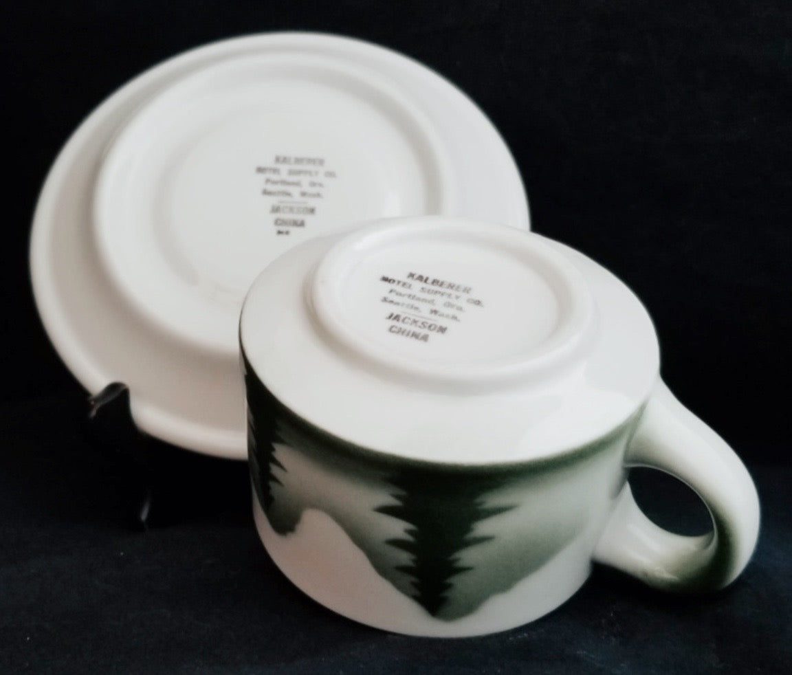 This listing is for 1 vintage cup and saucer. This cup and saucer is so cool! Adorned with green forest paintings indicative of the Pacific North West. Inside the cup and on the saucer is the name Rip Van Winkle. And the bottom signature indicates they are made by Kalberer Motel Supply Co. Jackson China. 2 sets are available for individual sale.