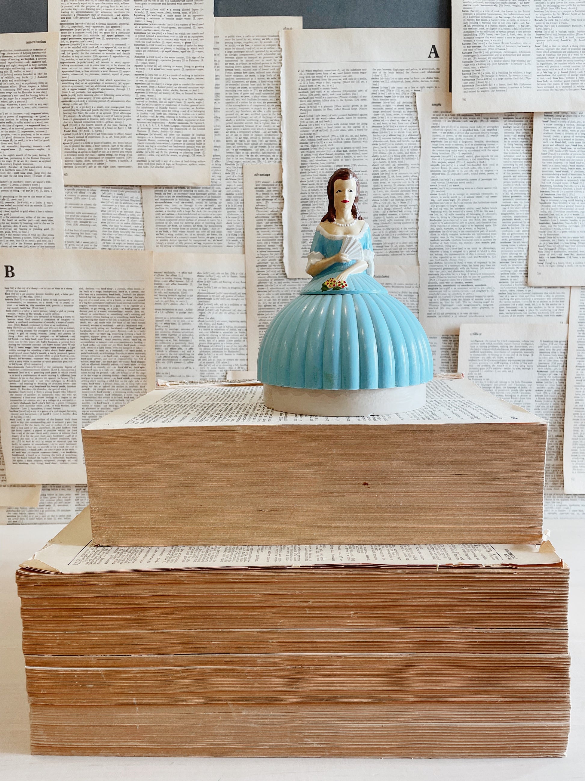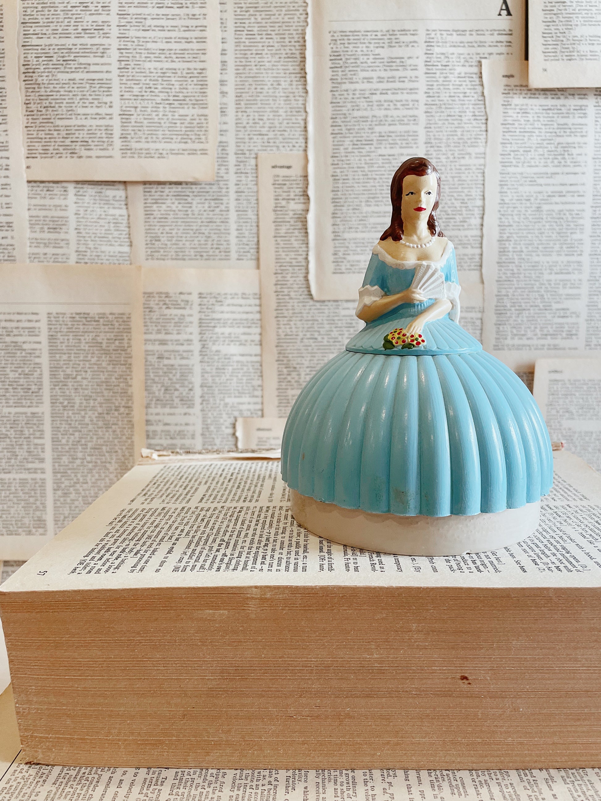This little doll looks like just that at first sight, but upon further inspection you’ll find that her dress is housing to sewing spool storage. This vintage piece is so adorable, it’s hand painted and made of plastic. The bottom storage price fits securely into the bottom of the dress making it easy to pick up and move around as needed. This is a wonderful vintage piece with beauty and utility!