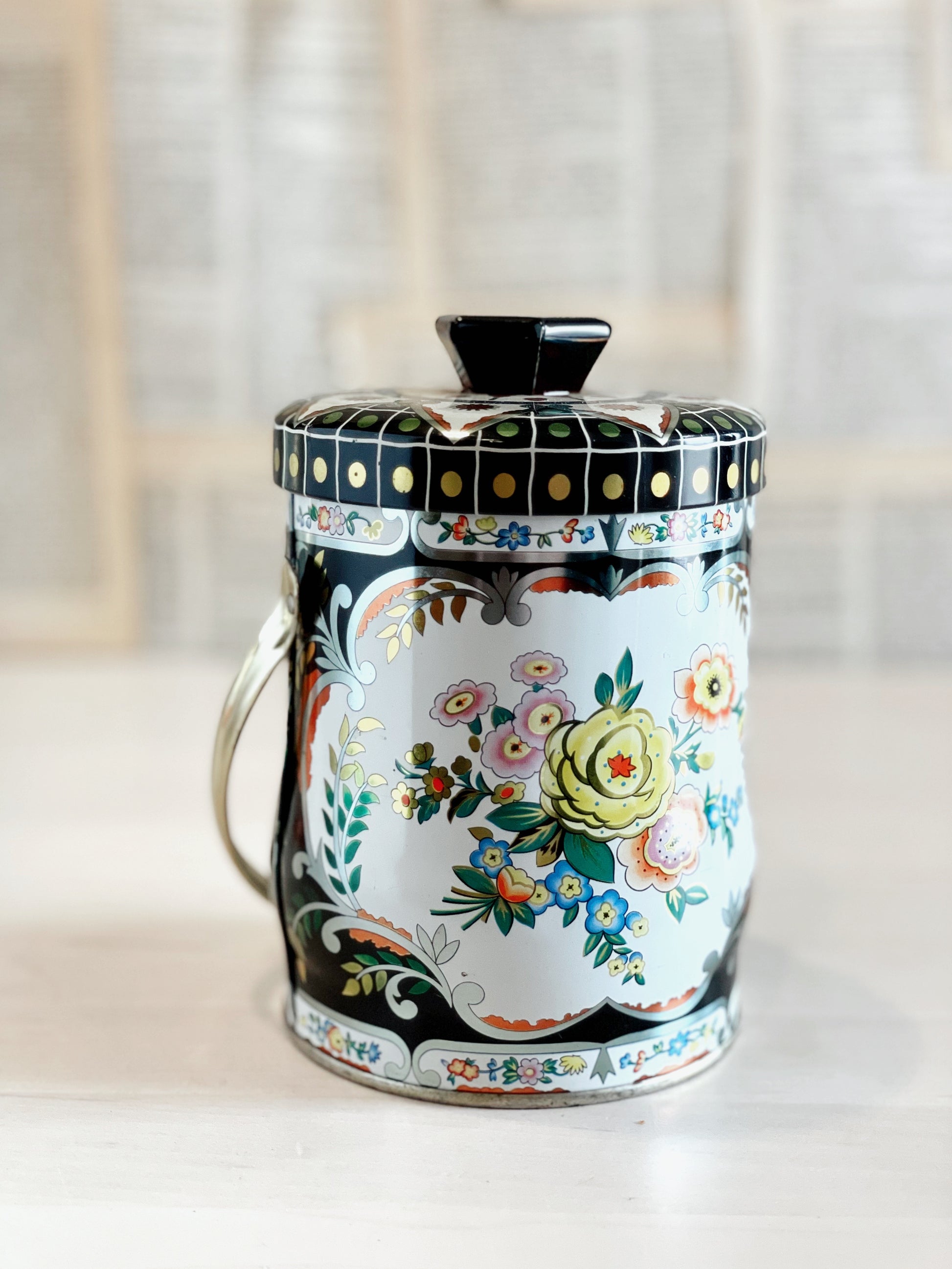 This cylindrical tin is equipped with a handle and adorable knob on its lid. This piece is very clean and the colors are vibrant and bright. Great price for storing tacks, paper clips, etc. Made in England