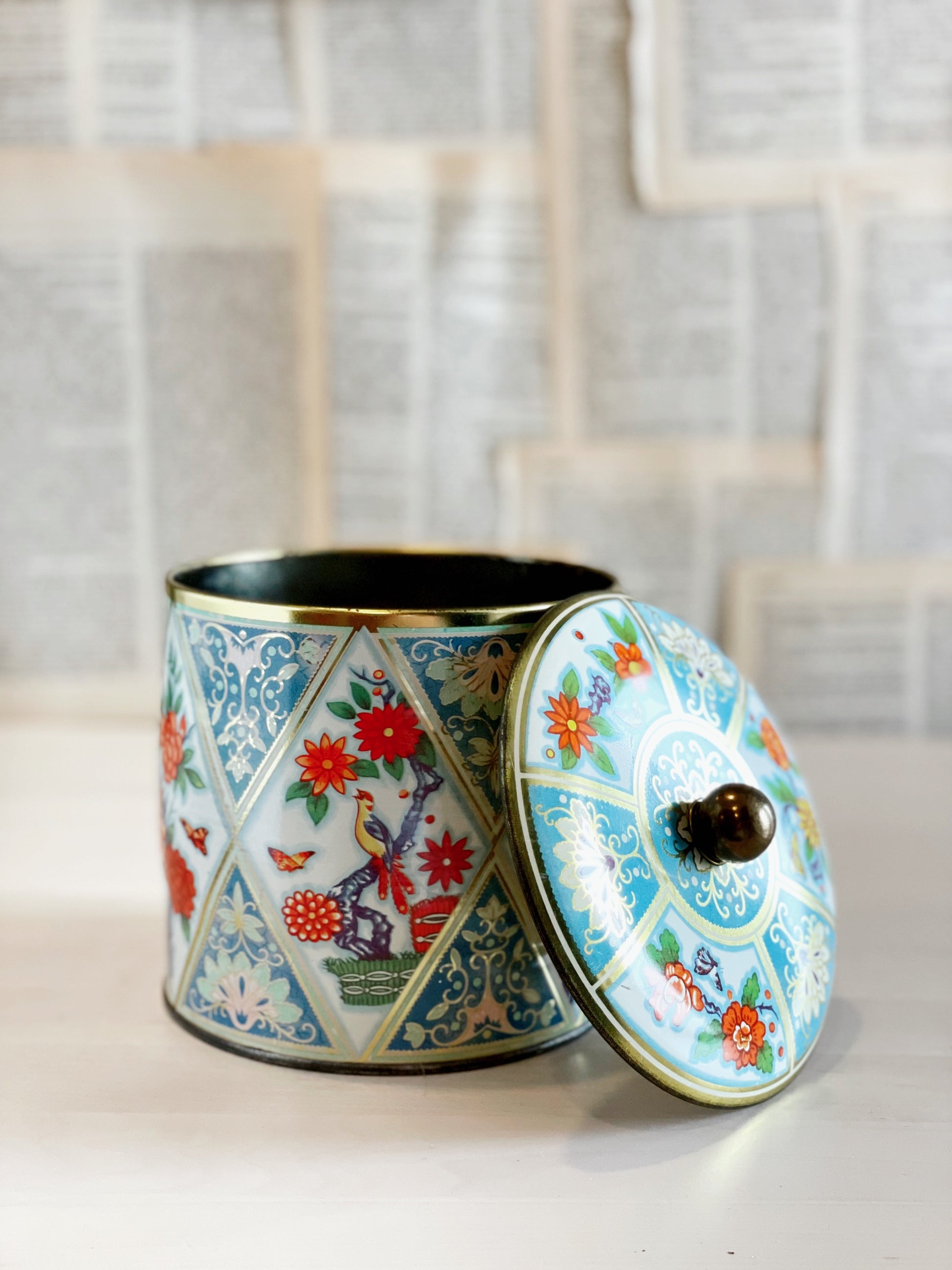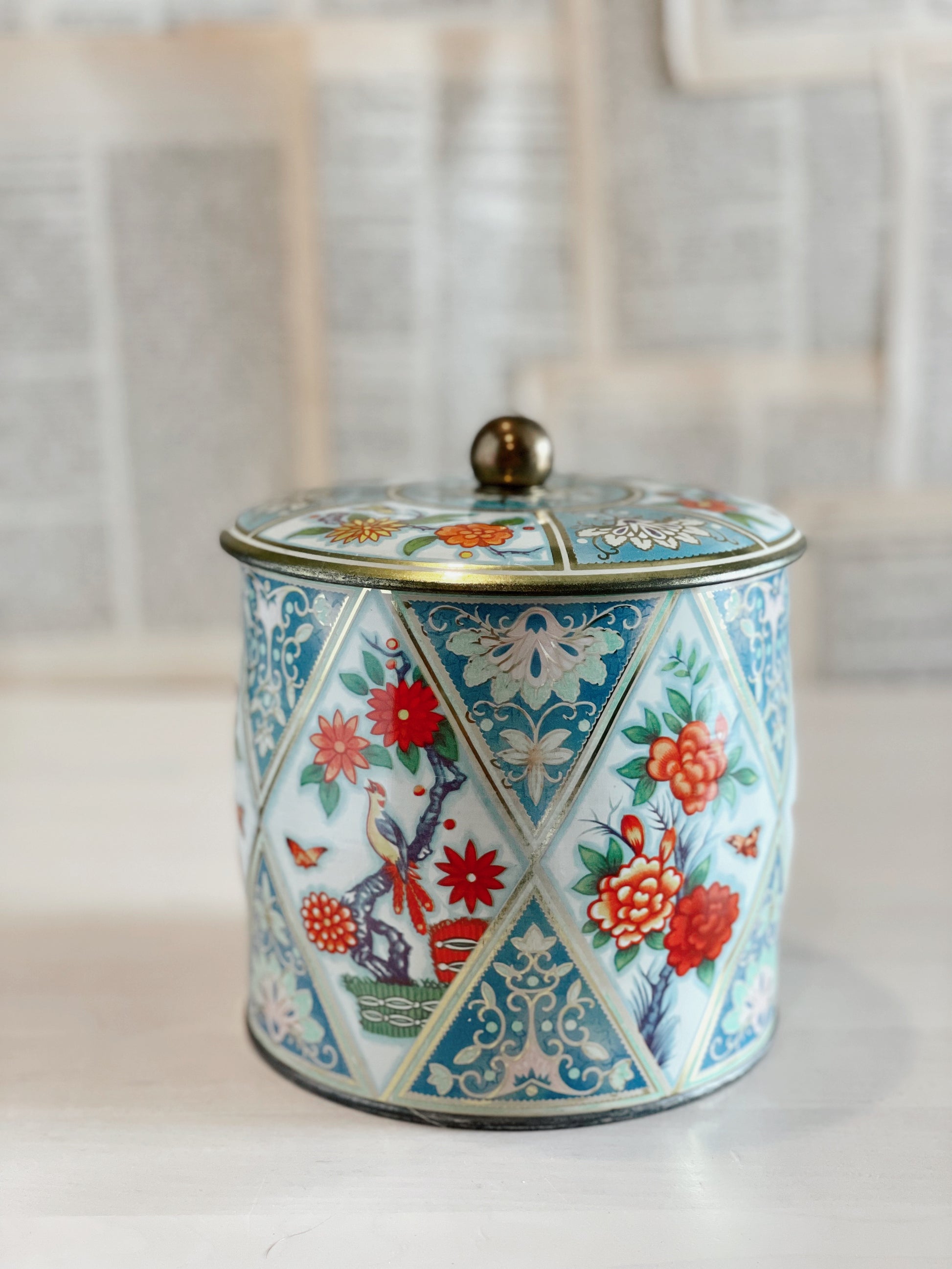 This beautiful cylindrical tin has the most gorgeous colors and is adorned with beautiful designs. Colors are bright and vibrant, inside is clean. This is a great container for desk clutter! Made in England