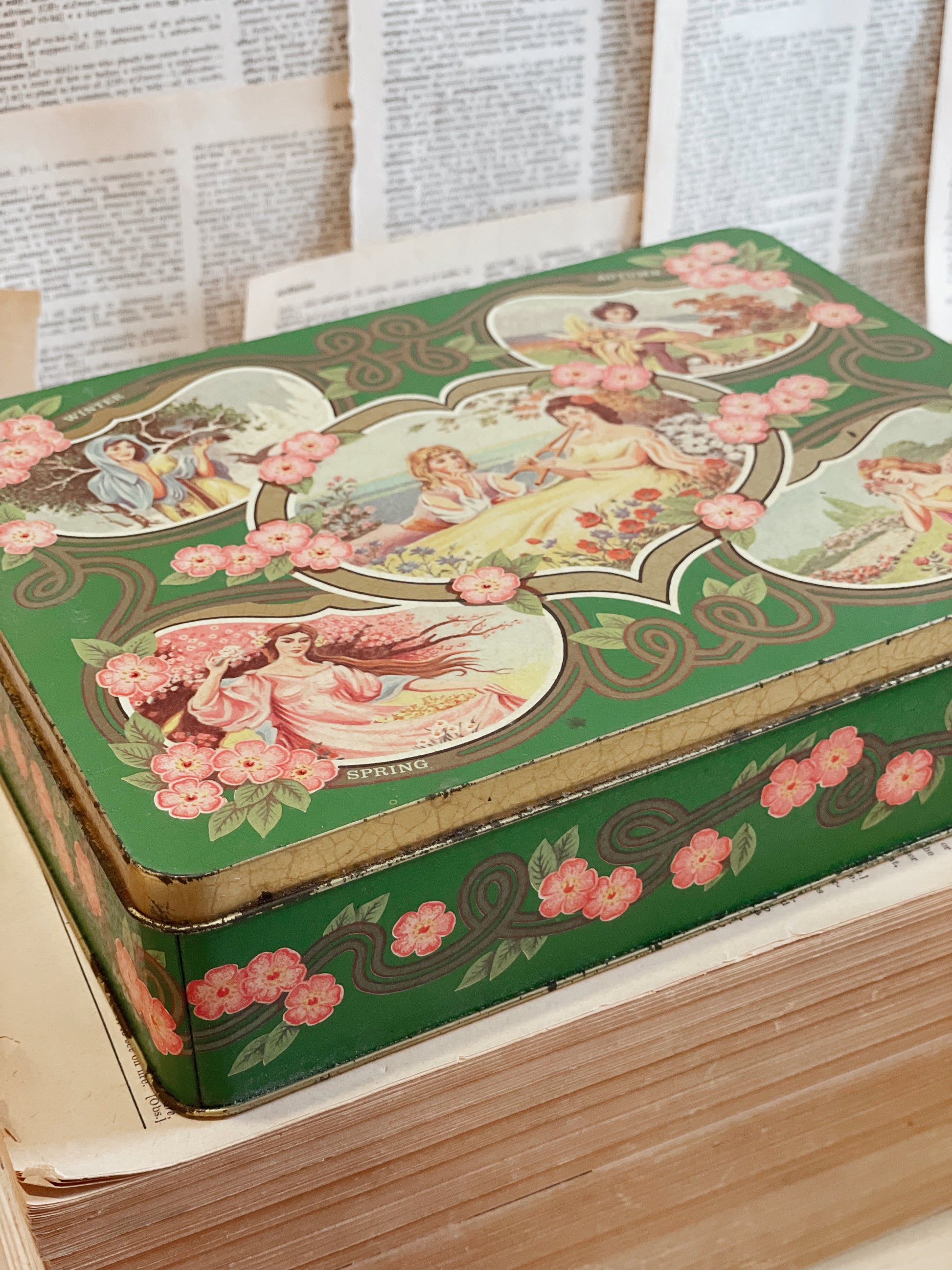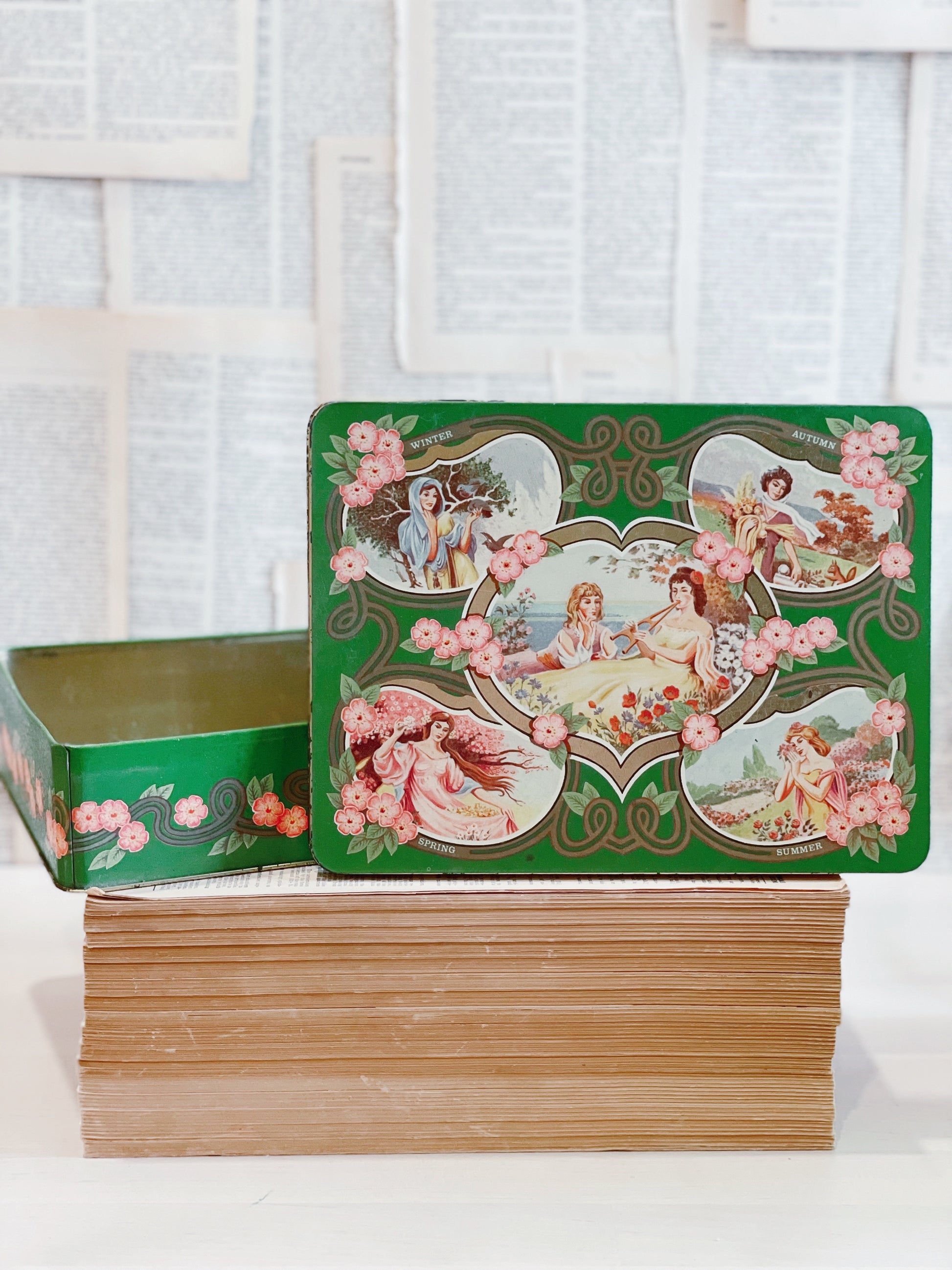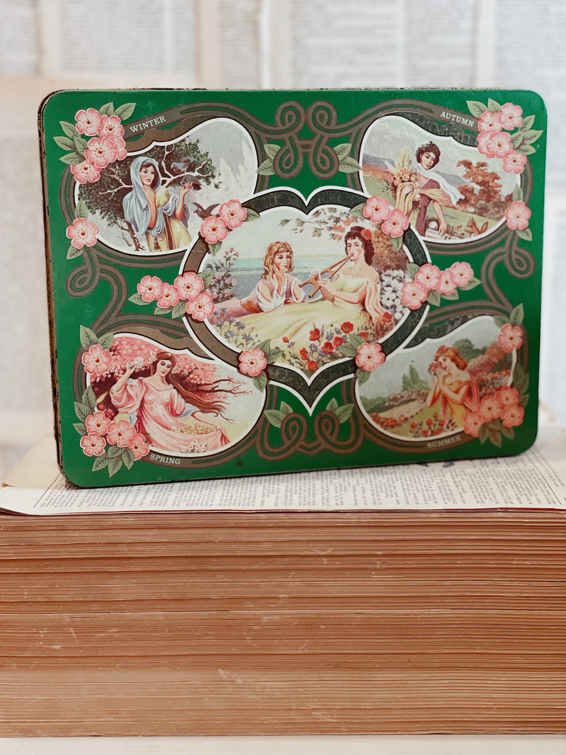 This vintage tin has a unique lid that features beautiful women in the four seasons. The painting is lovely and the colors are deep and vibrant. The inside of this tin is clean. There is some light rusting but overall in very nice vintage condition with a beautiful patina. Made in England