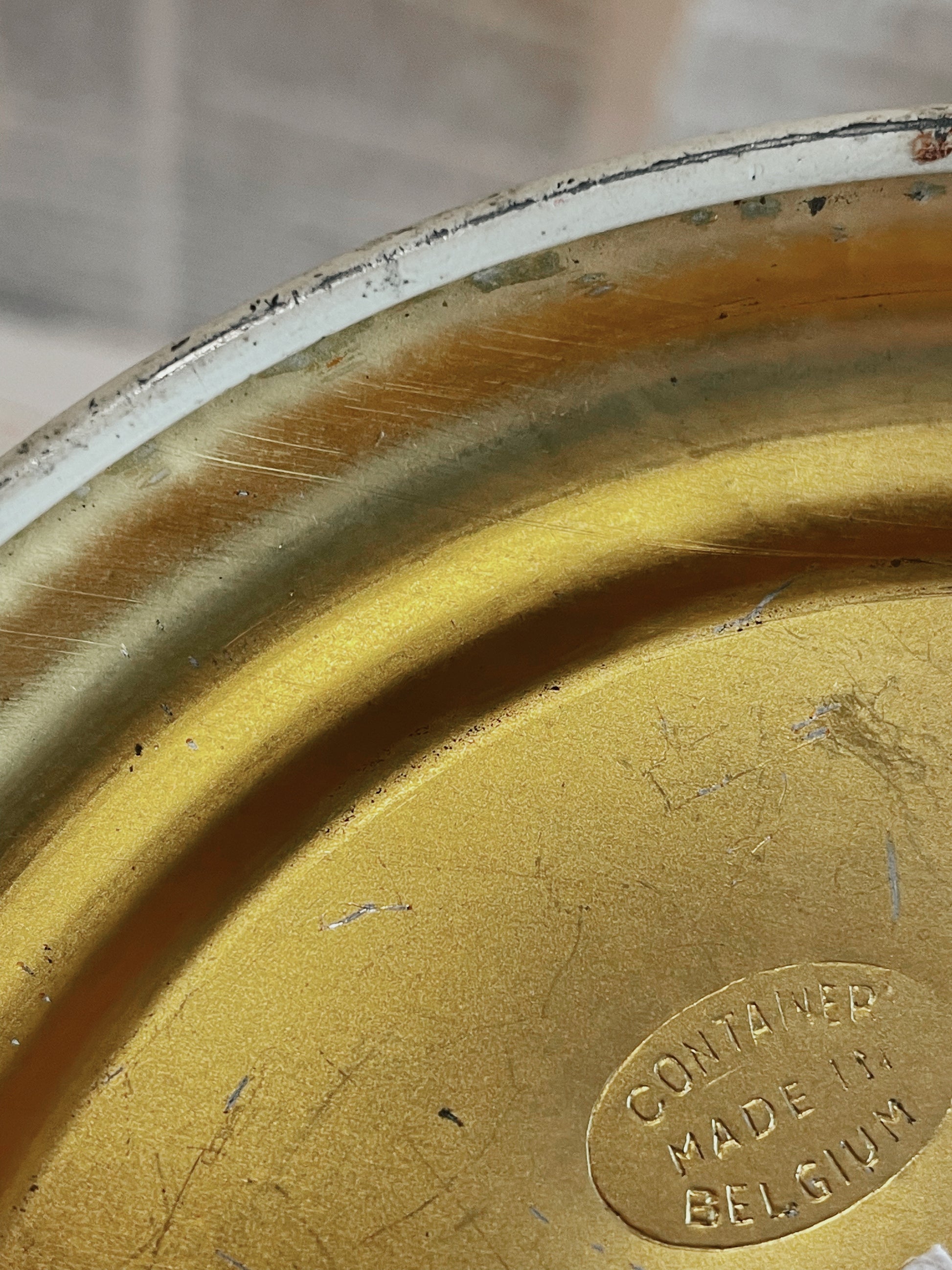 This vintage tin is especially beautiful in shape and form. The light blue accented with vibrant flowers and ornate design is just stunning. This piece has a live let vintage patina and is clean inside. Perfect for storage on a desk, nightstand, or vanity. Made in Belgium