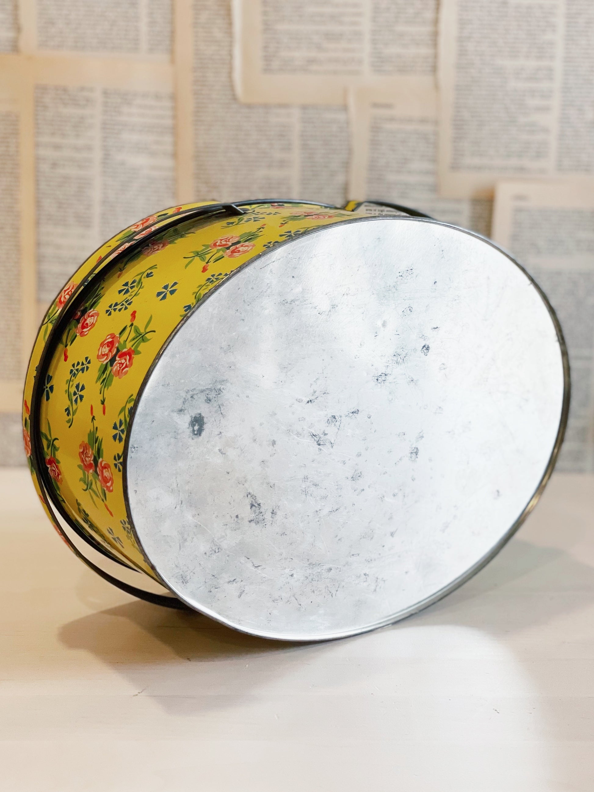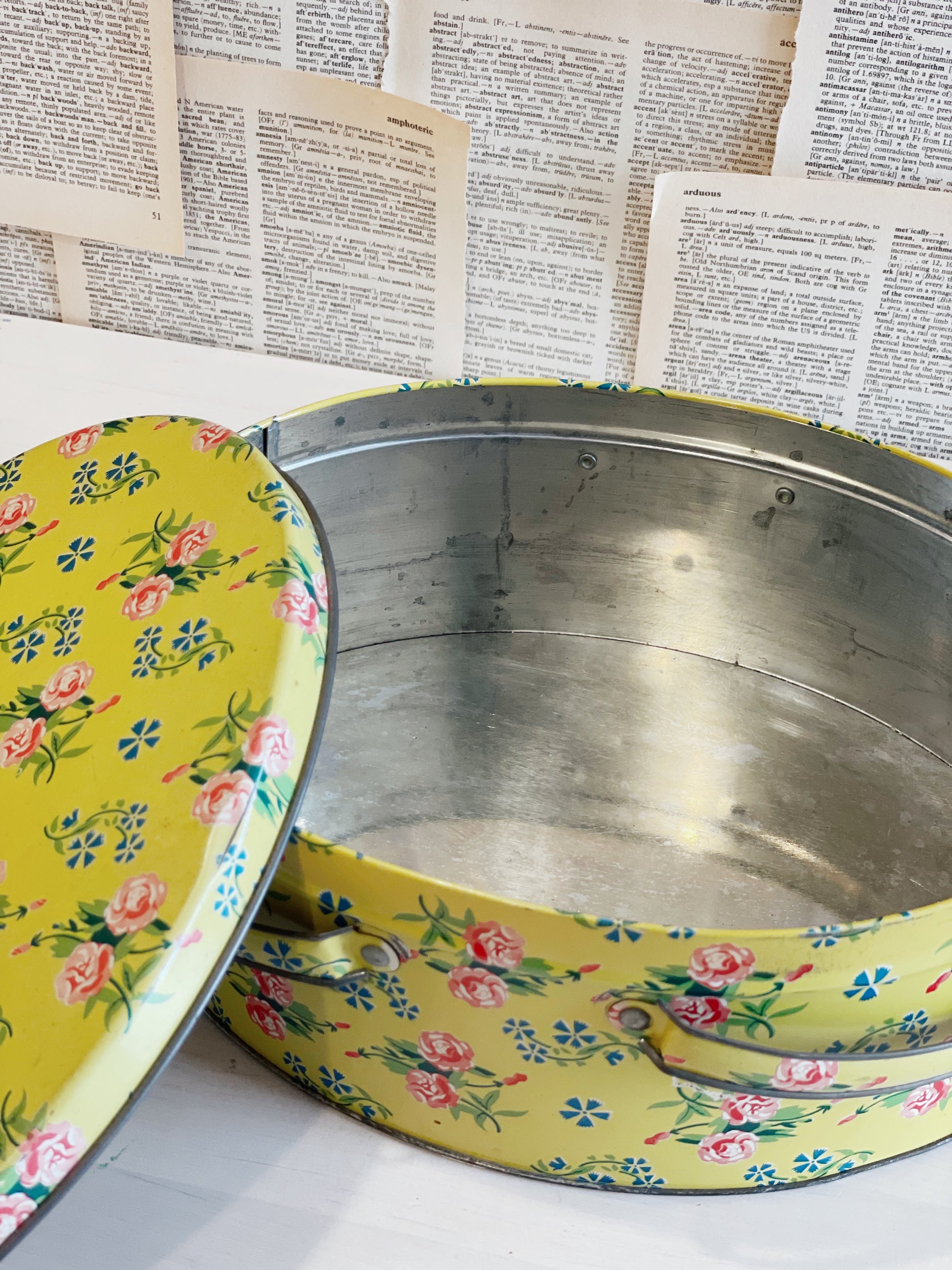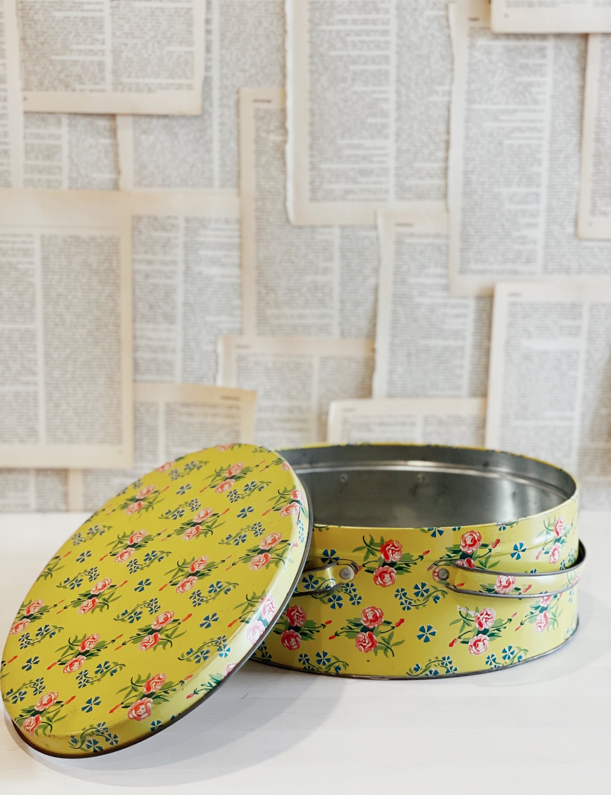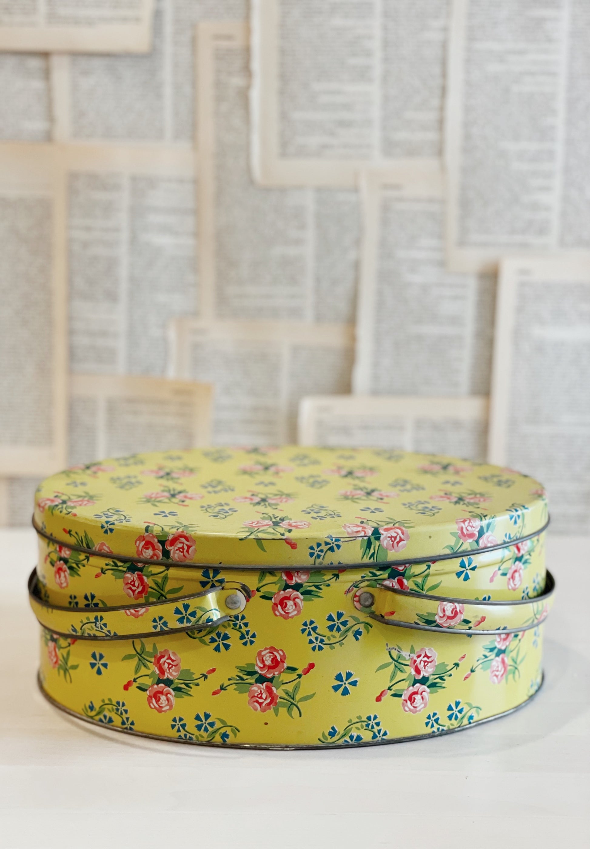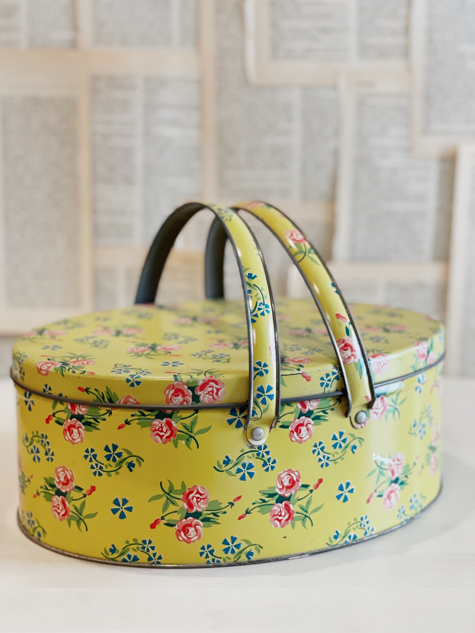 This vintage tin has the cutest print and is in such a fun shade of yellow. This would be perfect for your lunch on the go, craft storage, or just adorable home decor! Condition is great, no dents or scratches, no rust, inside clean!
