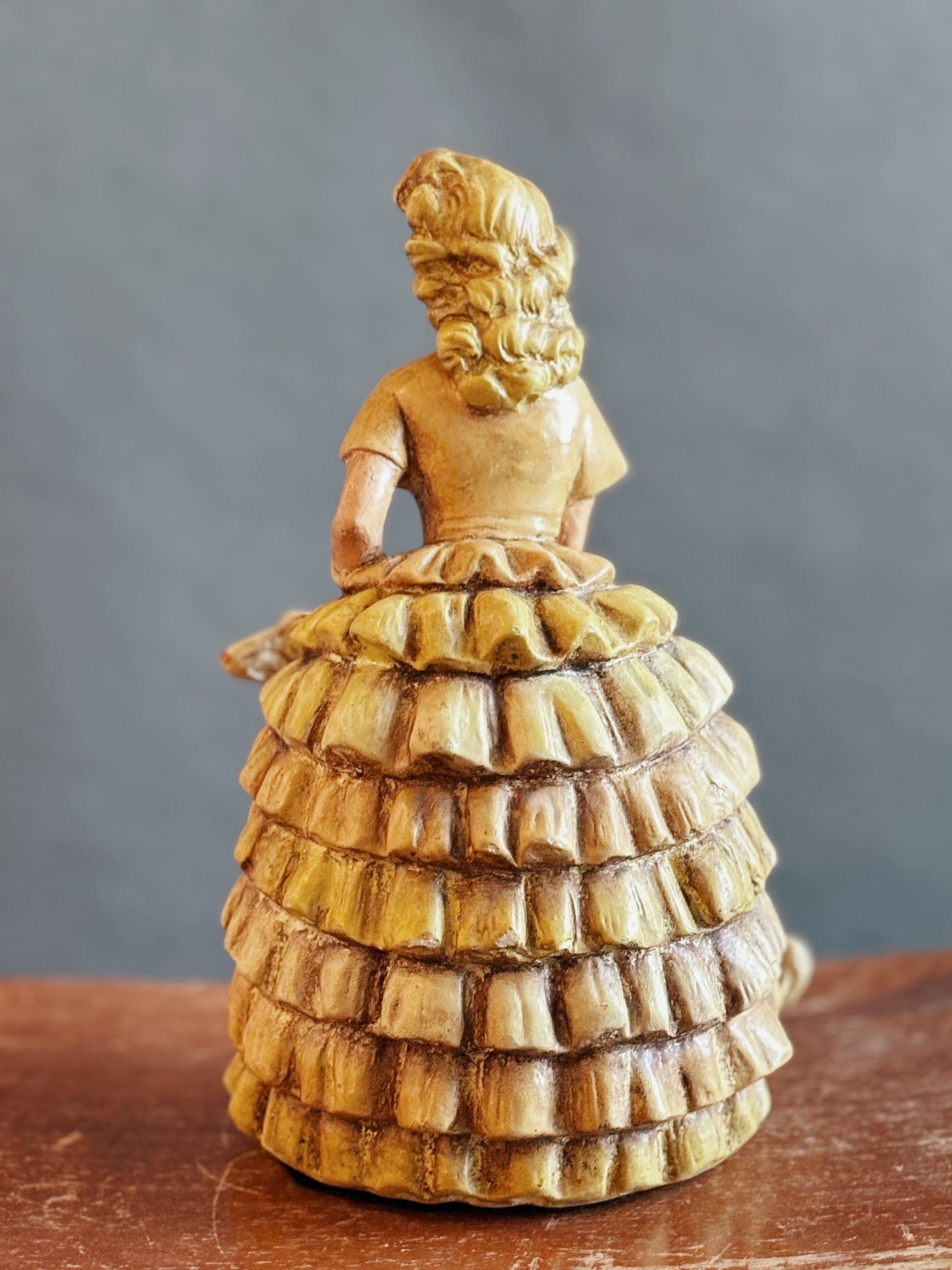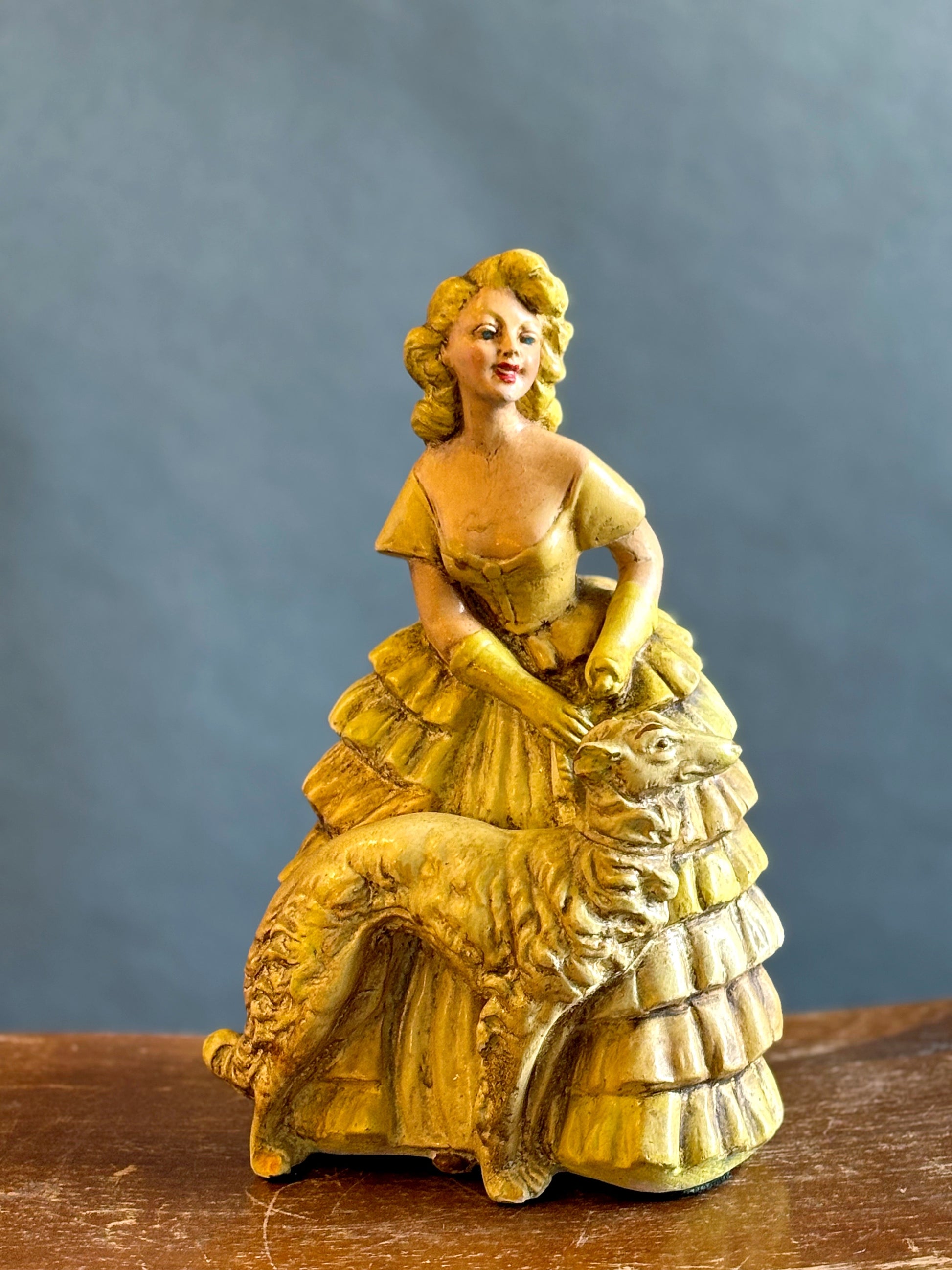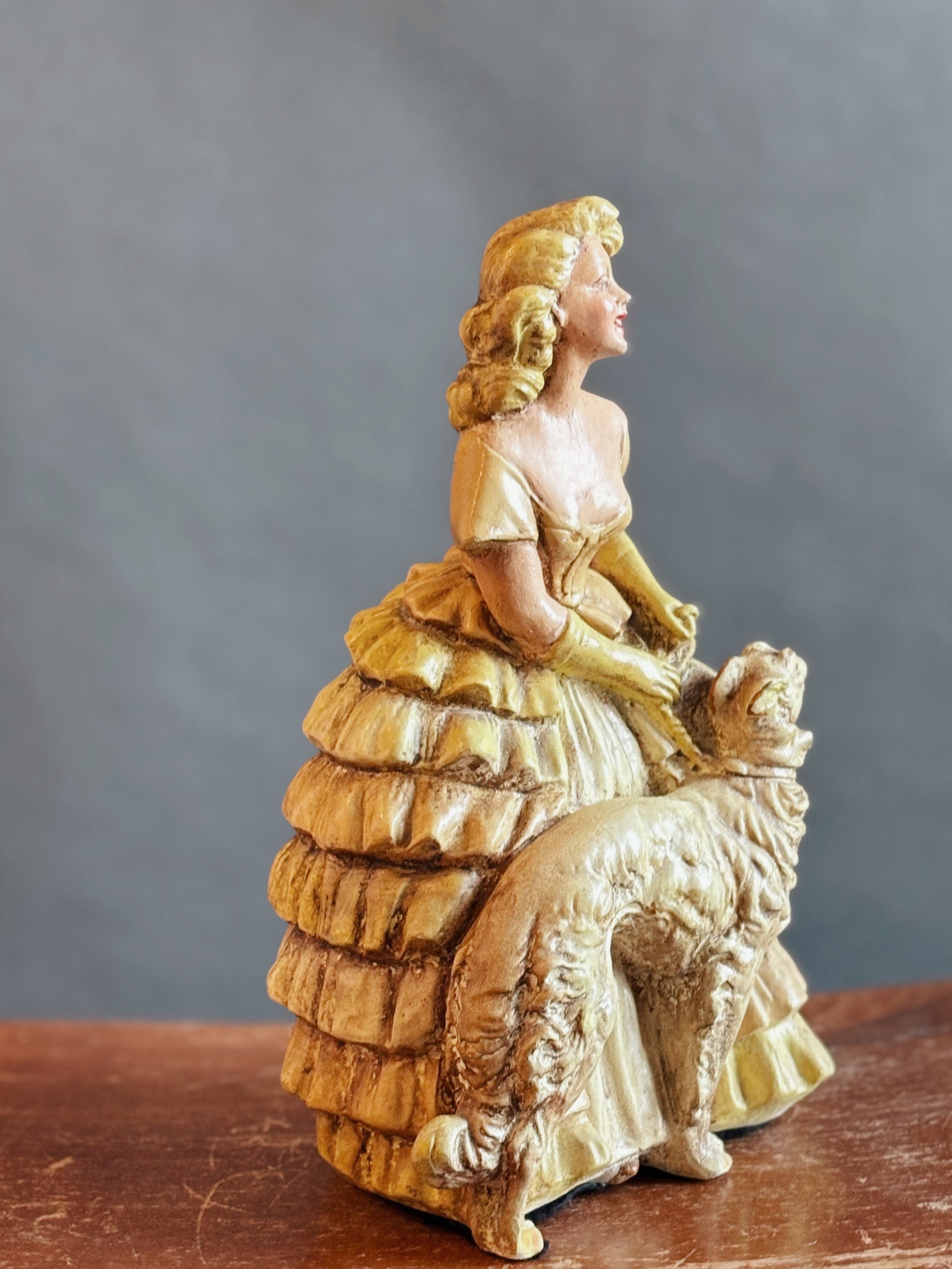 This statue of a woman and her dog has so much beautiful movement and texture in the dress. This is a striking, eye catching piece of vintage decor.