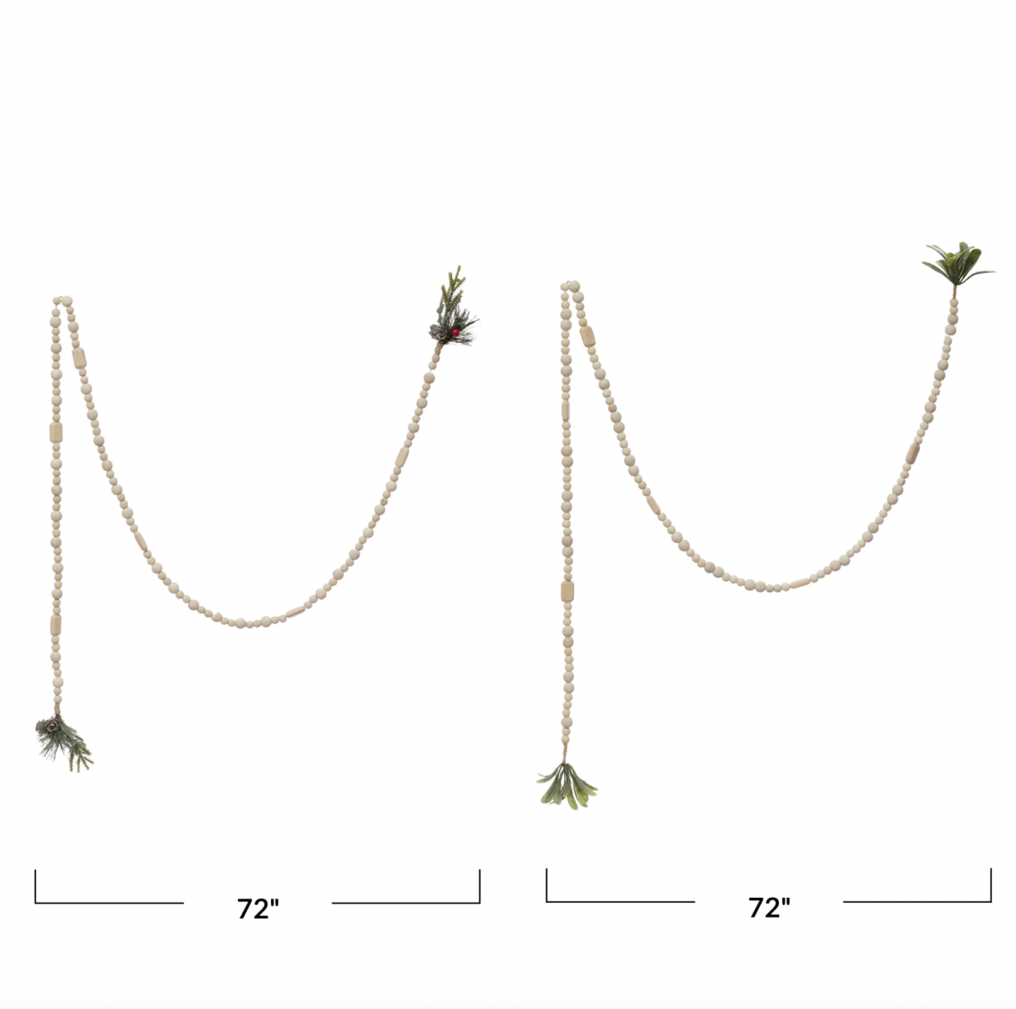 72"L Paulownia Wood Bead Garland w/ Faux Greenery Tassel, 2 Styles
